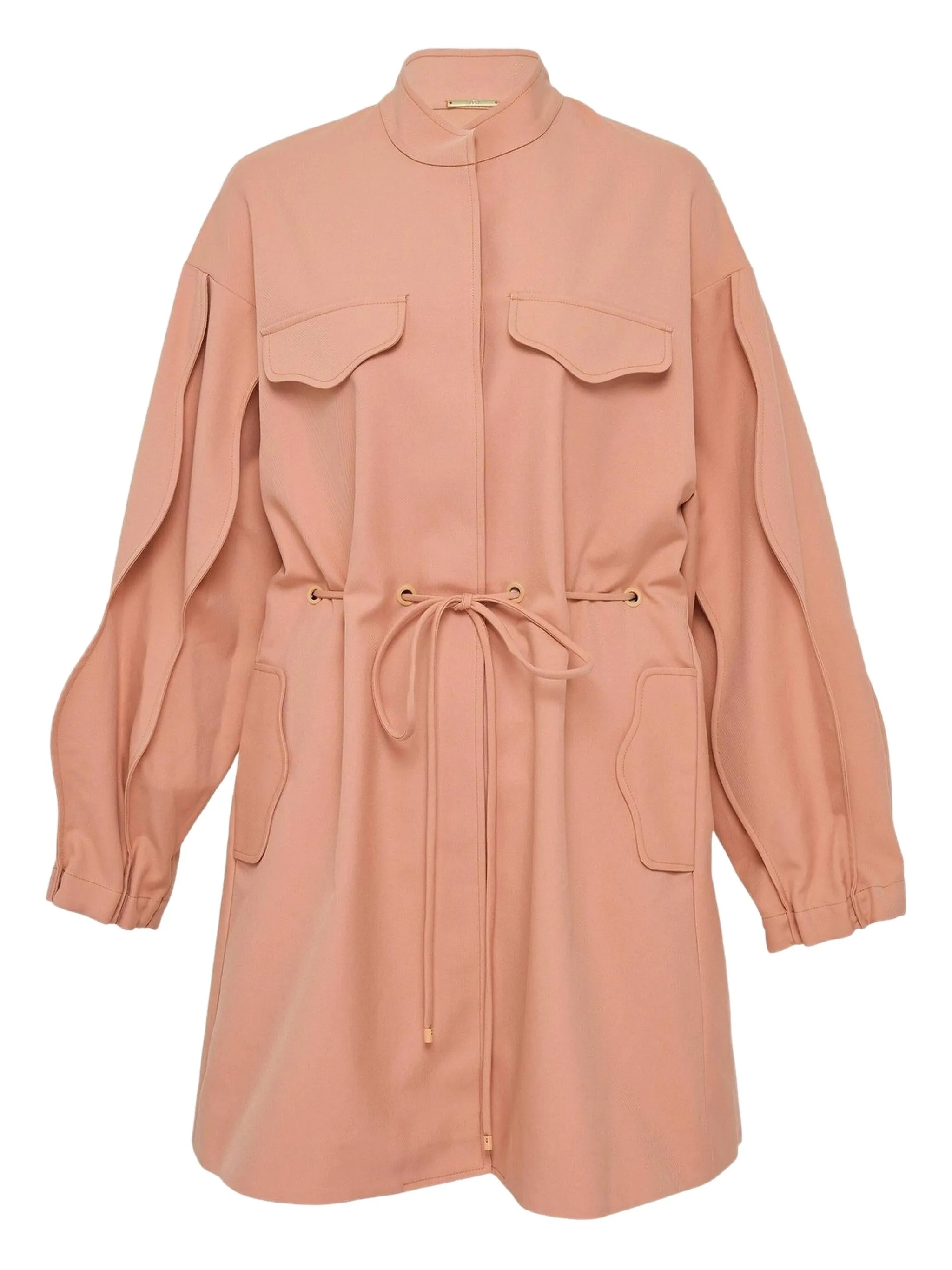Светло-коричневая завязка спереди, карманы с клапанами, длинные рукава, манжеты на пуговицах