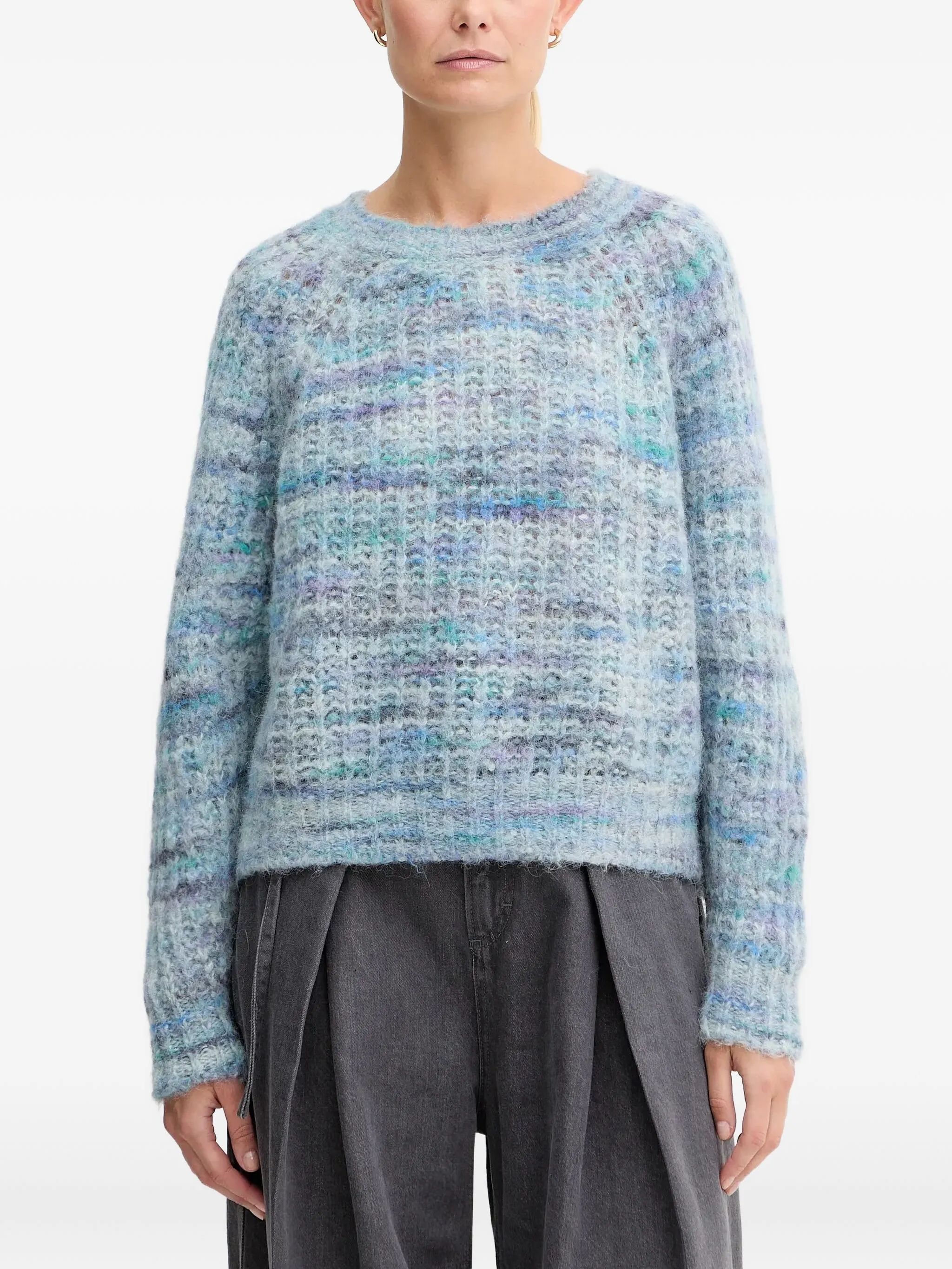 Светло-голубой текстурированный трикотаж с круглым вырезом и длинными рукавами, ребристый низ и ребристые манжеты