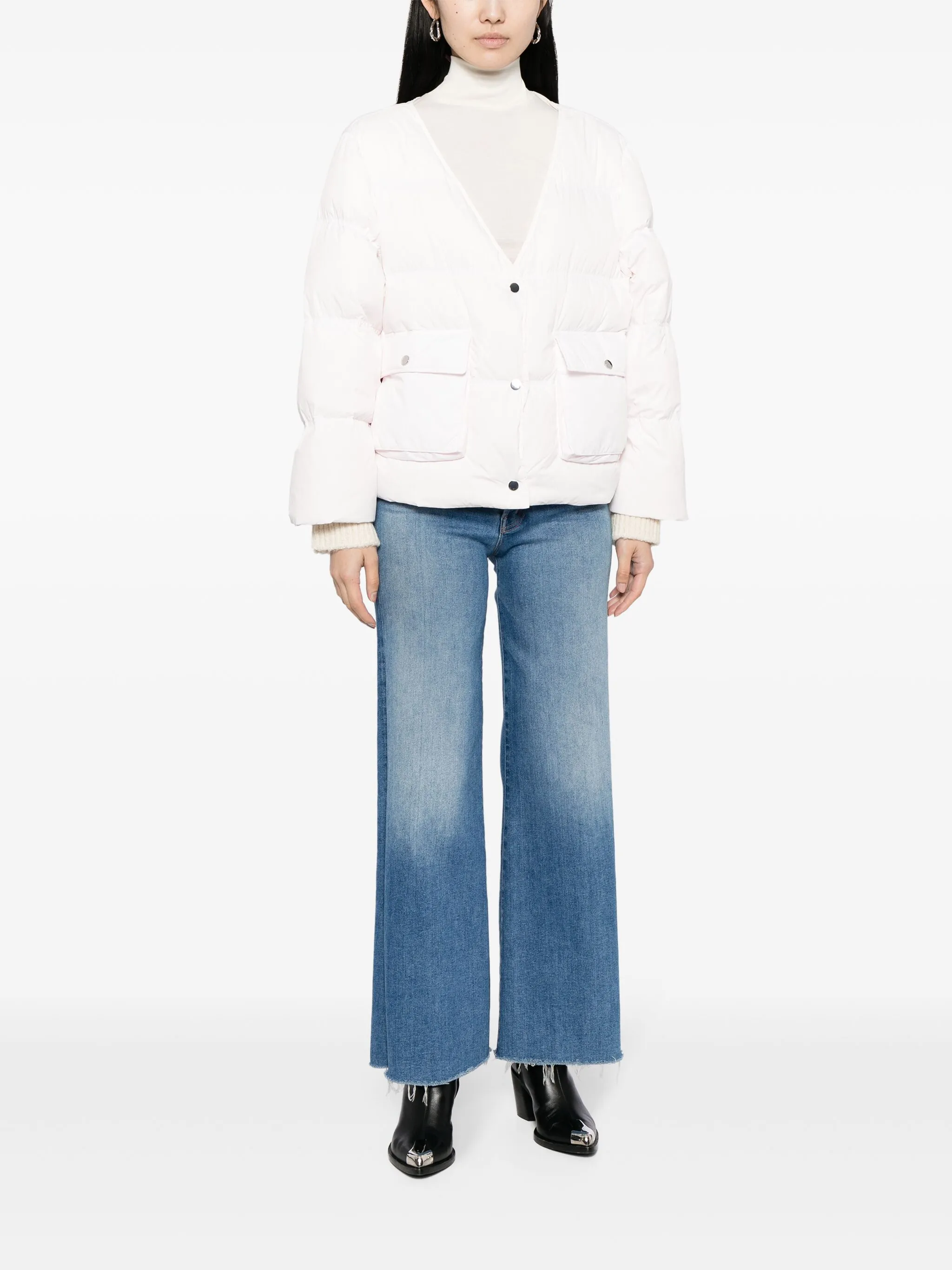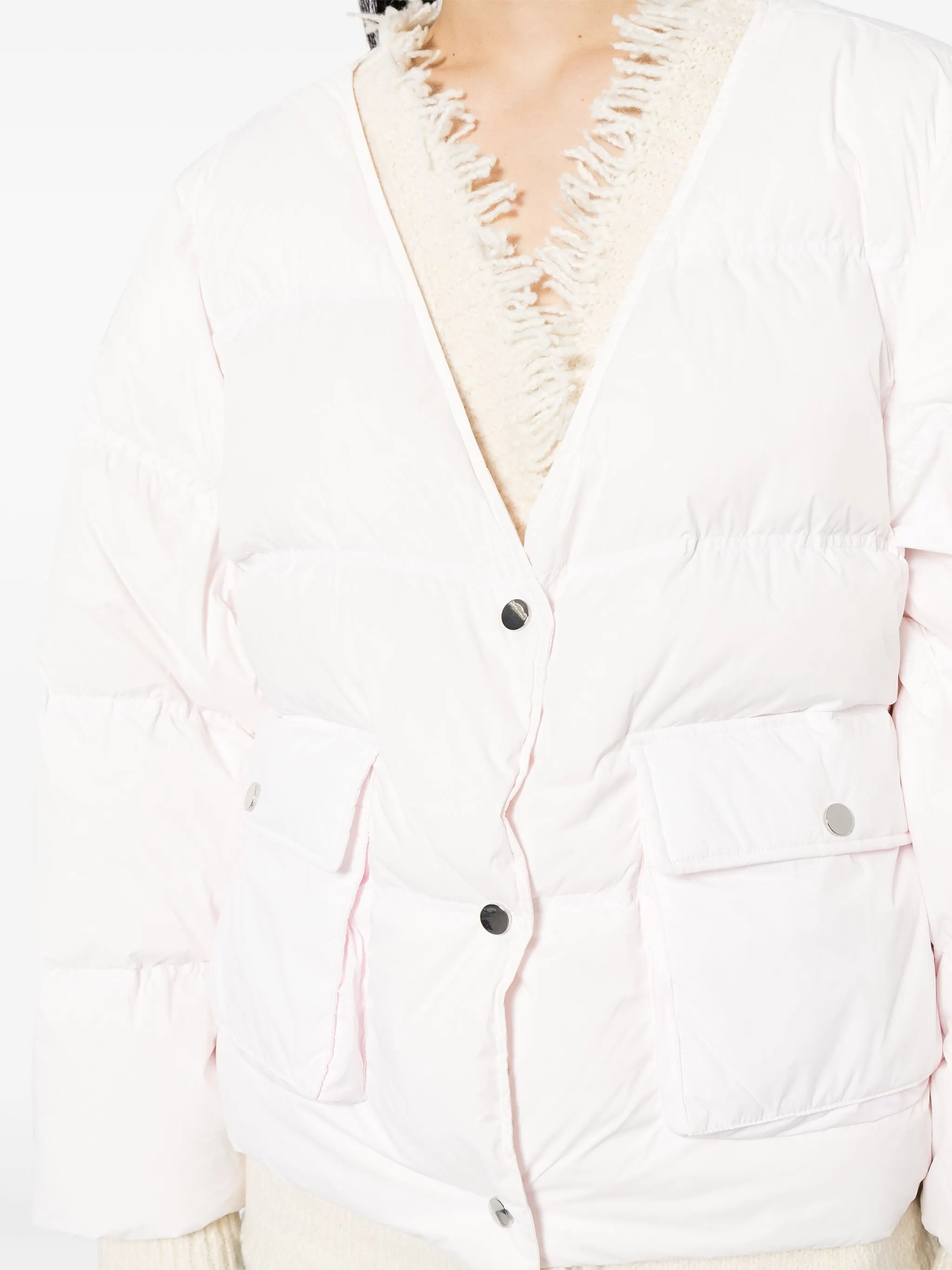Светло-розовый, серовато-белый, смесовая шерсть, утиный пух, многослойный дизайн, необработанные детали, V-образный вырез, застежка на кнопках спереди, длинные рукава и два кармана с клапанами по бокам.
