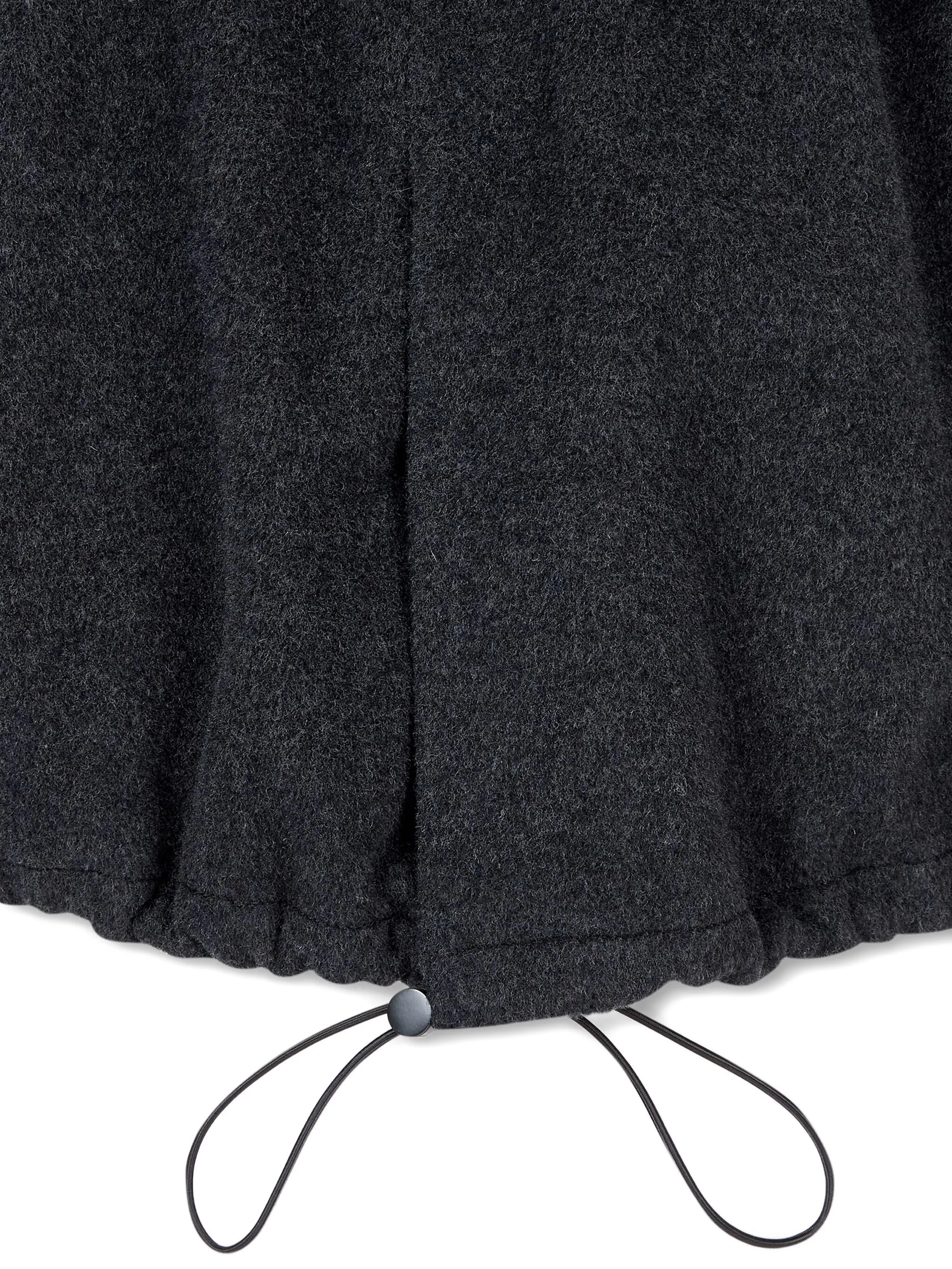 Капюшон цвета древесного угля с завязками, передние карманы с клапанами, застежка на молнию и пуговицу