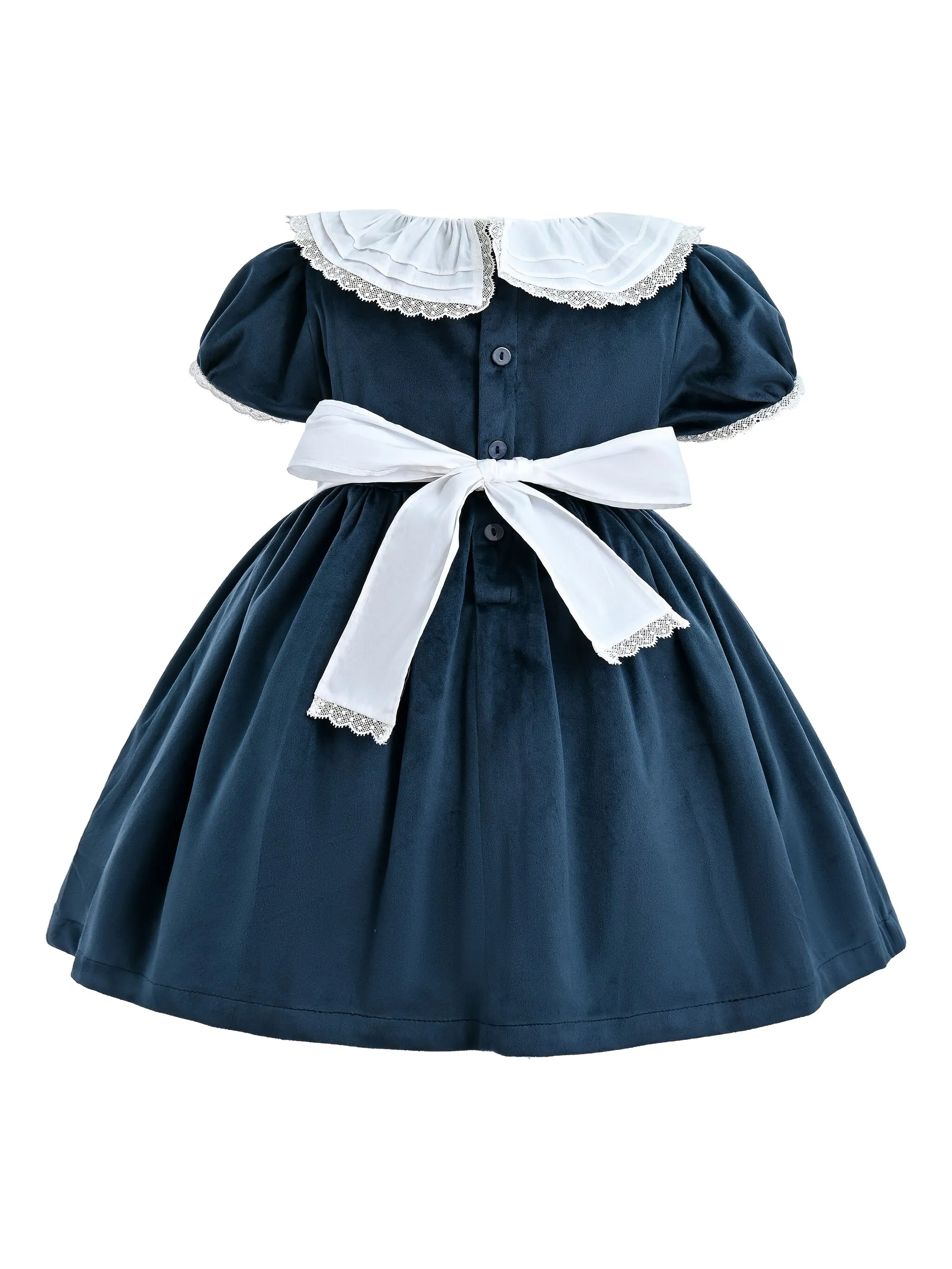 Темно-синяя кружевная отделка, короткие рукава с бантиком, бархатная текстура