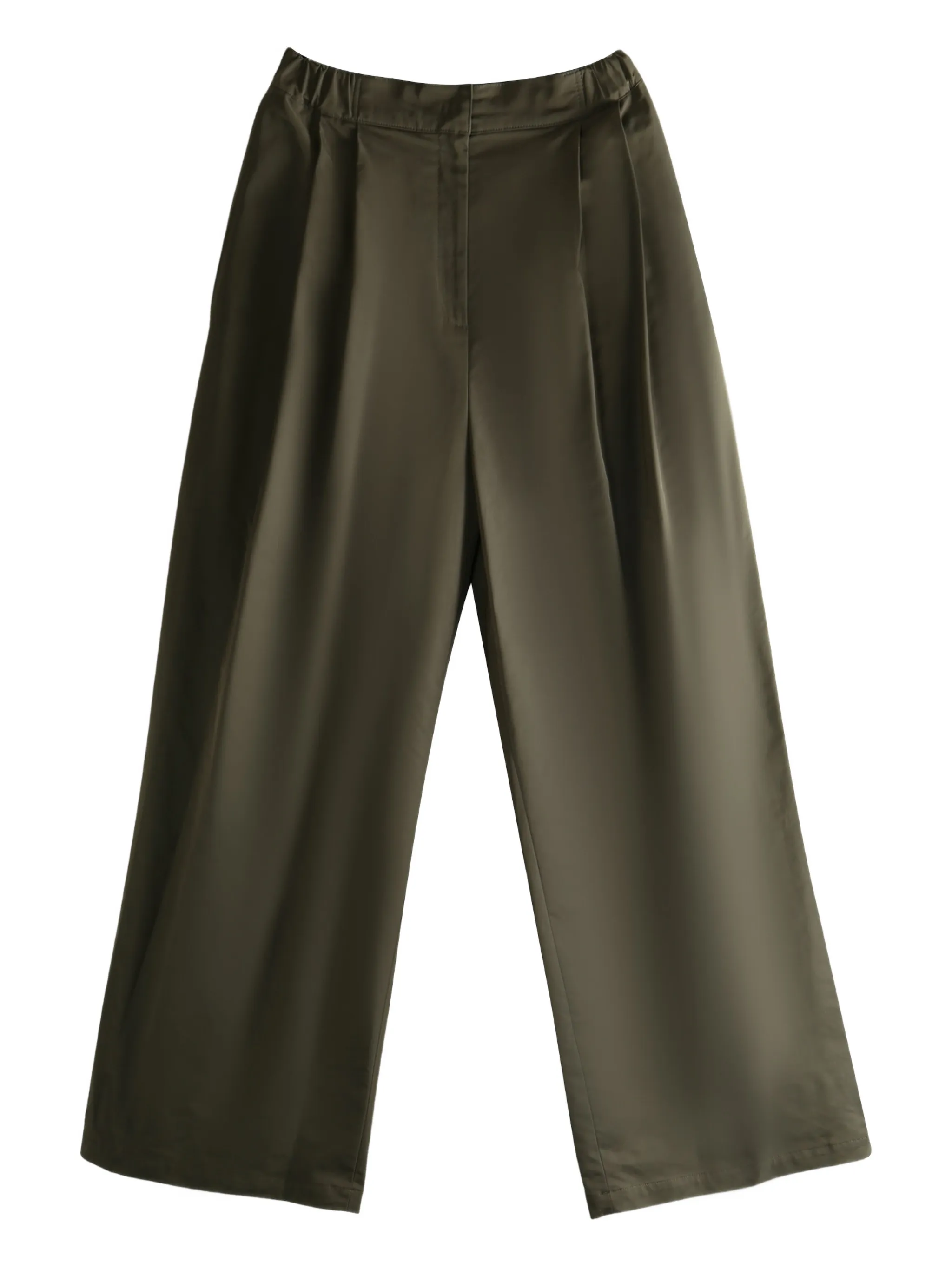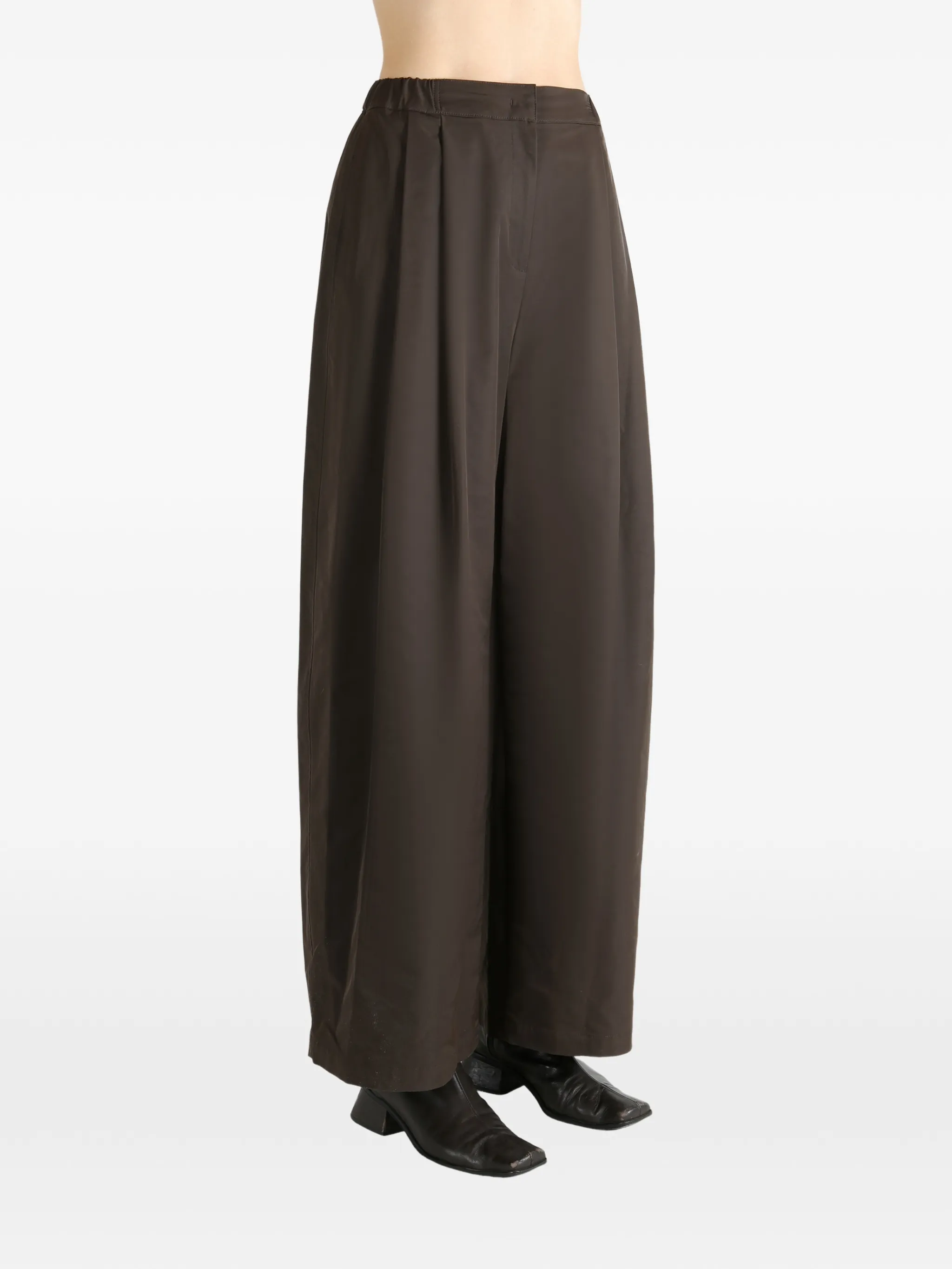 Темно-коричневый эластичный пояс со складками, широкие штанины, задний прорезной карман