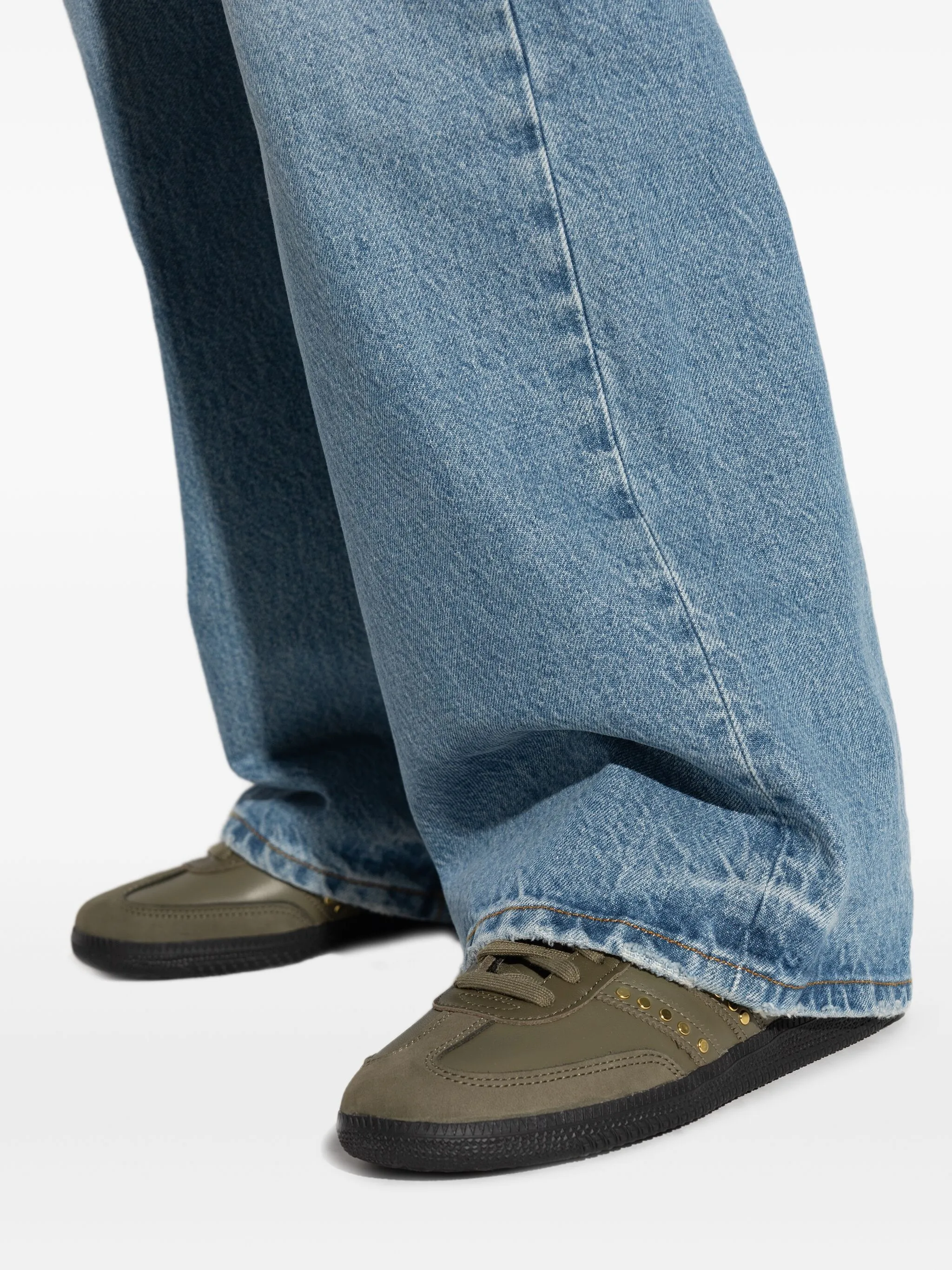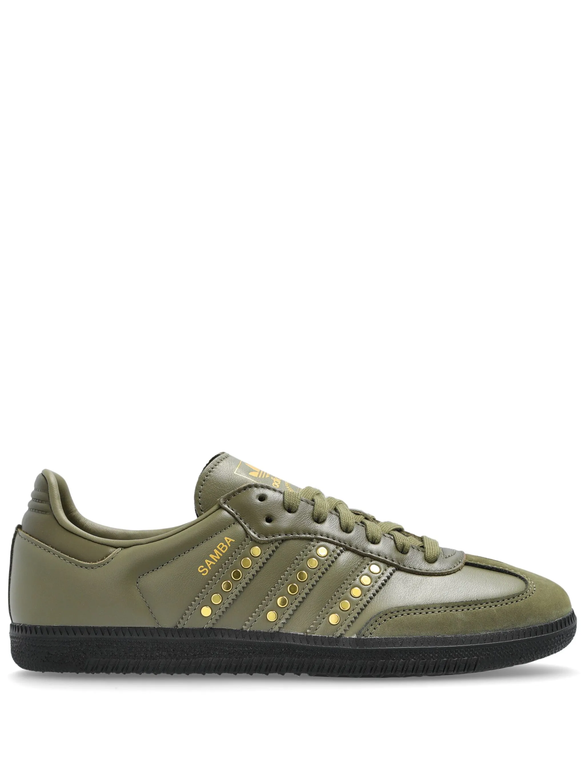 Детали цвета темного хаки с шипами, застежка на шнуровке, круглый носок, плоская подошва с логотипом