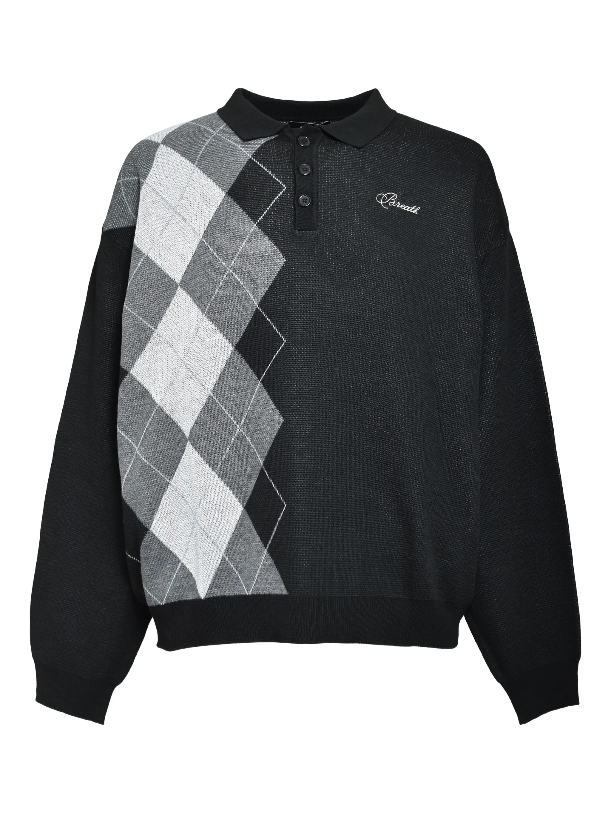 Воротник поло с черным логотипом, вышитым аргайловым узором, застегивающийся на пуговицы, длинные рукава, рубчатый низ