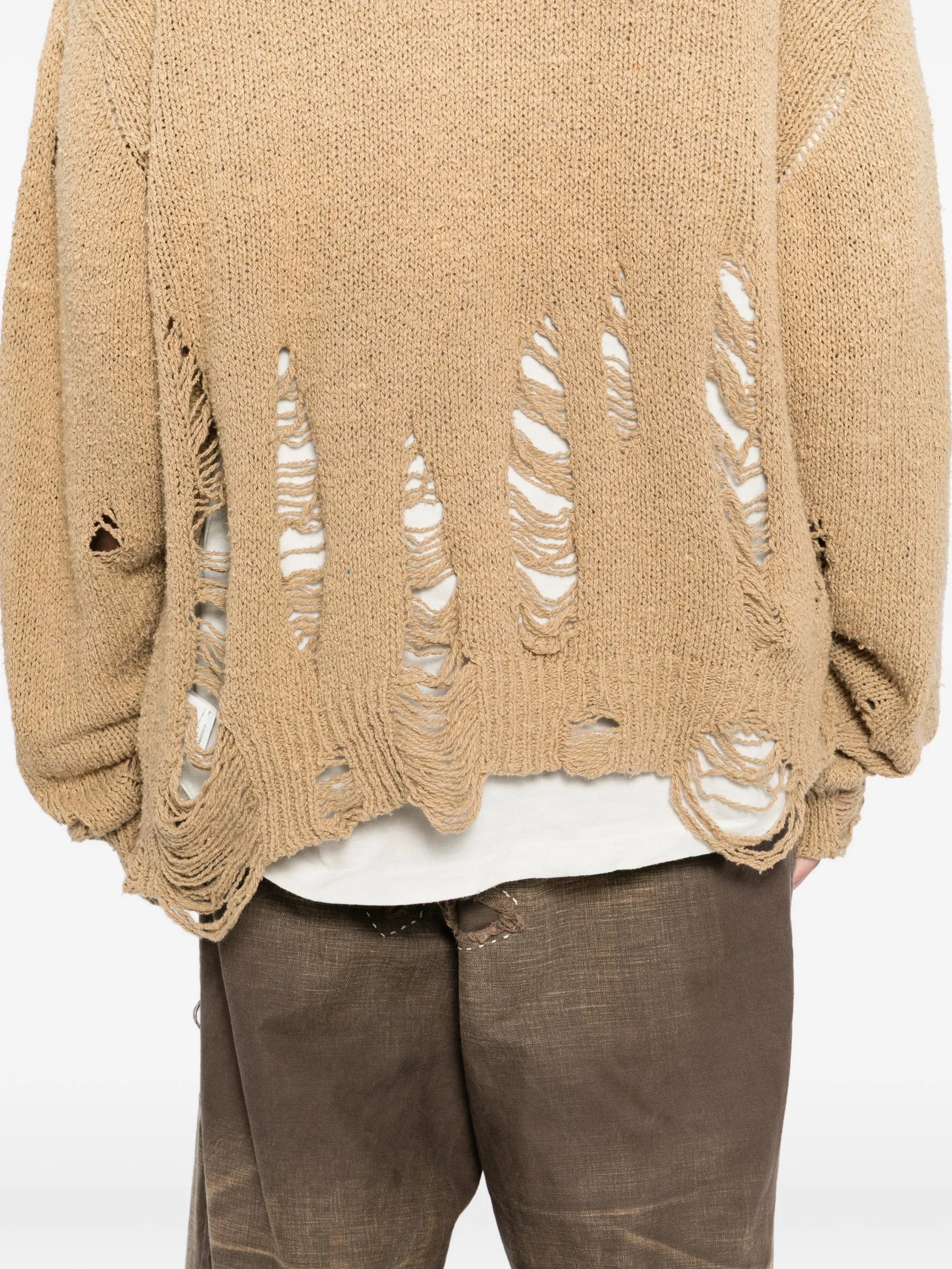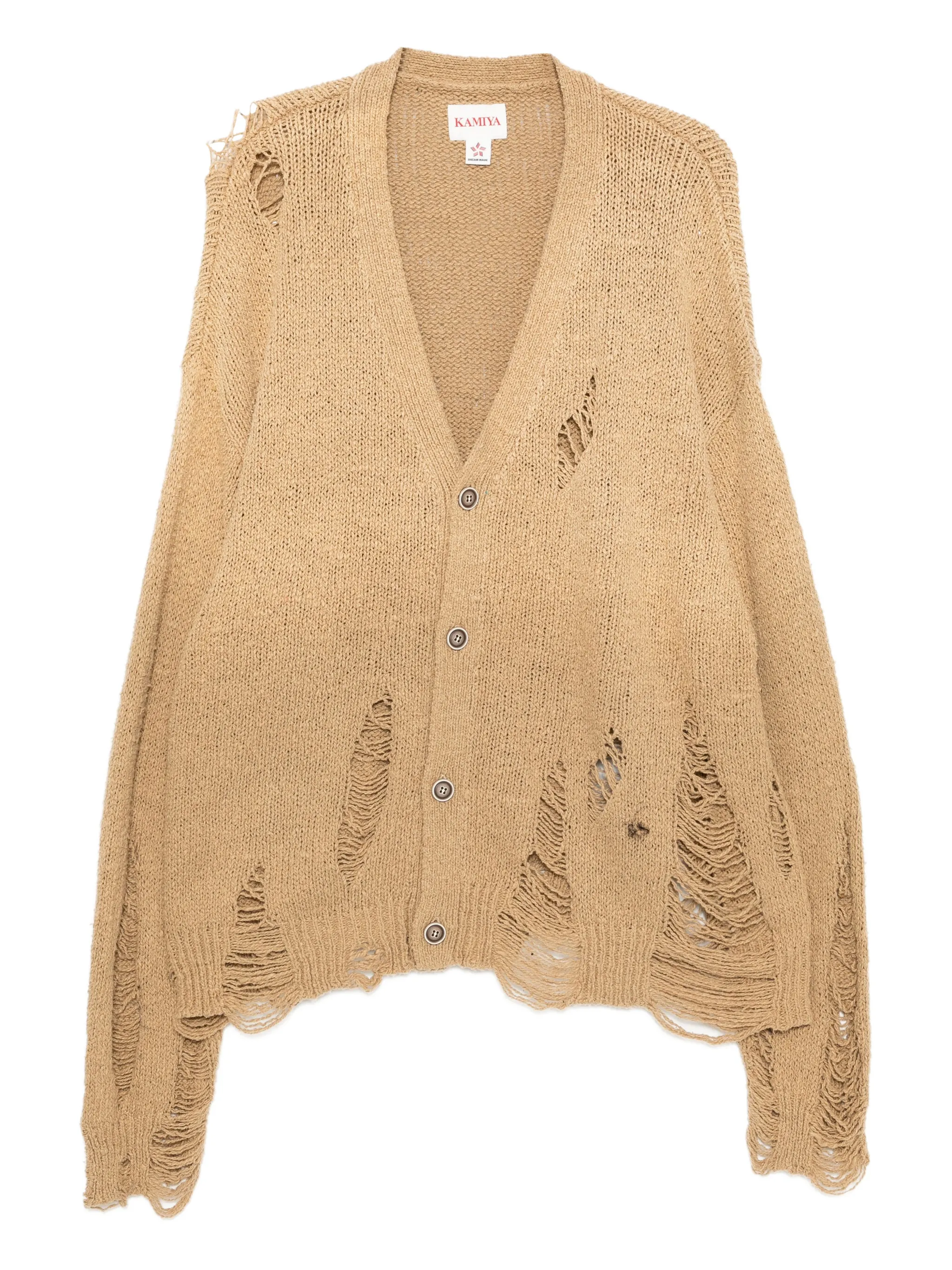 Бежевая застежка на пуговицы спереди, ребристый V-образный вырез, ребристые манжеты и подол с эффектом потертости
