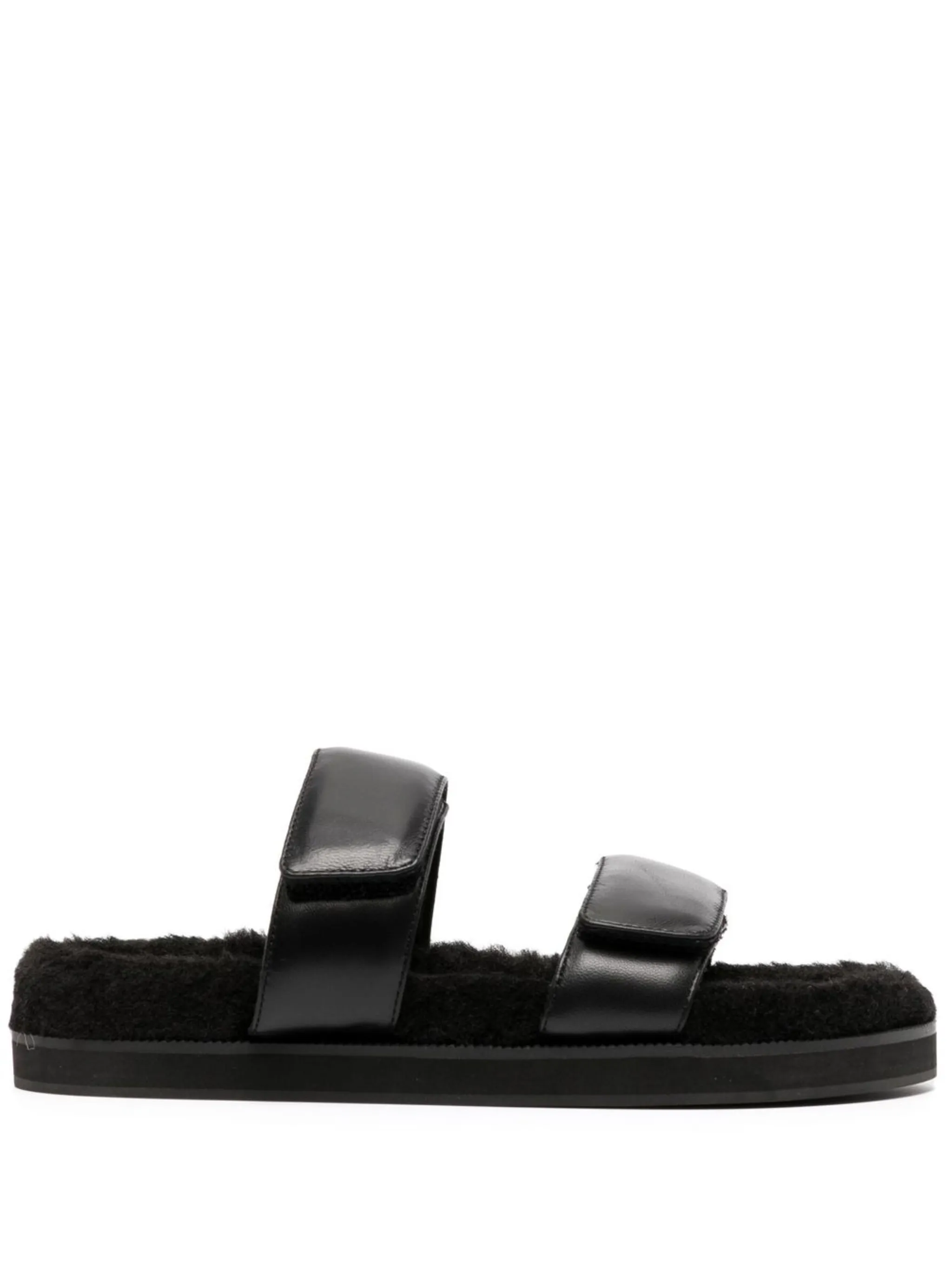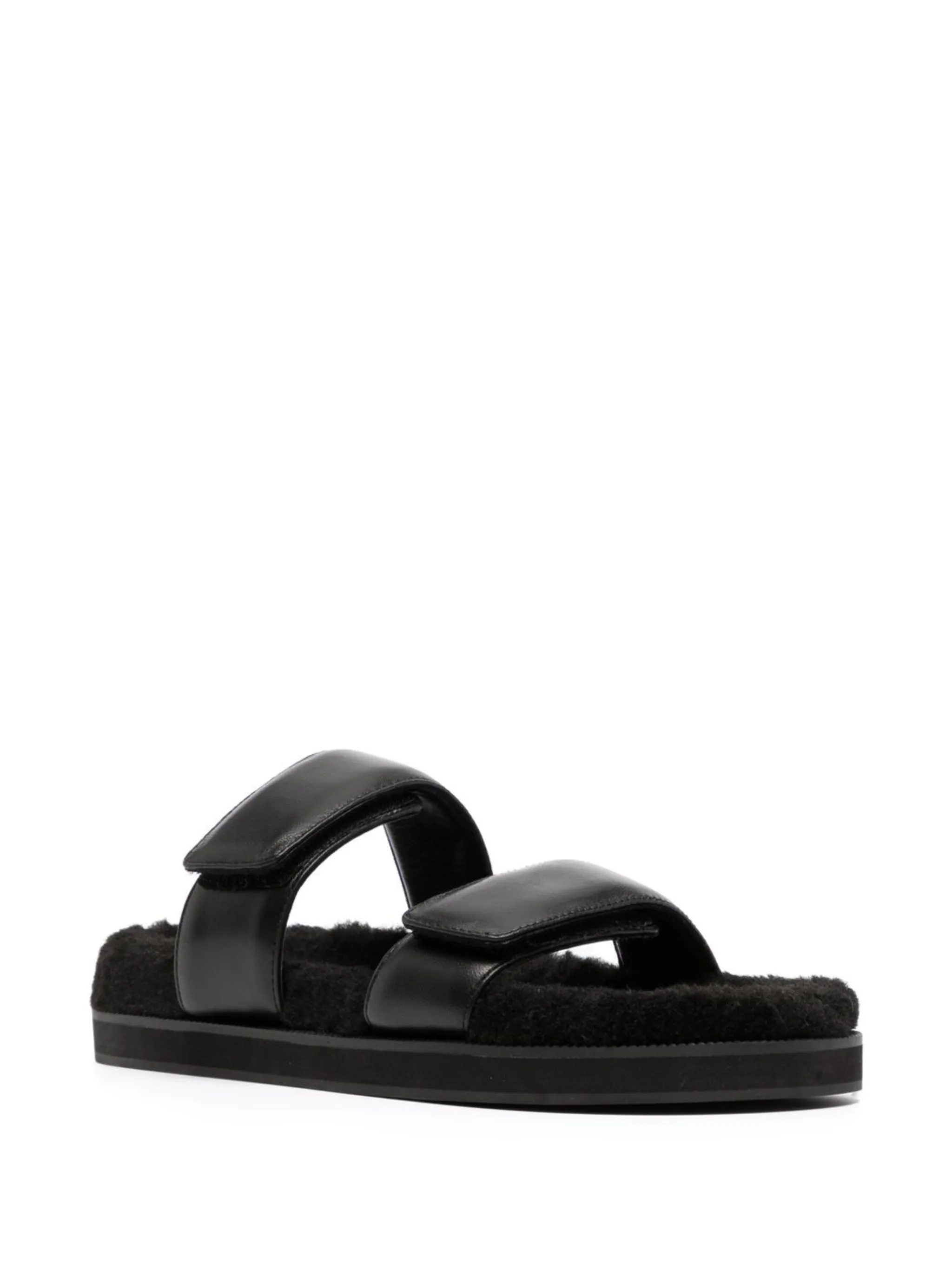 Черный, телячья кожа, стелька с логотипом, открытый носок, браслет в два оборота и плоская резиновая подошва.