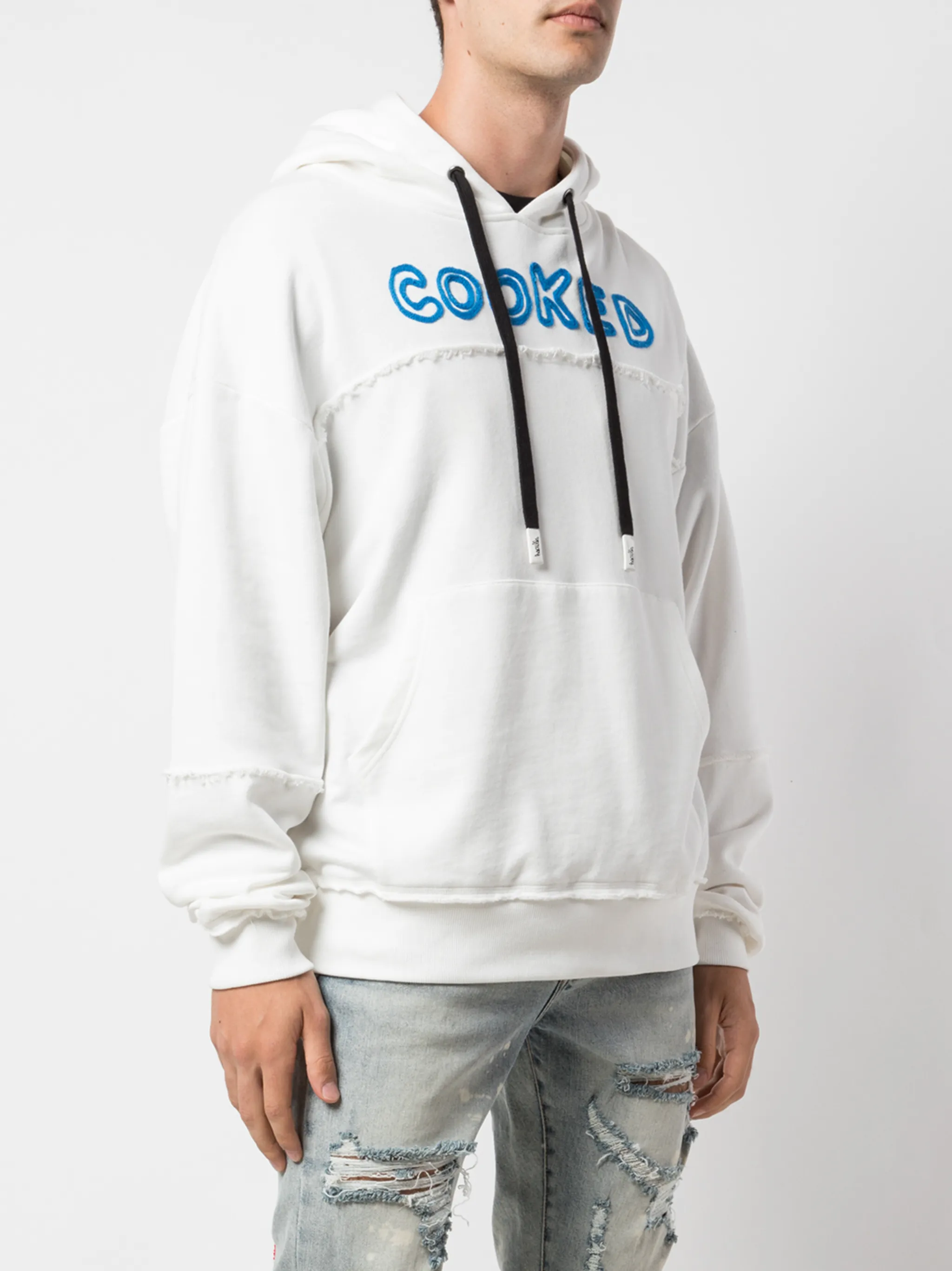 Худи с принтом Cooked от Haculla. Тонкая вязка, эффект потертости, длинные рукава, прямой подол и капюшон, затягивающийся на шнурок.