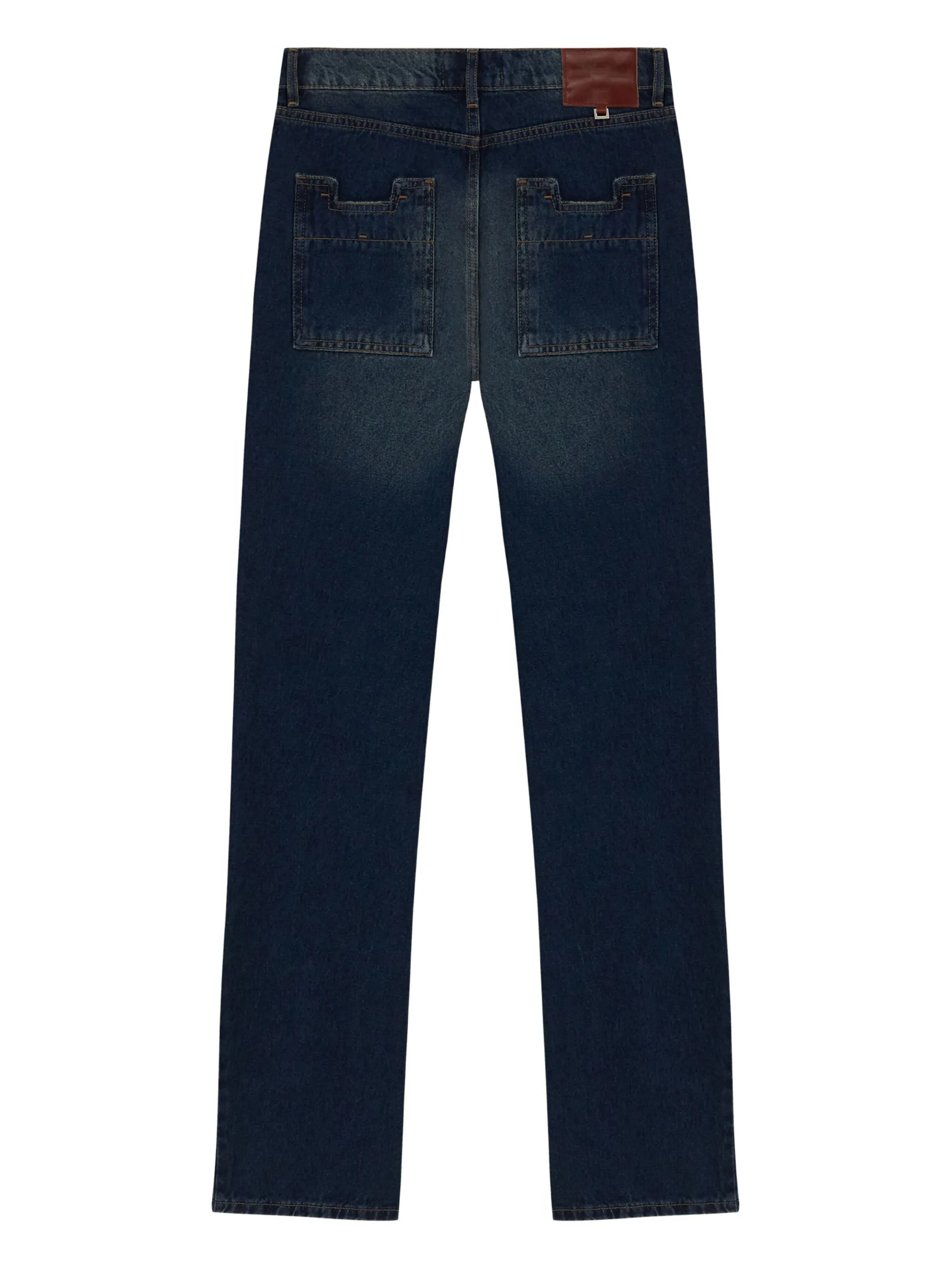 Синяя отстрочка сверху, пять карманов, шлевки для ремня
