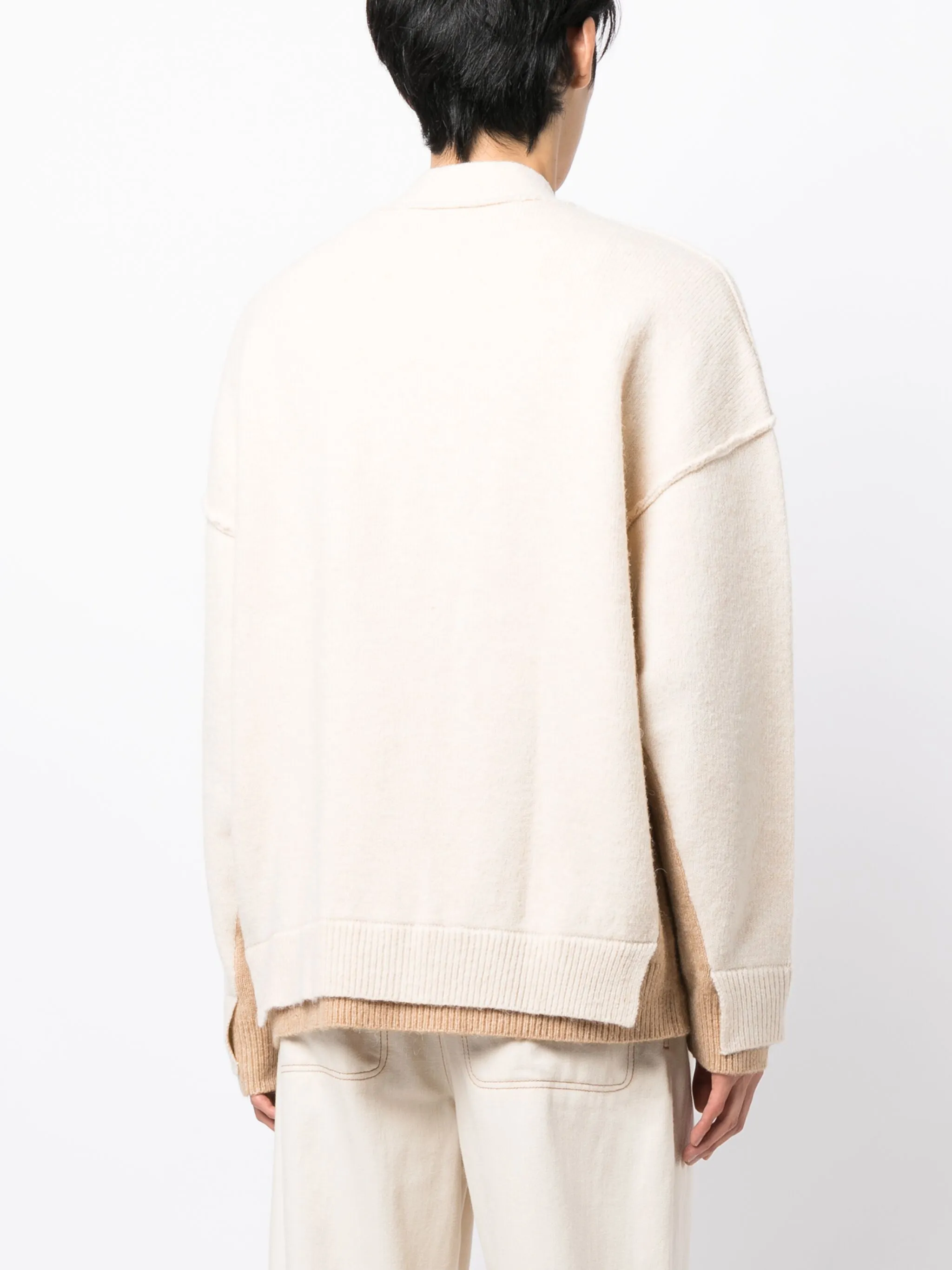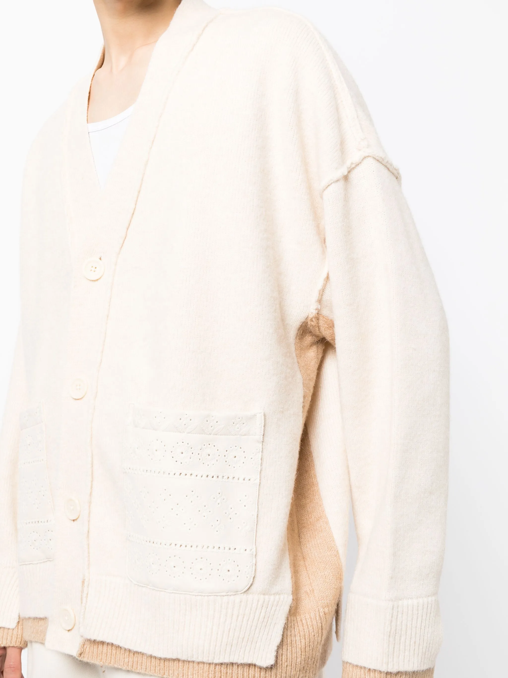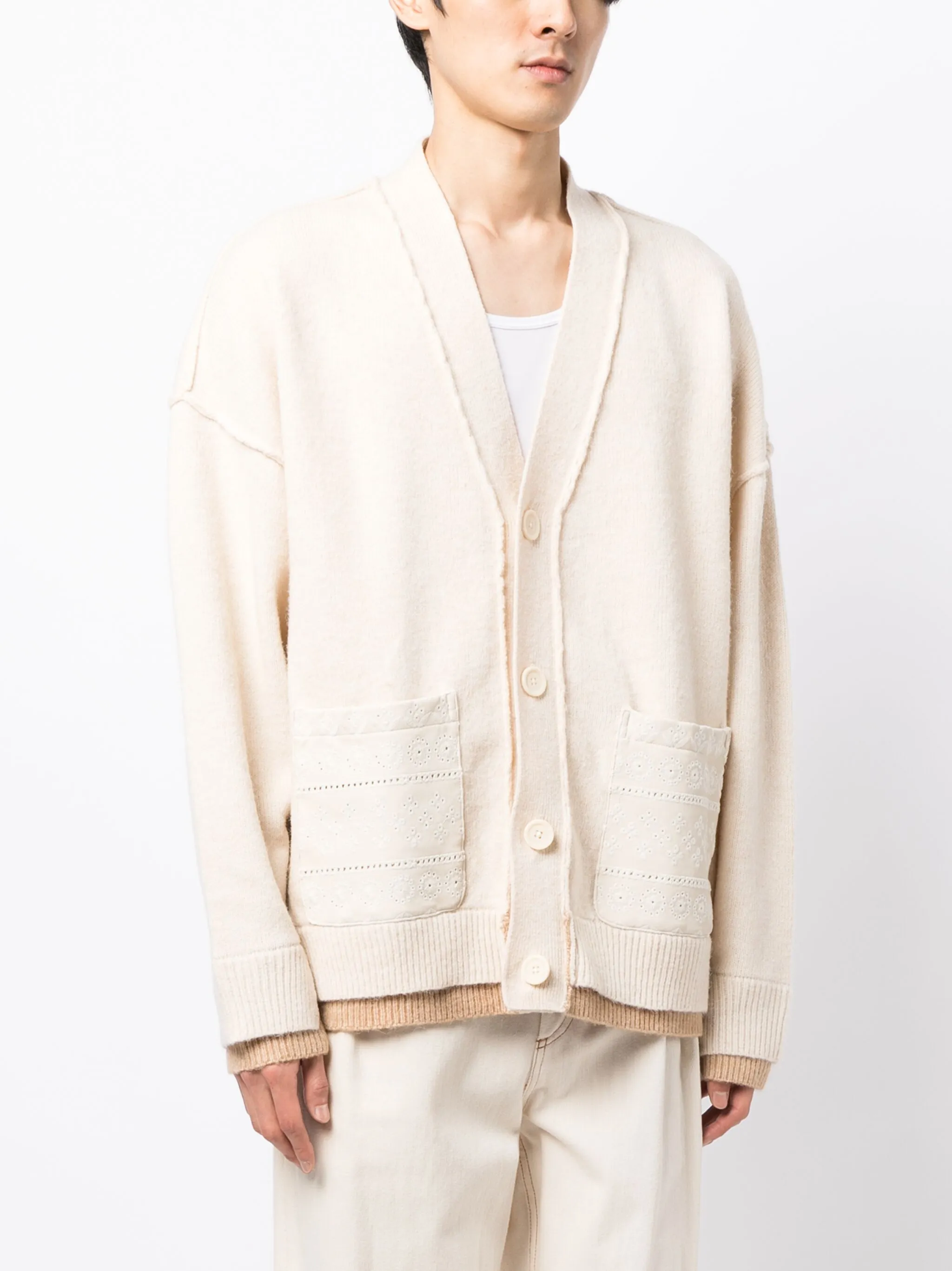 Кремово-белый, трикотажный материал, вышитый узор, декоративные наружные швы, глубокий V-образный вырез, застежка на пуговицах спереди, длинные рукава, два накладных кармана и прямой подол.