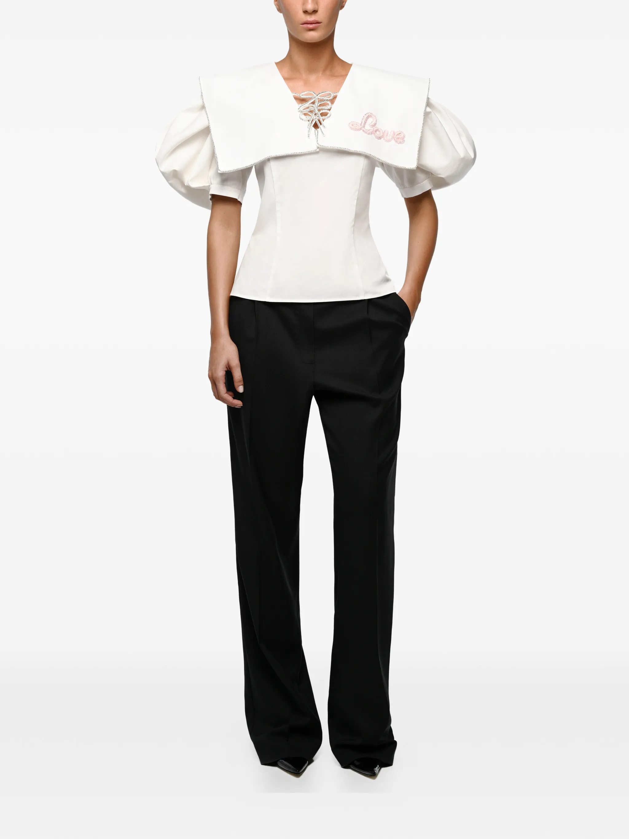 Белая вышитая деталь, шнуровка спереди, короткие рукава, деталь украшения