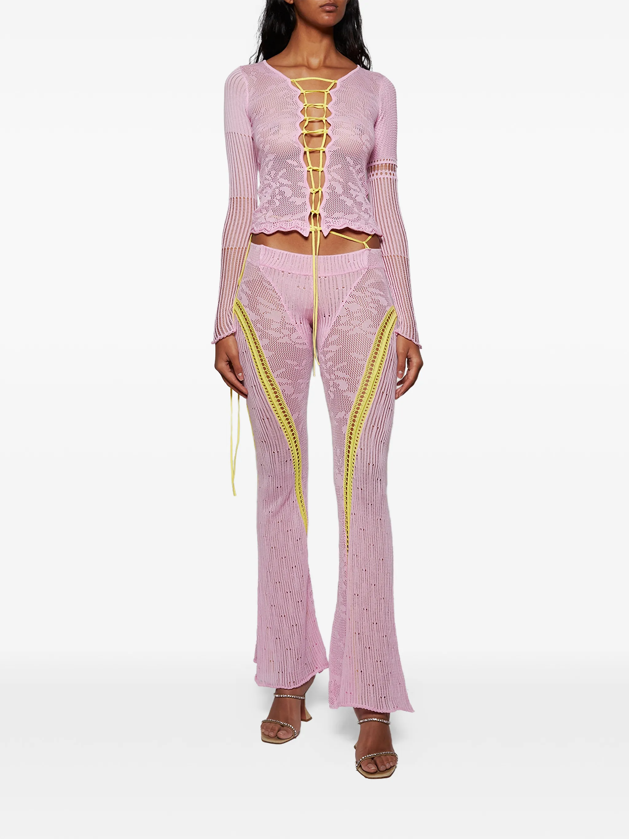 Светло-розовая шнуровка спереди, длинные рукава, вязаная конструкция, фестончатый подол, прозрачный дизайн