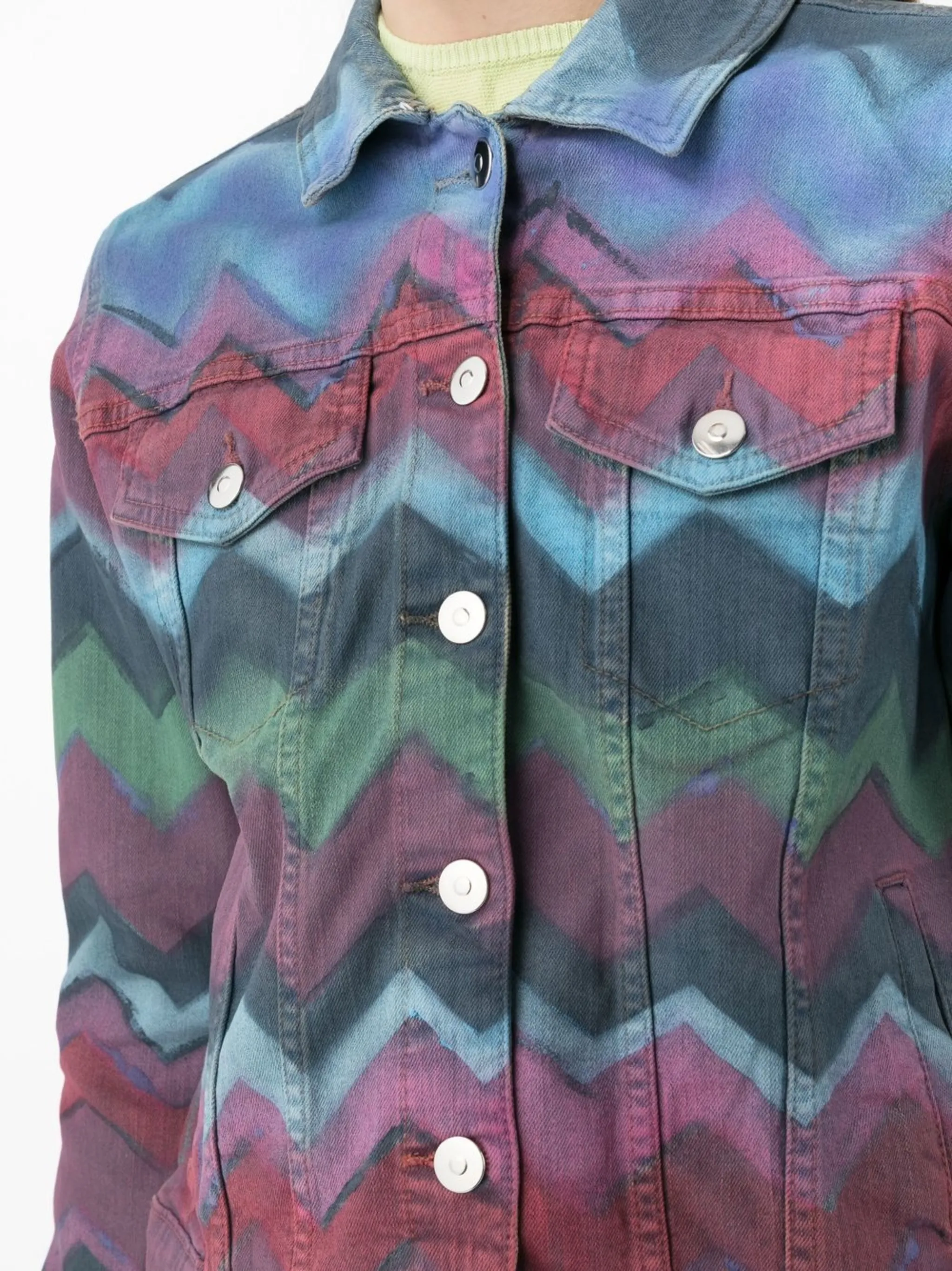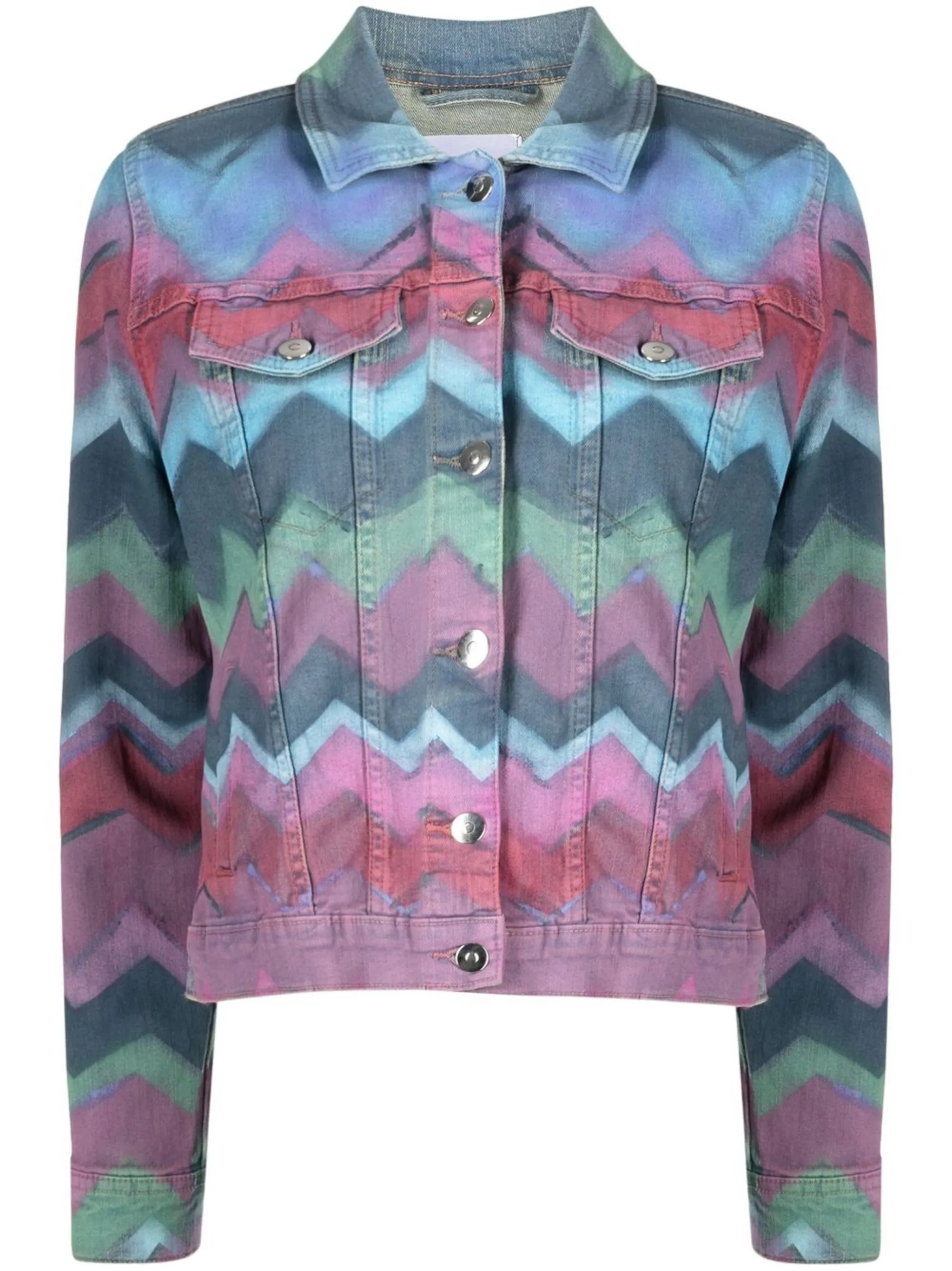 Голубой, разноцветный, эластичный хлопок, деним, зигзагообразный принт, два нагрудных кармана с клапанами, застежка на пуговицах спереди, классический воротник, длинные рукава, манжеты на пуговицах и прямой подол.