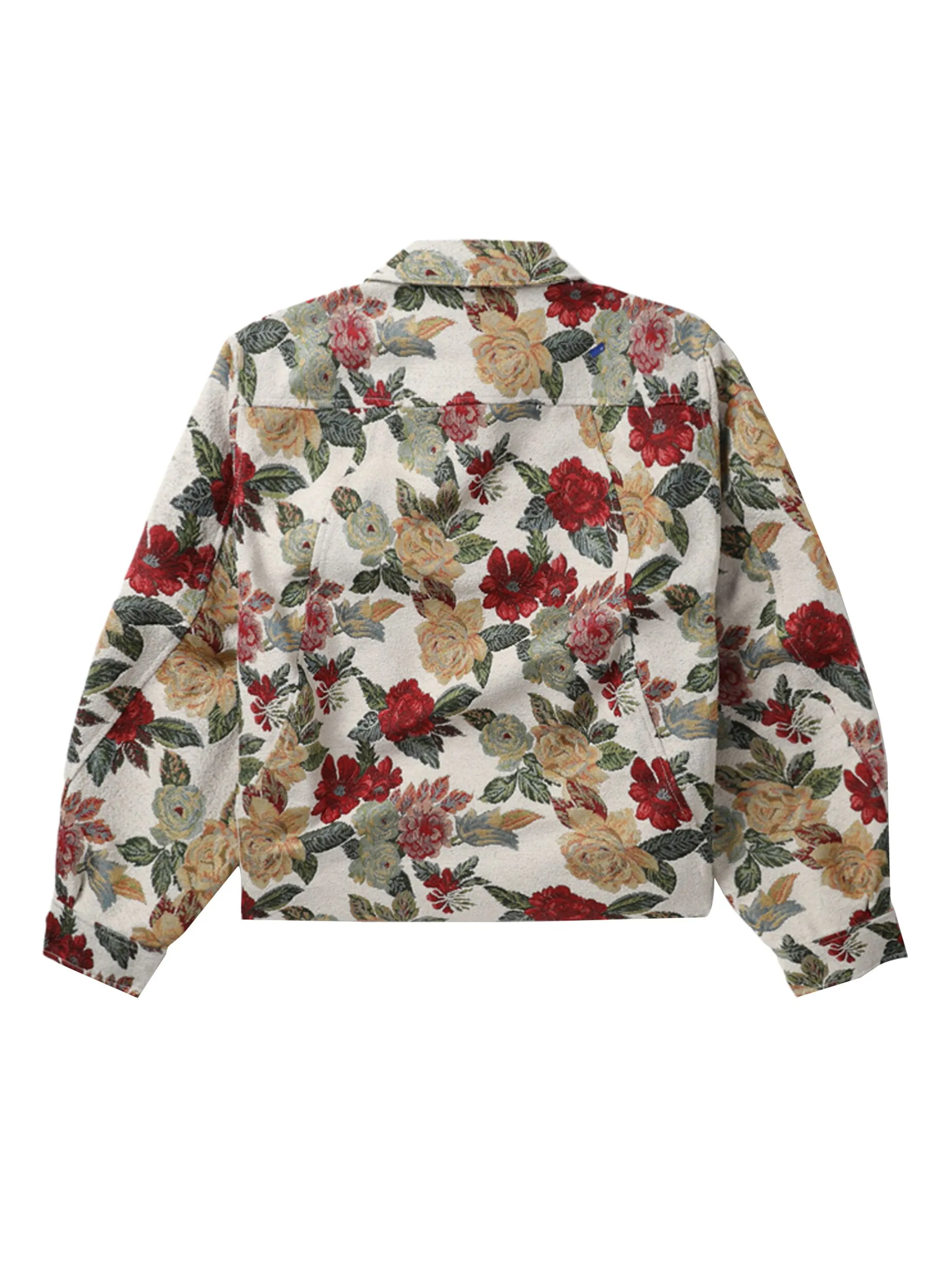 Белый/разноцветный, сплошная цветочная вышивка, нашивка с логотипом спереди, классический воротник, застежка на пуговицах спереди, два передних кармана с клапанами, длинные рукава, рукава с манжетами на пуговицах и прямой подол.