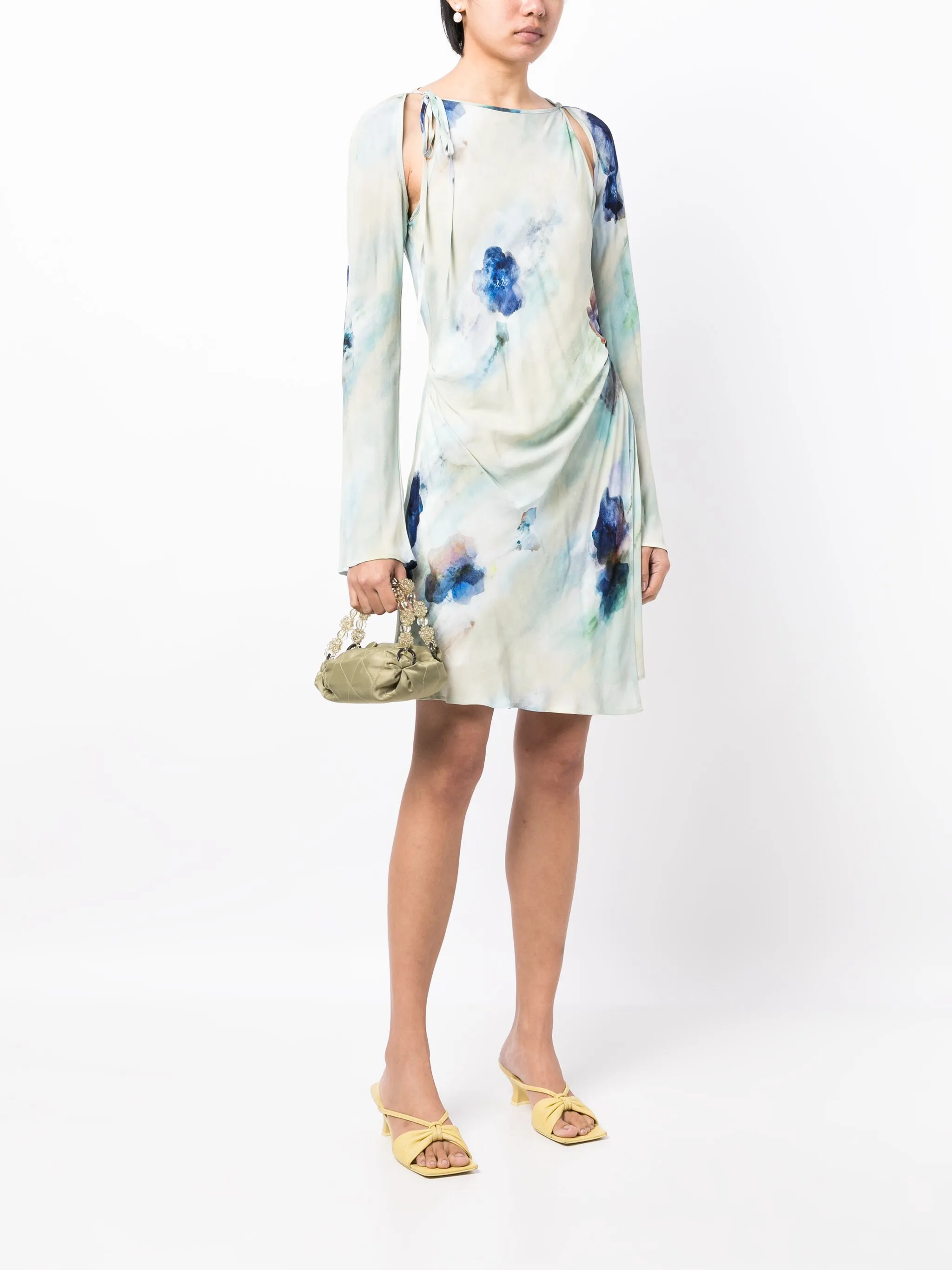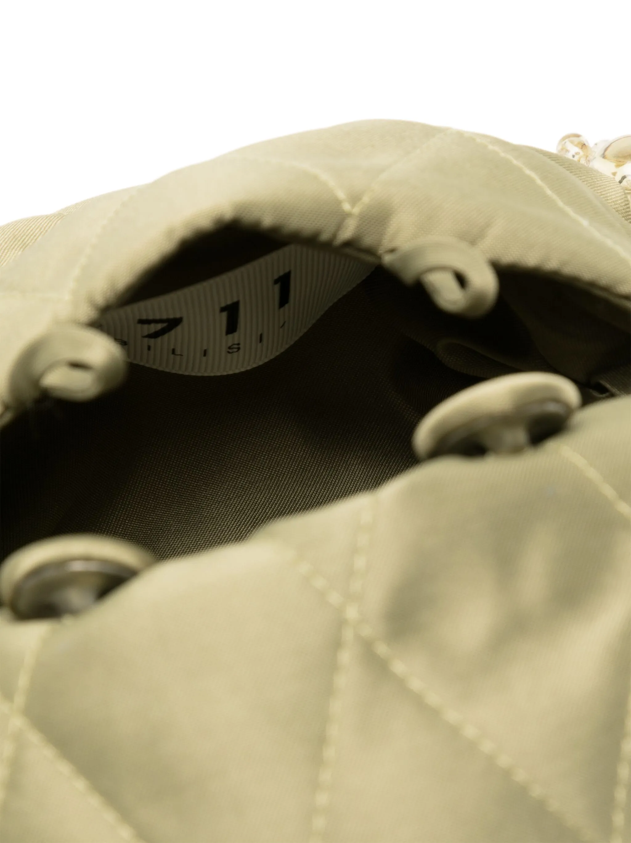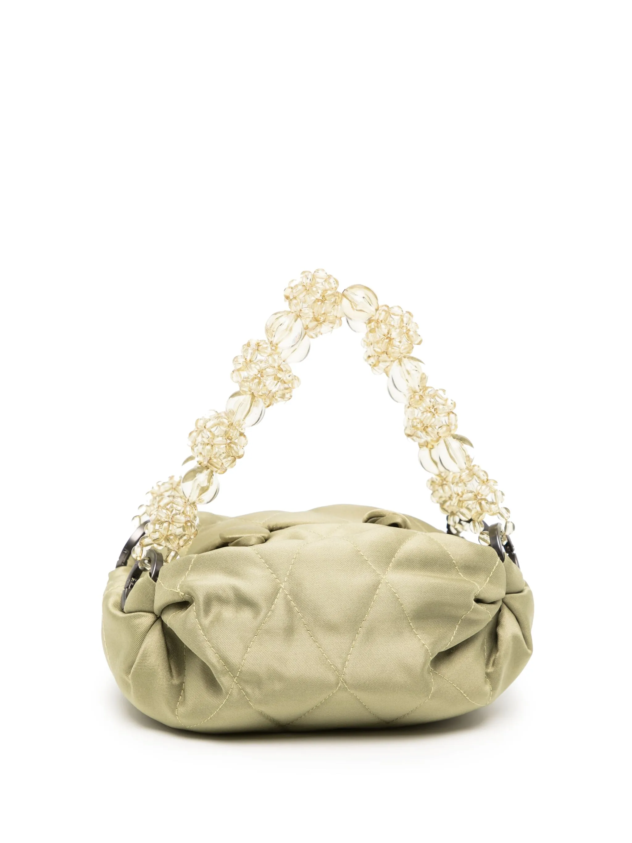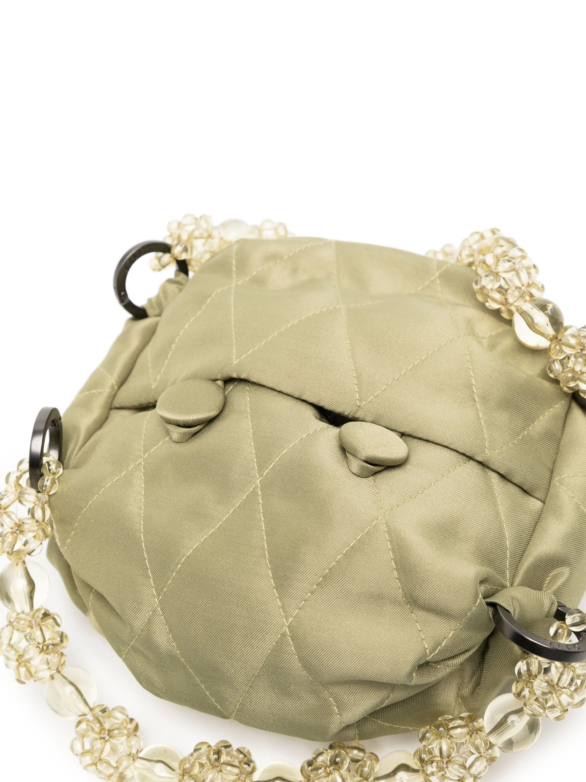 Стеганый материал, декор из бисера, нашивка с логотипом внутри, ручки с отделкой из бусин и застежка на пуговицы.
