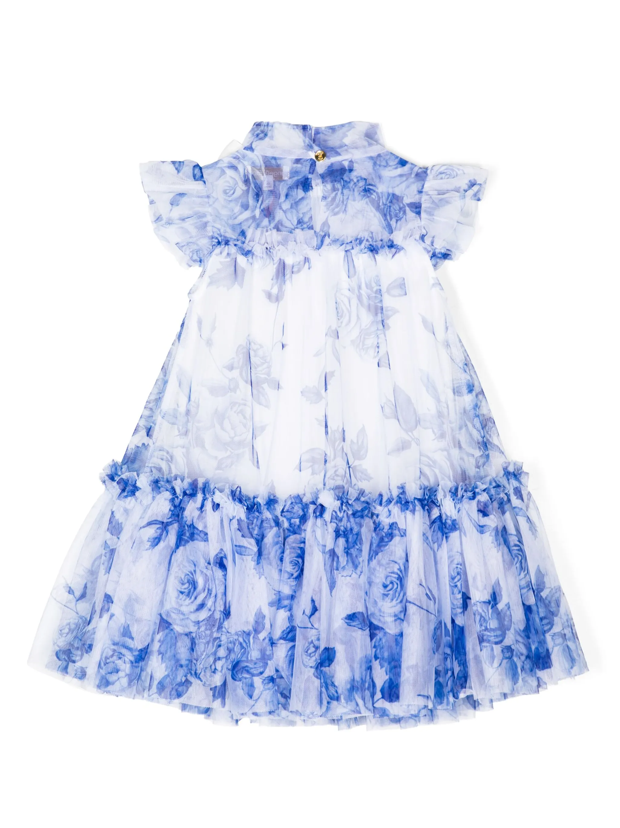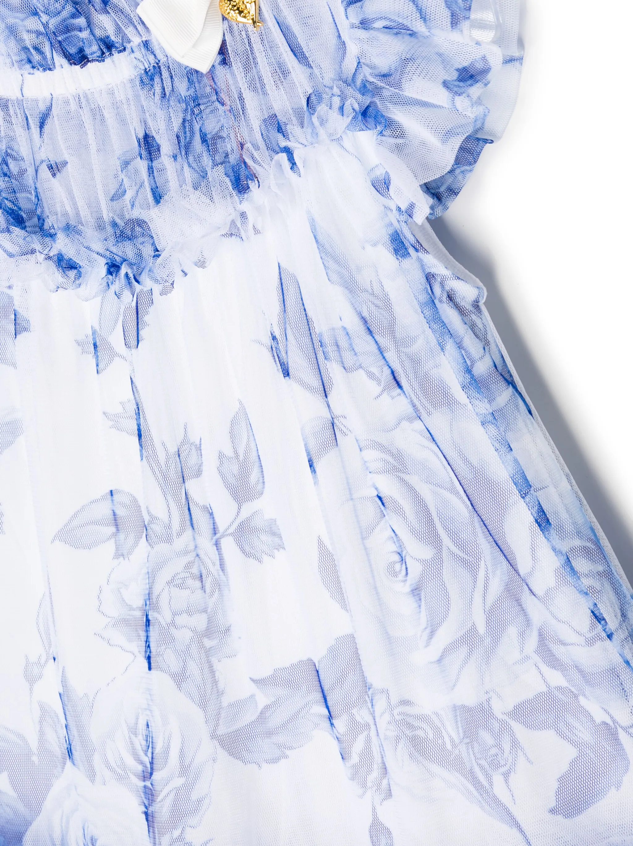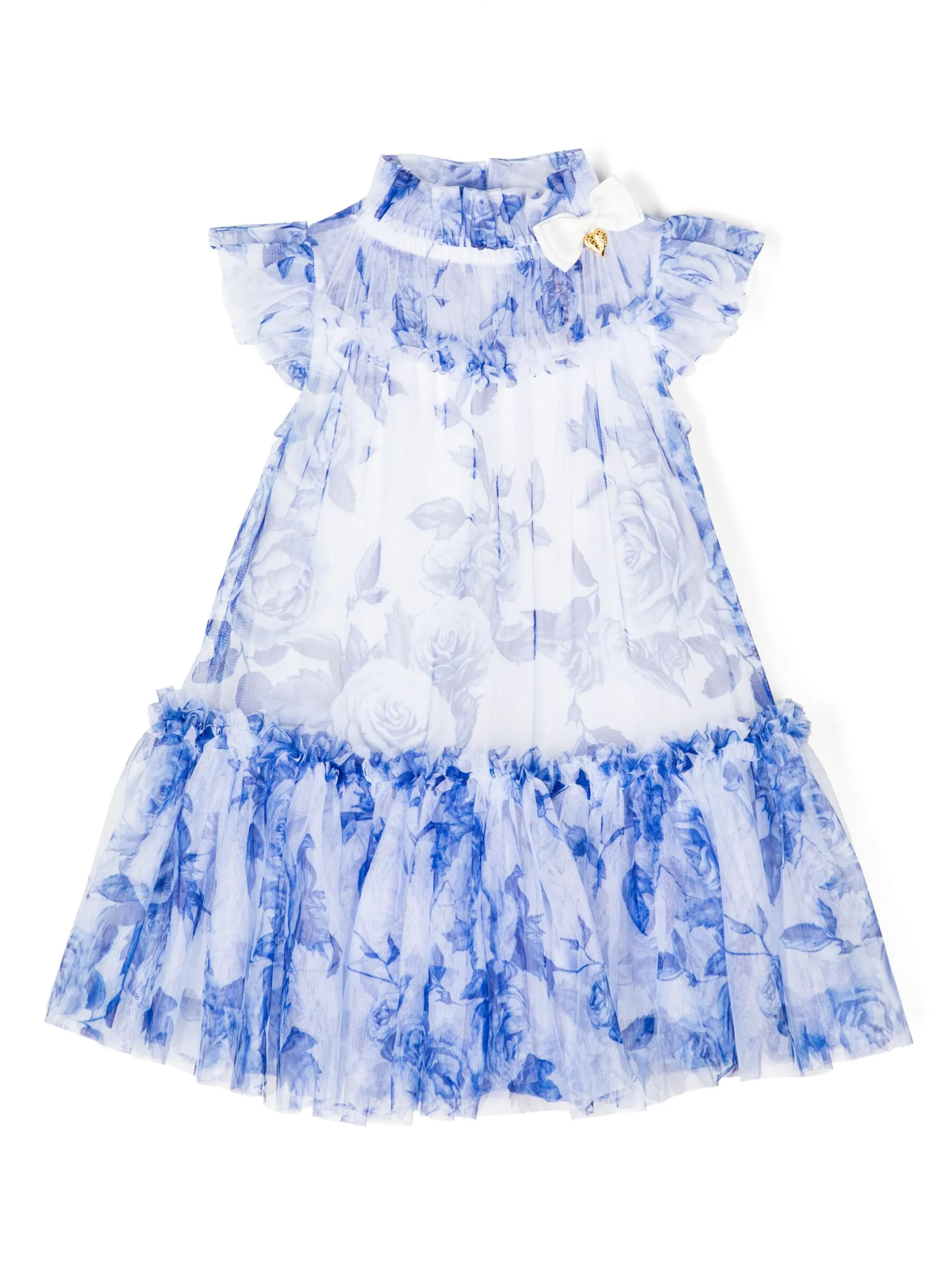 Синий/белый, сплошной цветочный принт, вставки из тюля, вставки с оборками, бант, подвеска в форме сердца, высокий воротник, короткие рукава и расклешенный подол.