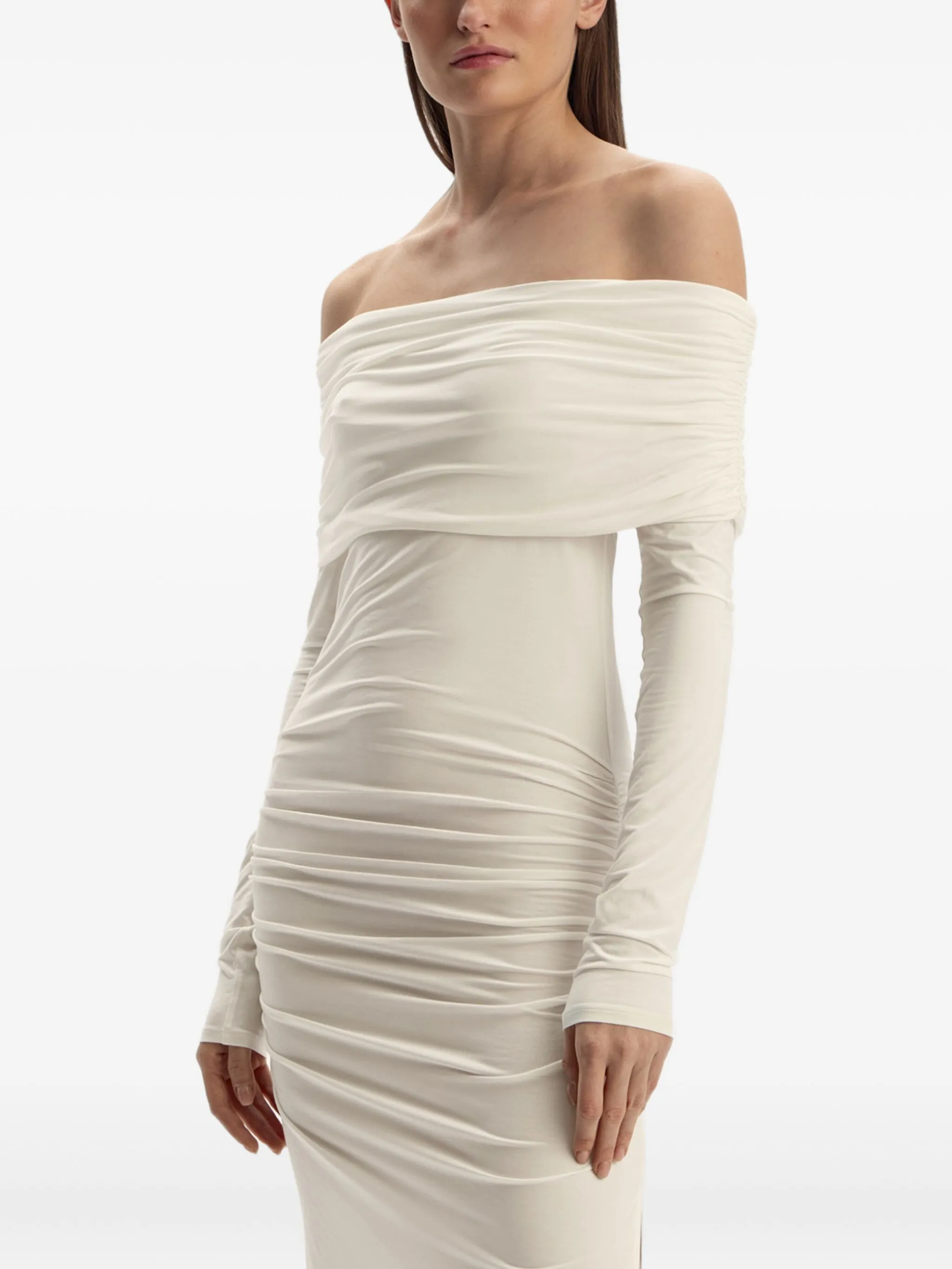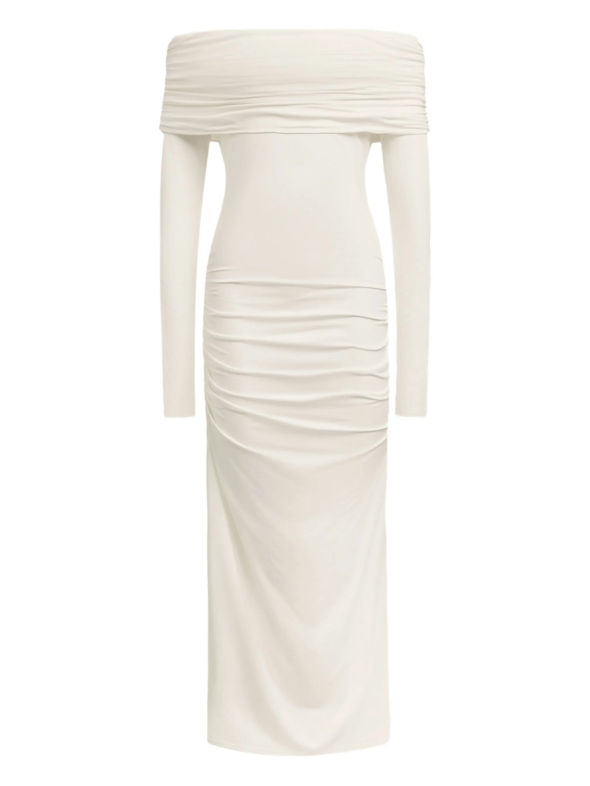 Белоснежный дизайн с открытыми плечами, длинные рукава с рюшами и разрез по бокам