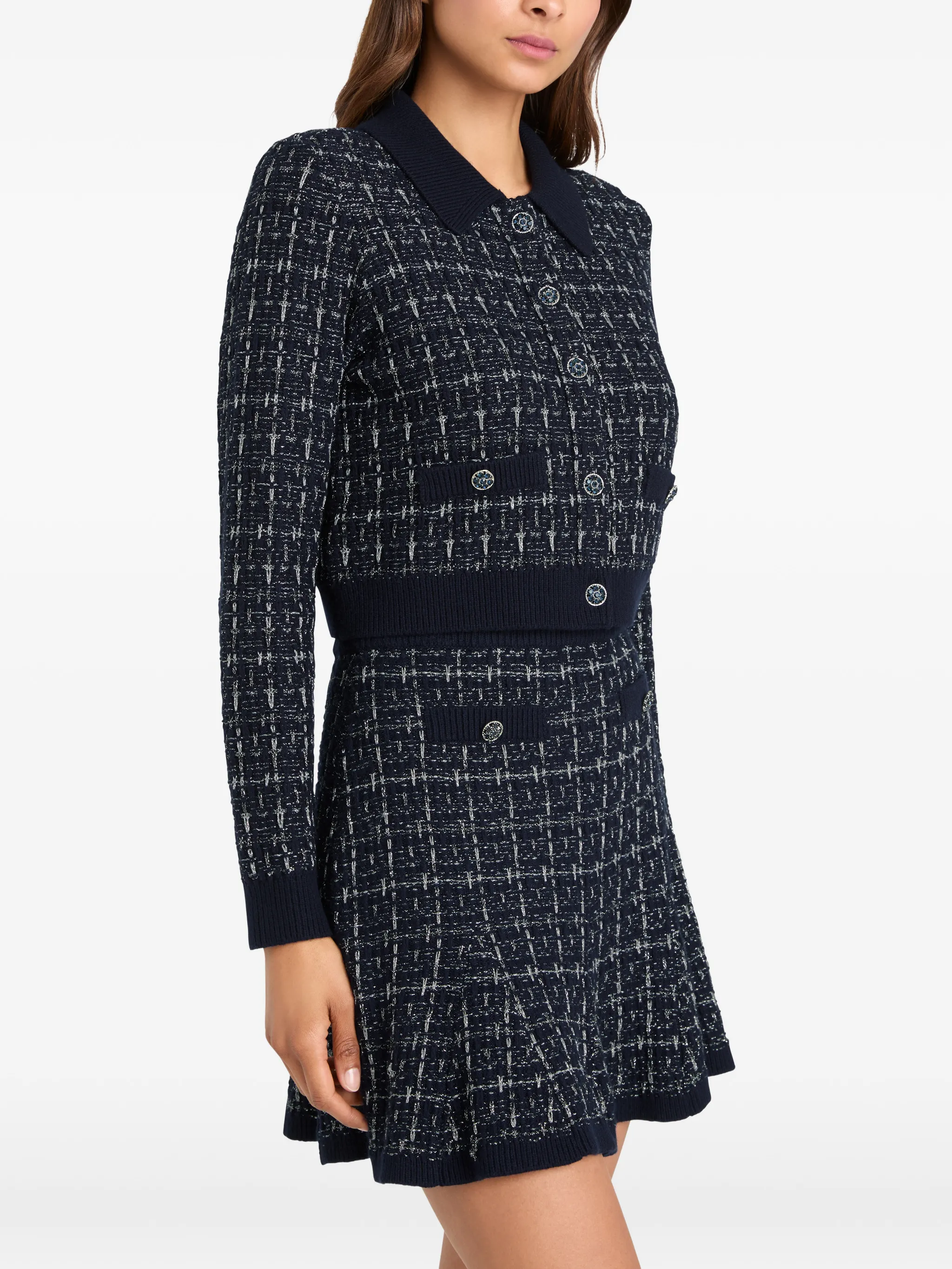 Рубчатый низ с темно-синим воротником, застегивающимся спереди на пуговицы