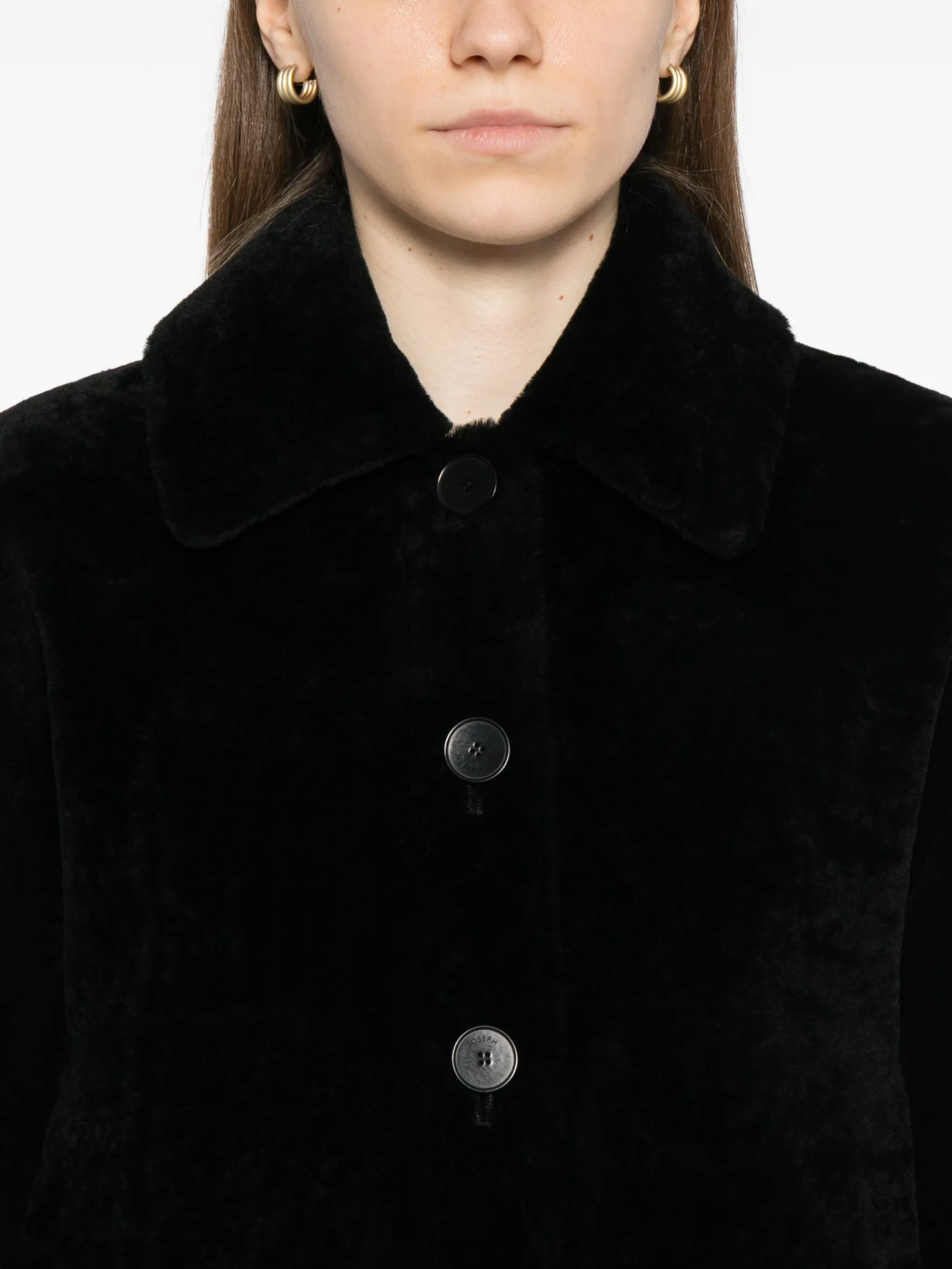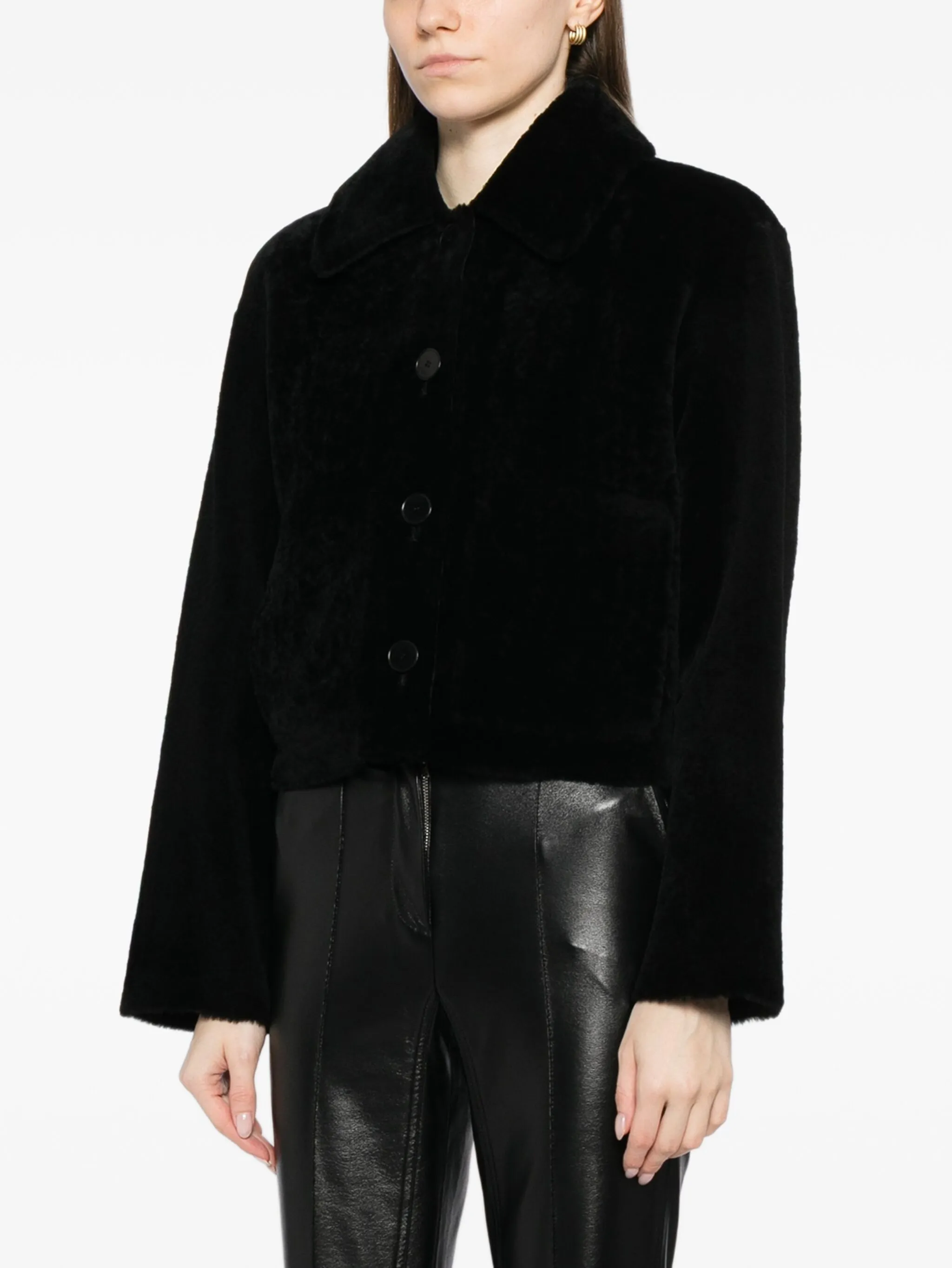 Черная застежка спереди на пуговицы, два боковых врезных кармана, длинные рукава