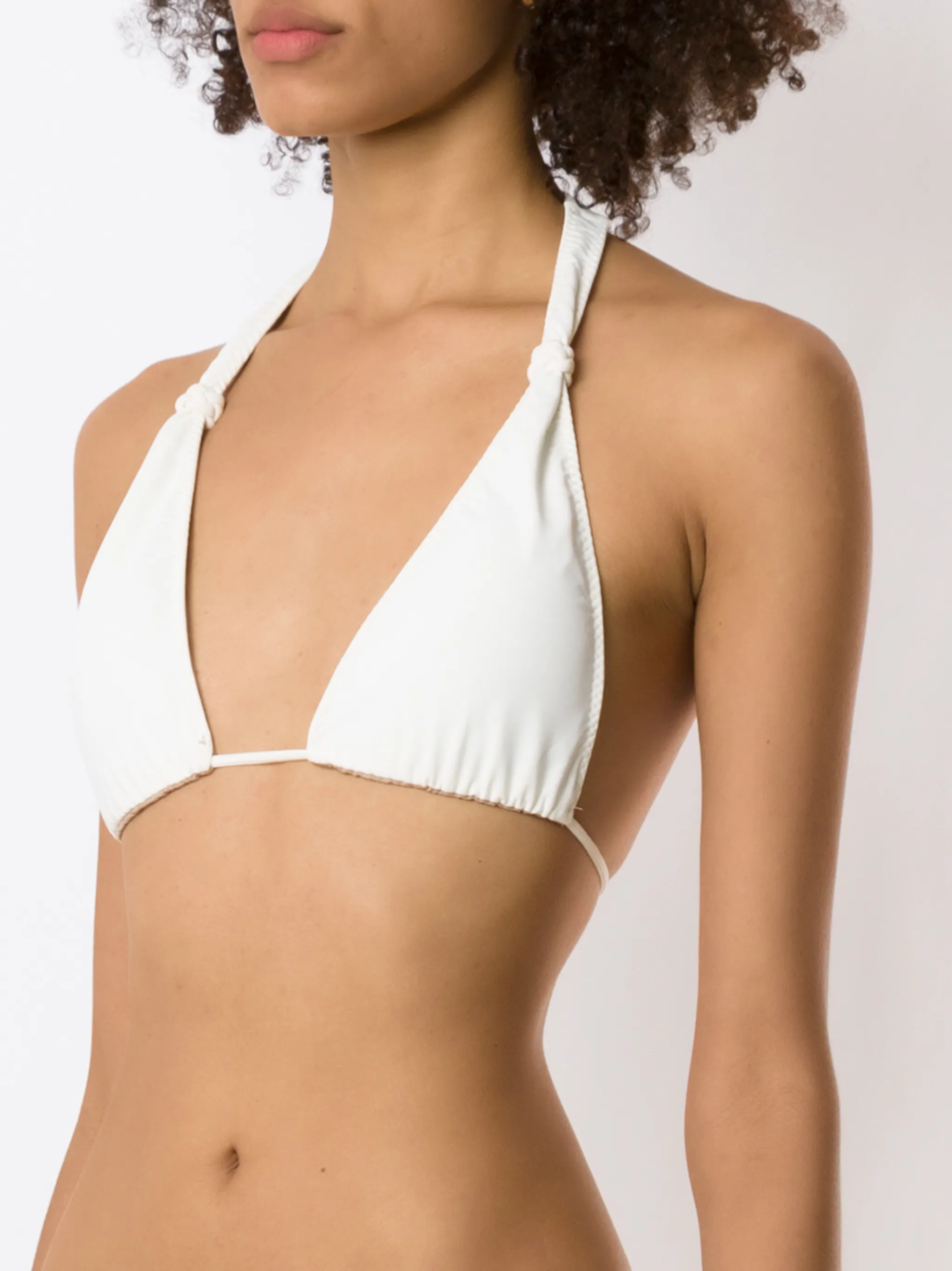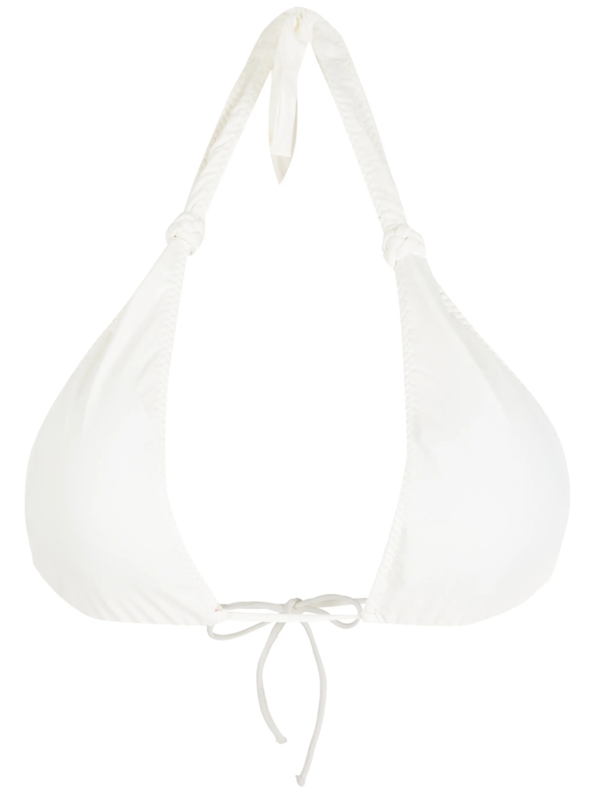 Эластичная модель, треугольная чашка, завязки вокруг шеи и застежка на завязке сзади. Цвет: белый.