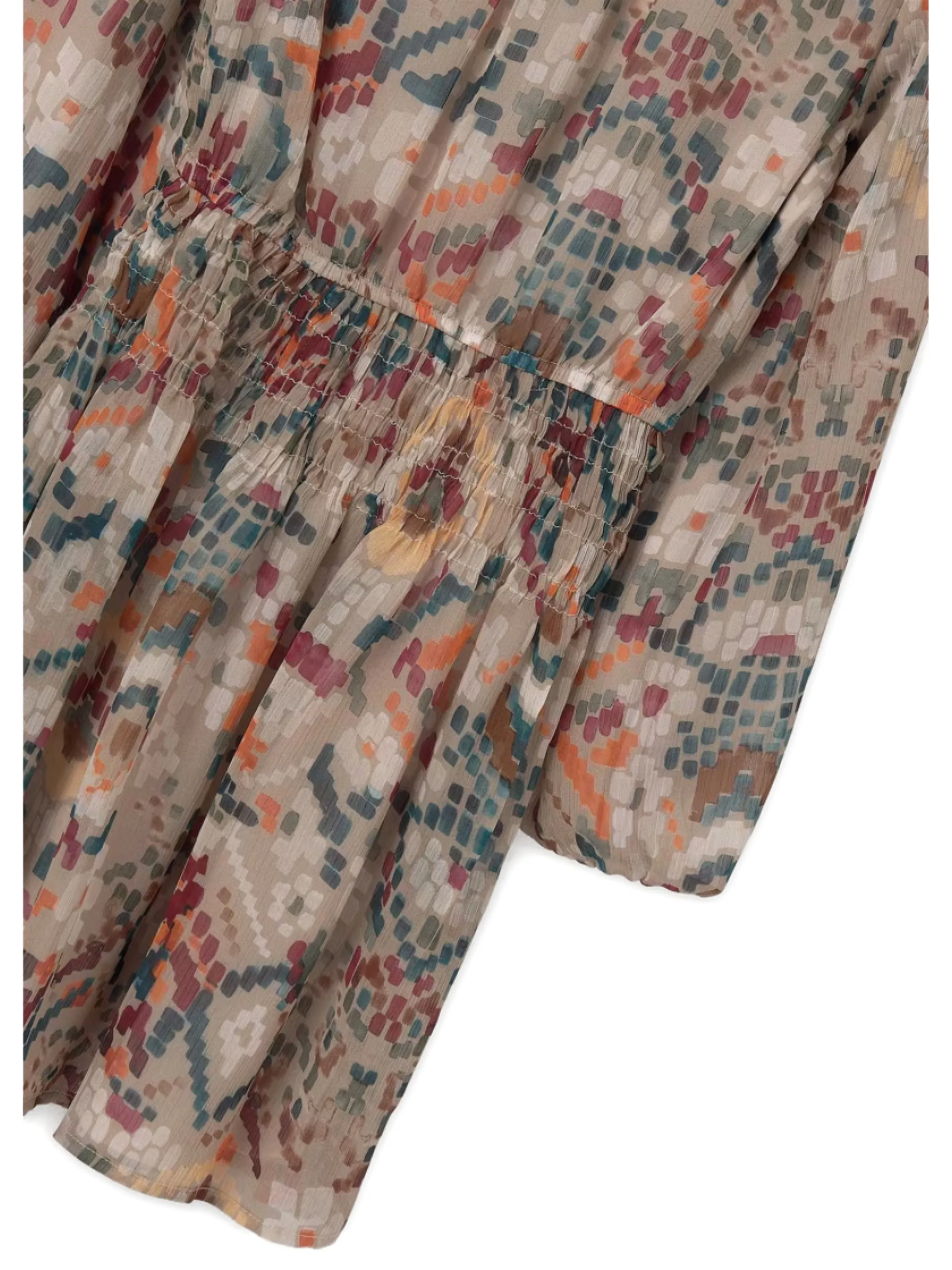 Коричневый графический принт, длинные рукава с рюшами, эластичная талия, круглый вырез
