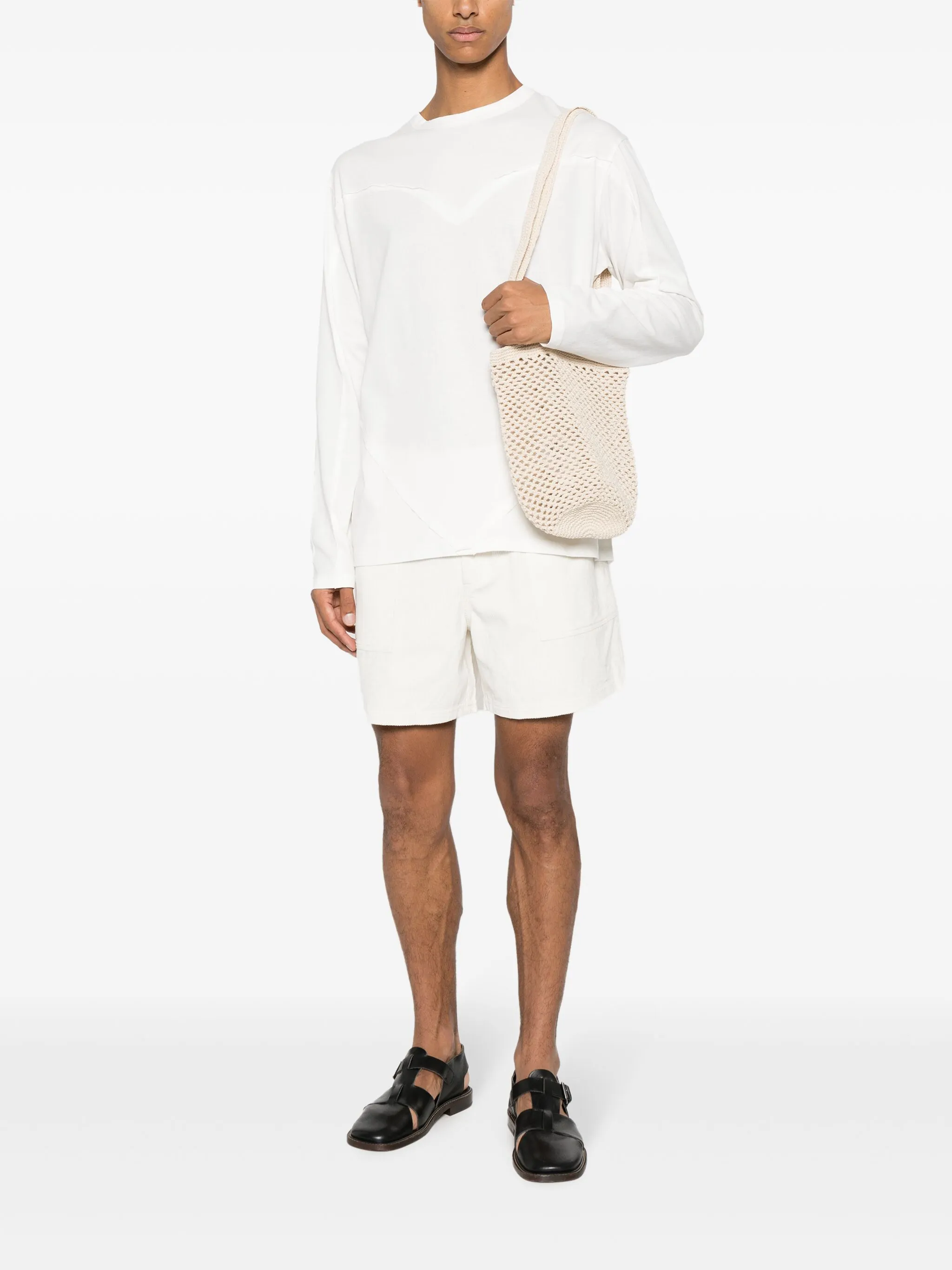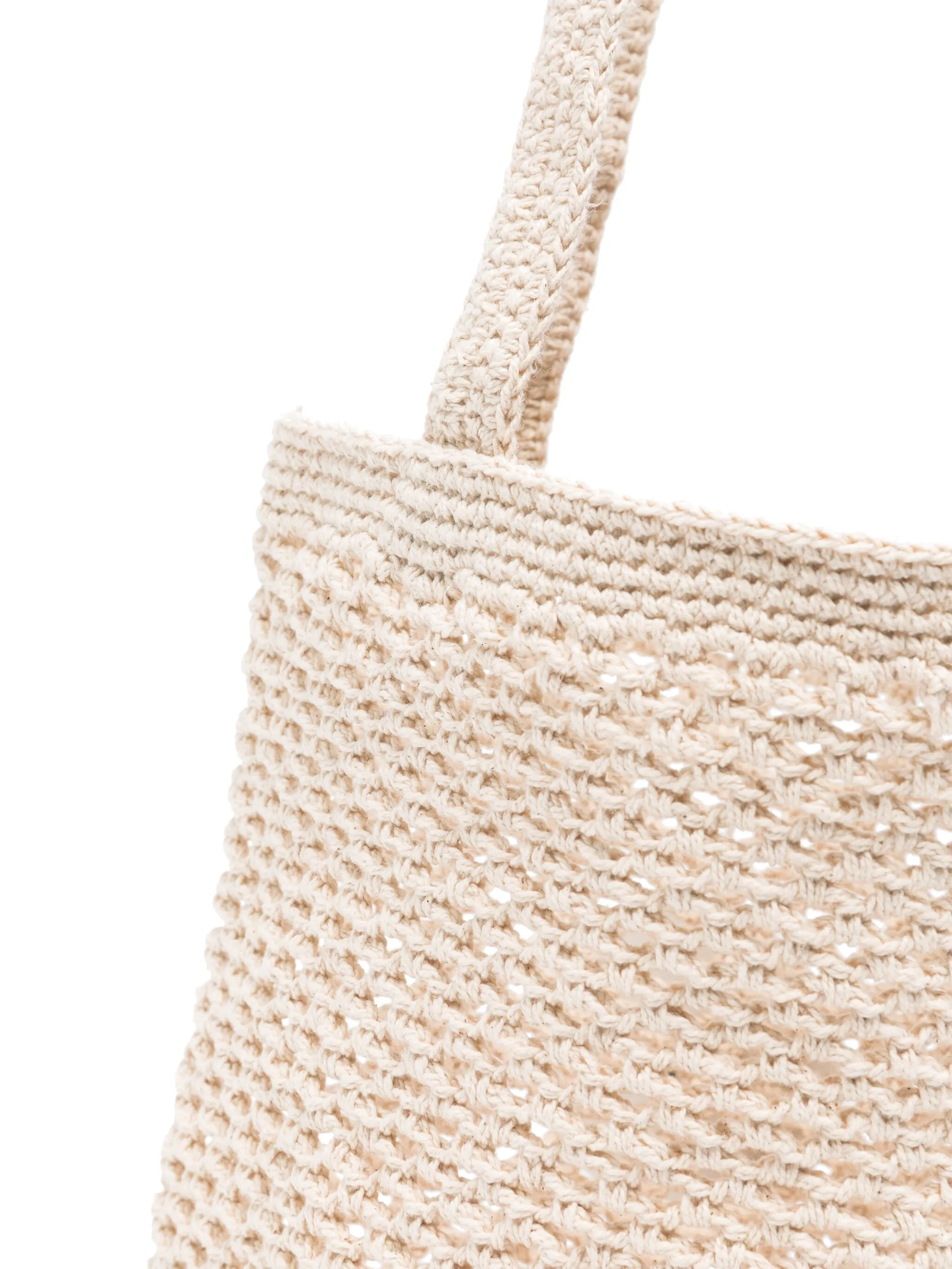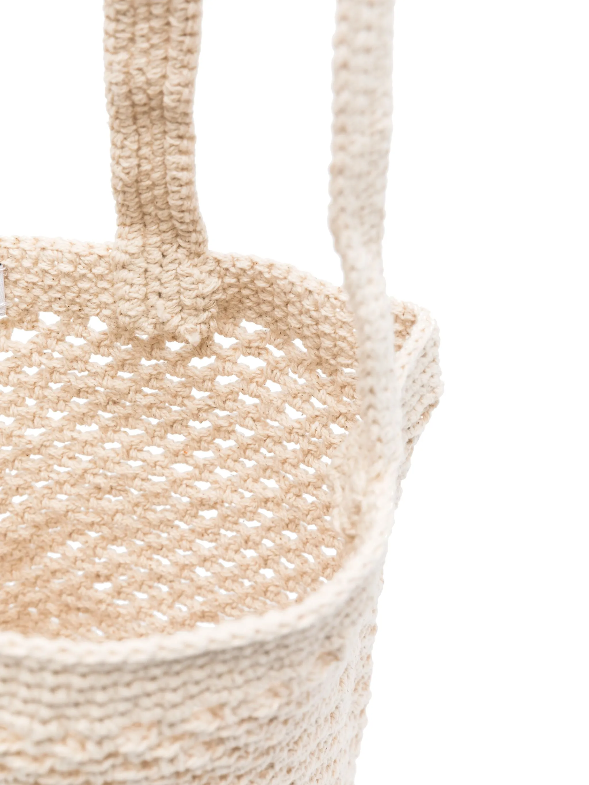 Светло-бежевый, хлопок, крупная вязка, ажурная вязка, две длинные верхние ручки, нашивка с логотипом внутри, основное отделение и объемная модель.
