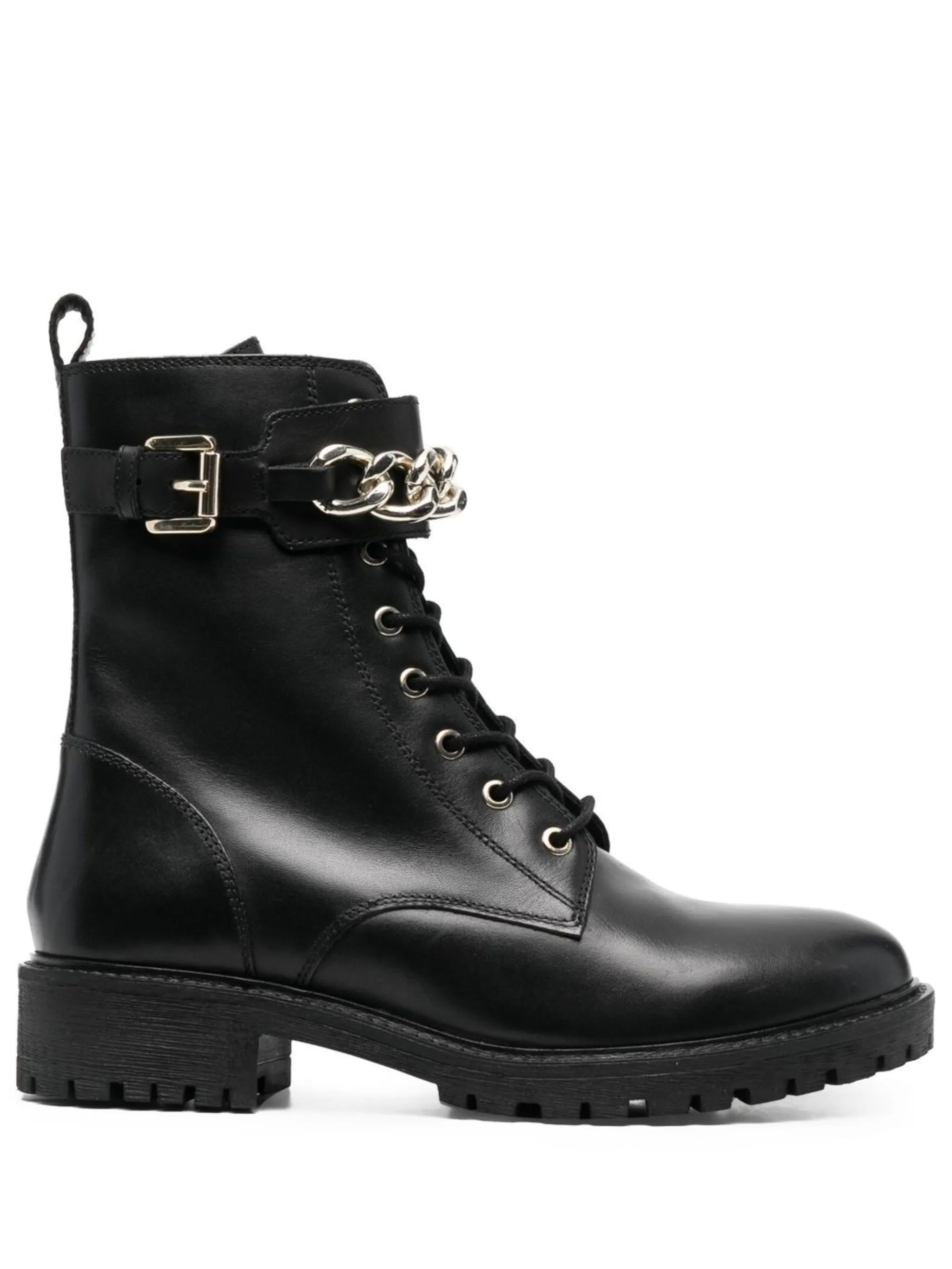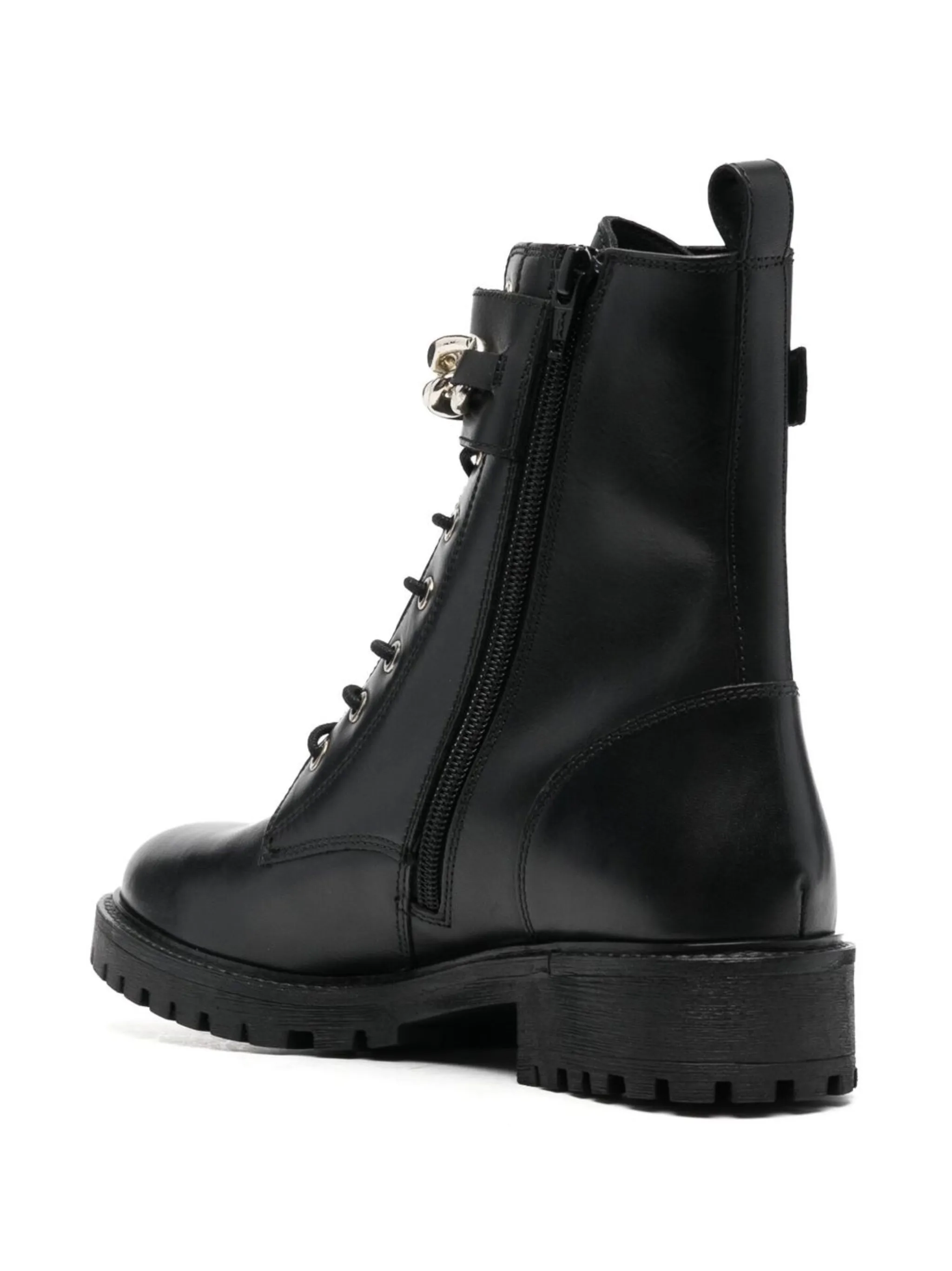 Черный, кожа, декоративные пряжки, цепочка, шнуровка спереди, застежка на молнии сбоку, закругленный носок, петля для подтягивания сзади, высота по щиколотку, стелька с логотипом и плоская резиновая подошва.