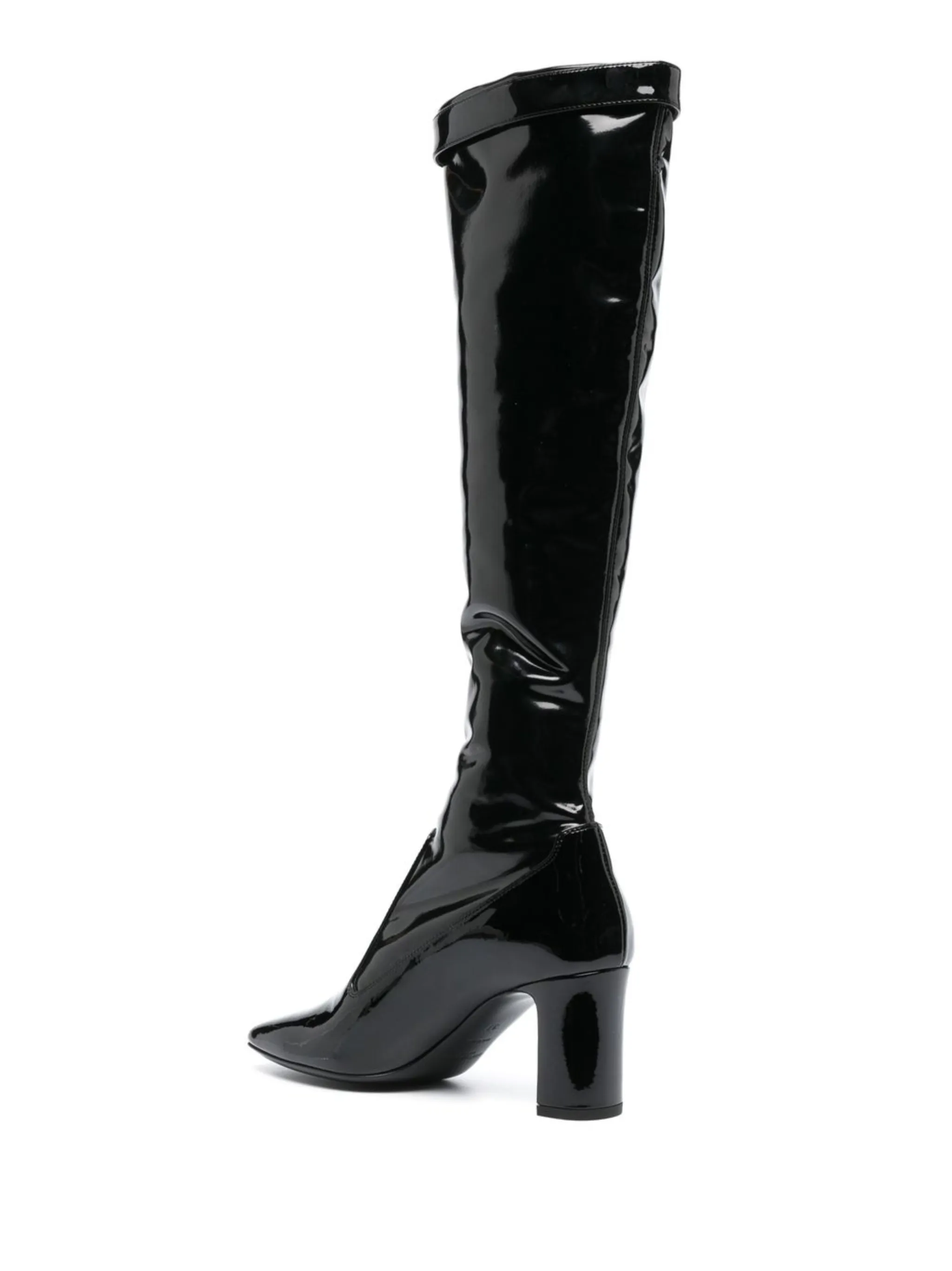Черный, телячья кожа, лакированная отделка, декоративная пряжка, украшения из горного хрусталя, квадратный носок, модель без застежки, высота по колено и блочный каблук средней высоты.