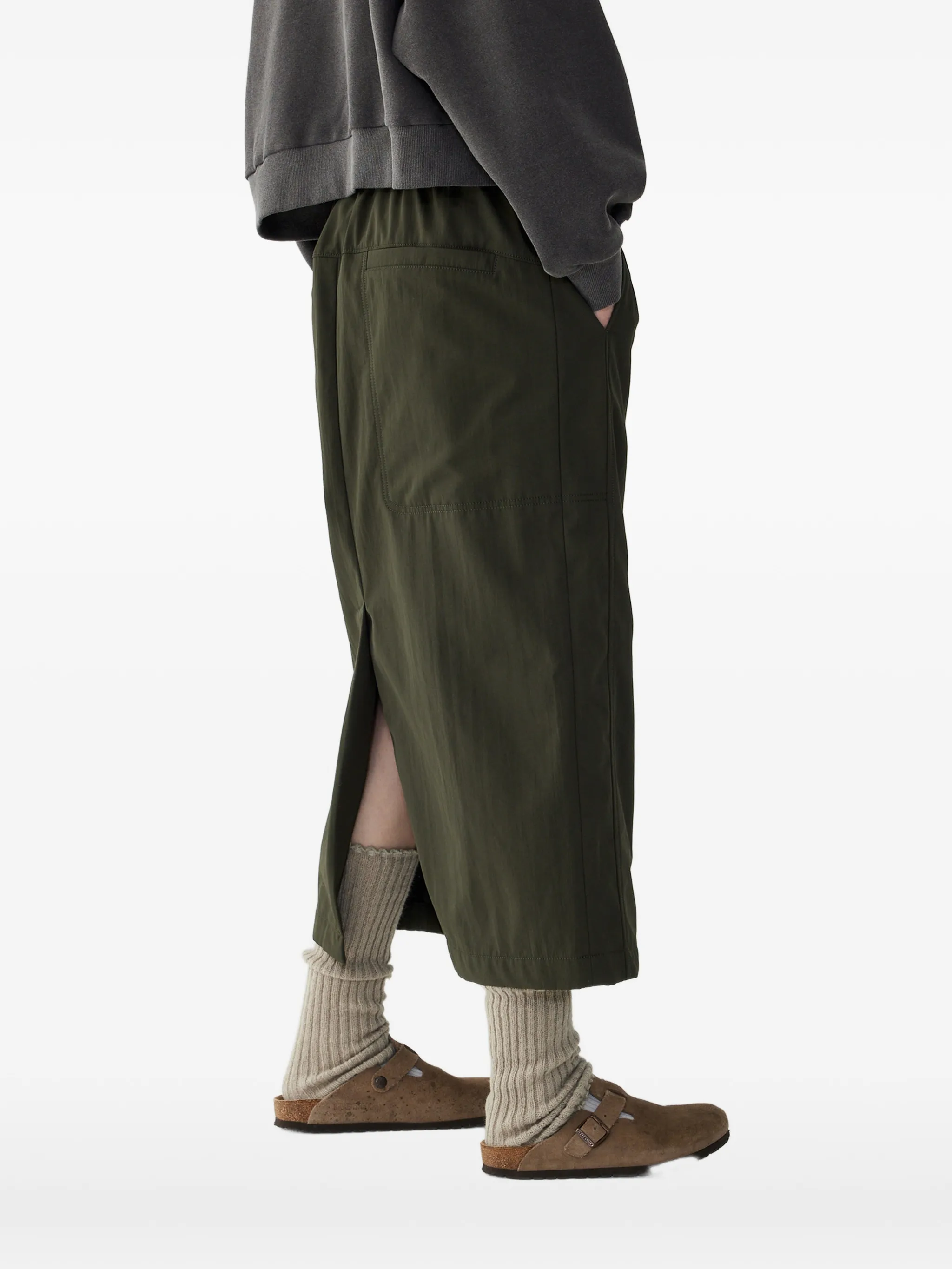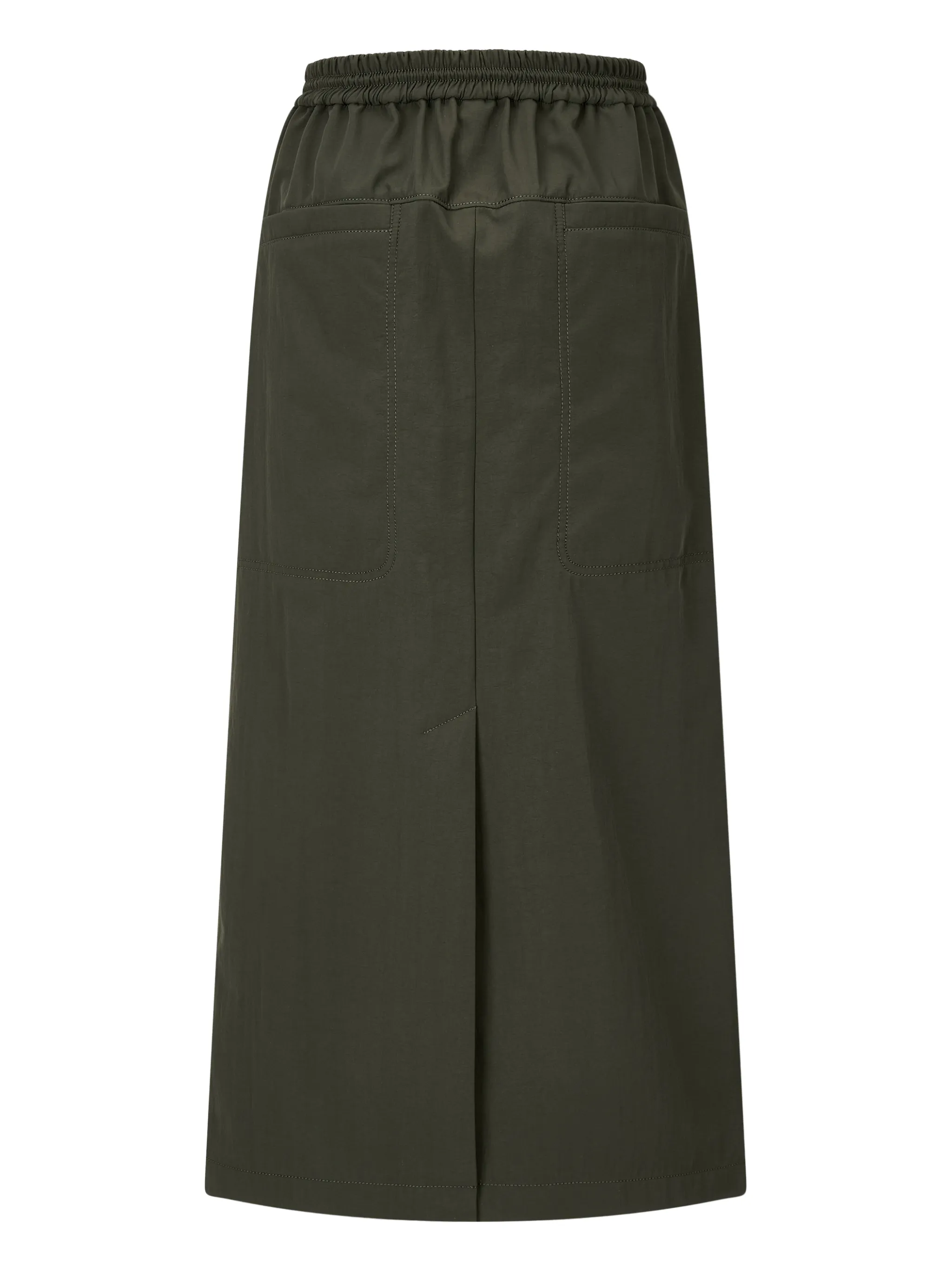 Эластичный пояс цвета хаки, задние накладные карманы, центральный разрез сзади, застежка на молнию