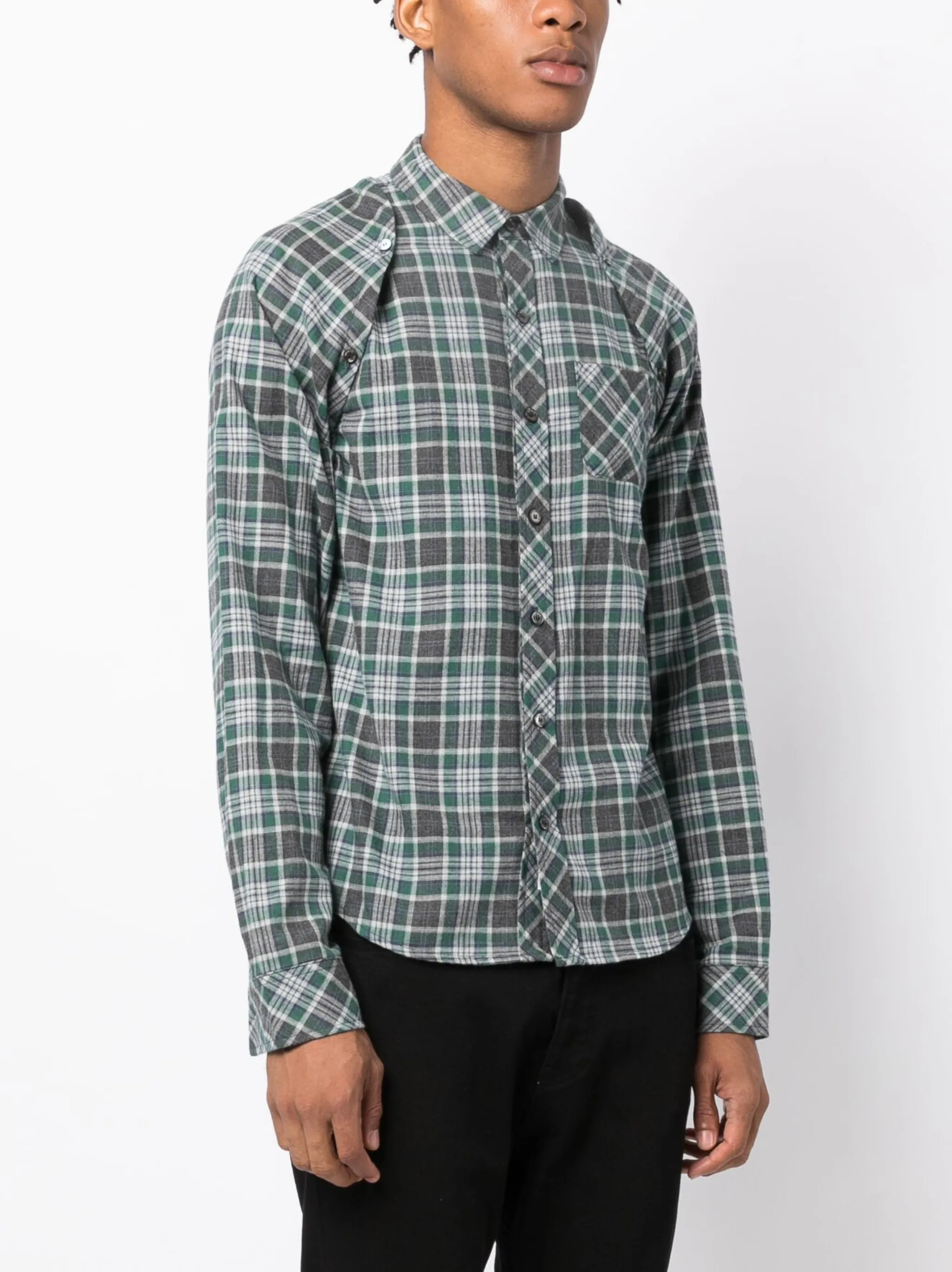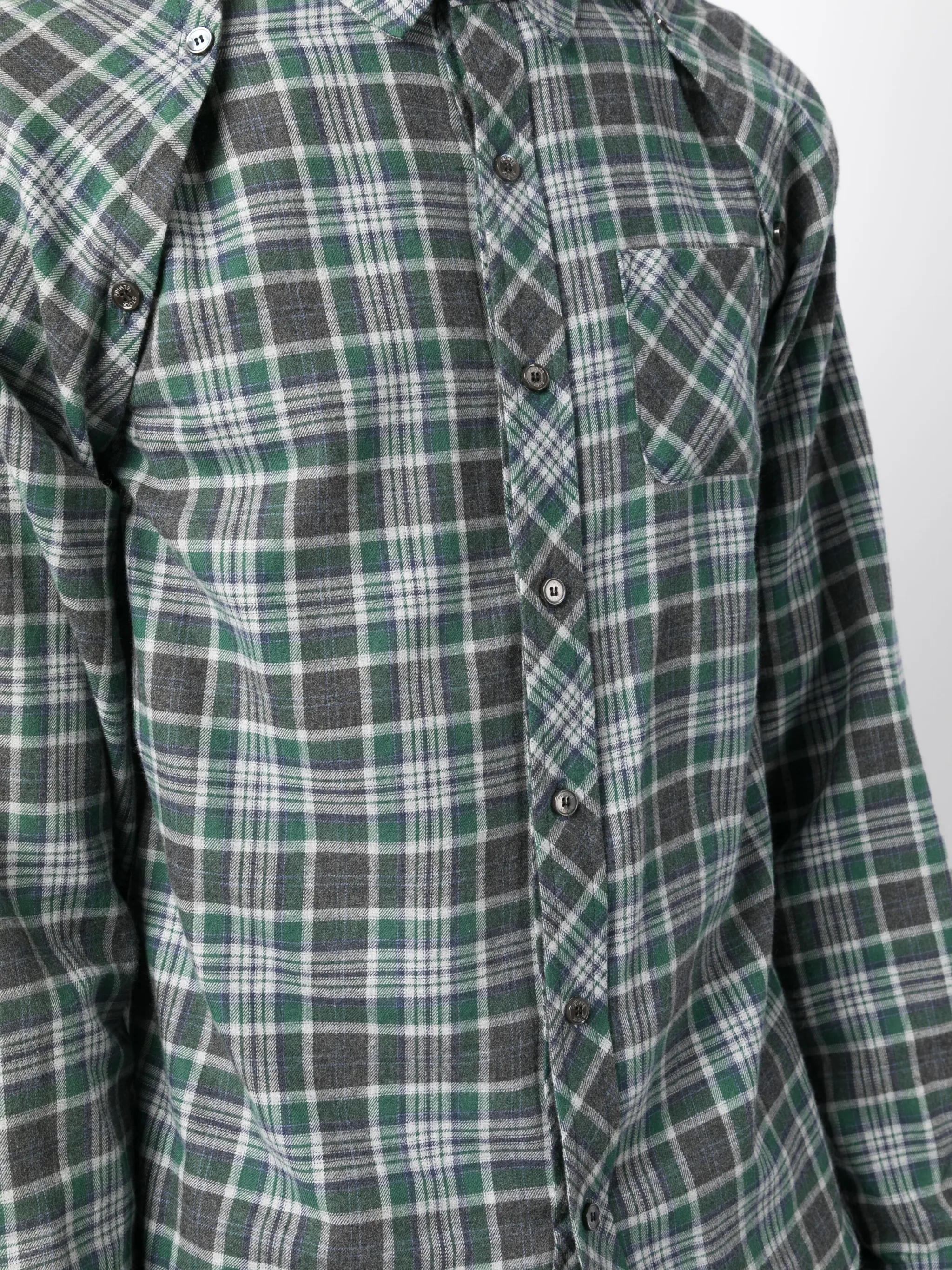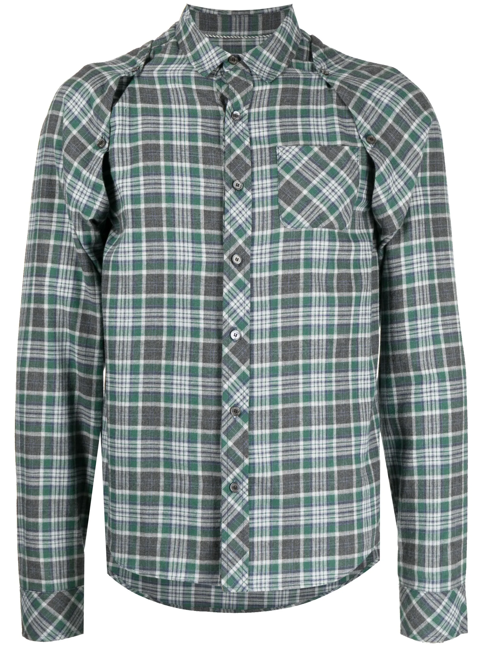 Темно-зеленый, разноцветный, хлопок, принт в клетку, классический воротник, застежка на пуговицах спереди, нагрудный накладной карман, съемные рукава, рукава с манжетами на пуговицах и закругленный подол.