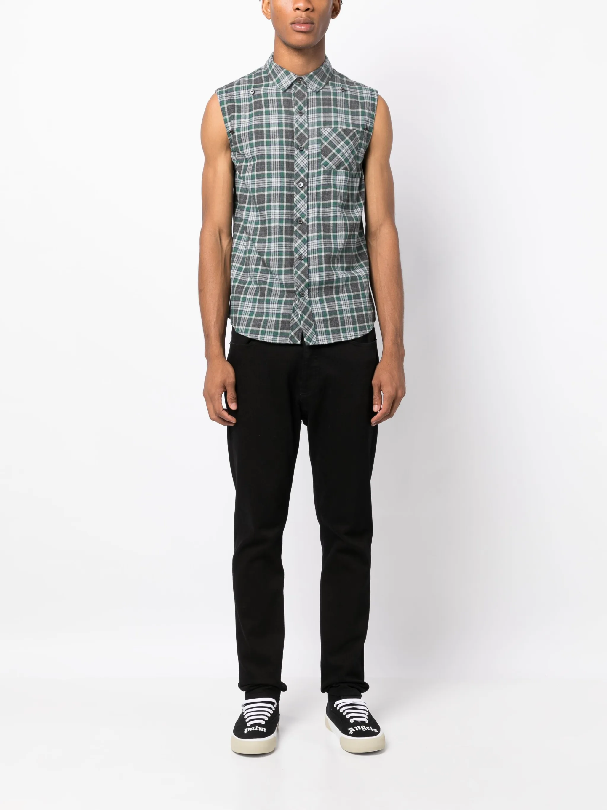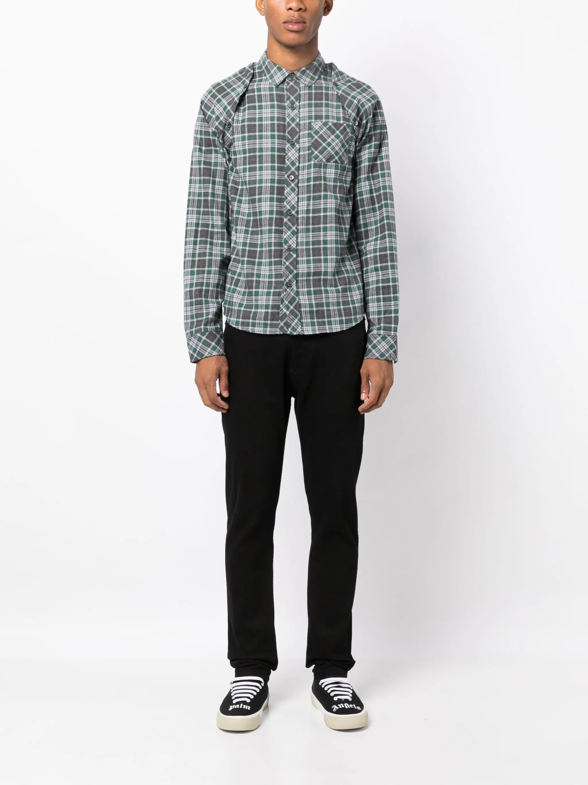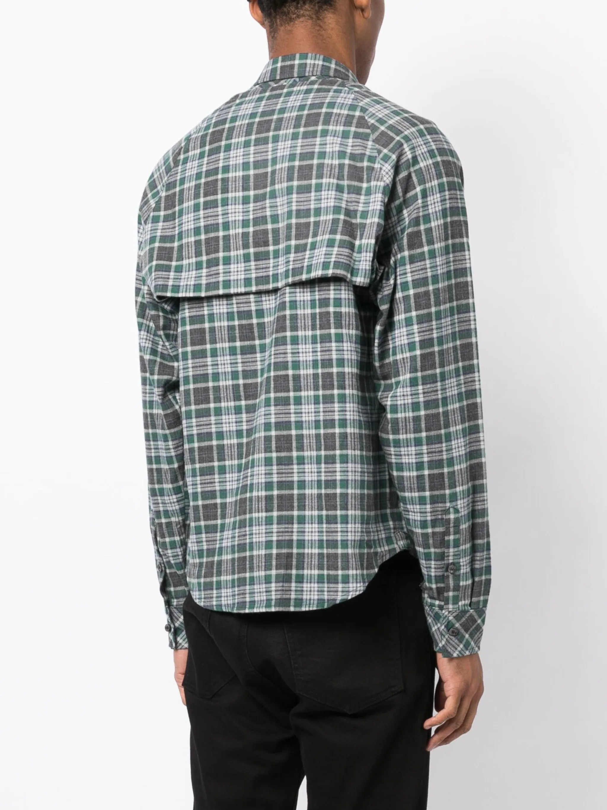 Темно-зеленый, разноцветный, хлопок, принт в клетку, классический воротник, застежка на пуговицах спереди, нагрудный накладной карман, съемные рукава, рукава с манжетами на пуговицах и закругленный подол.
