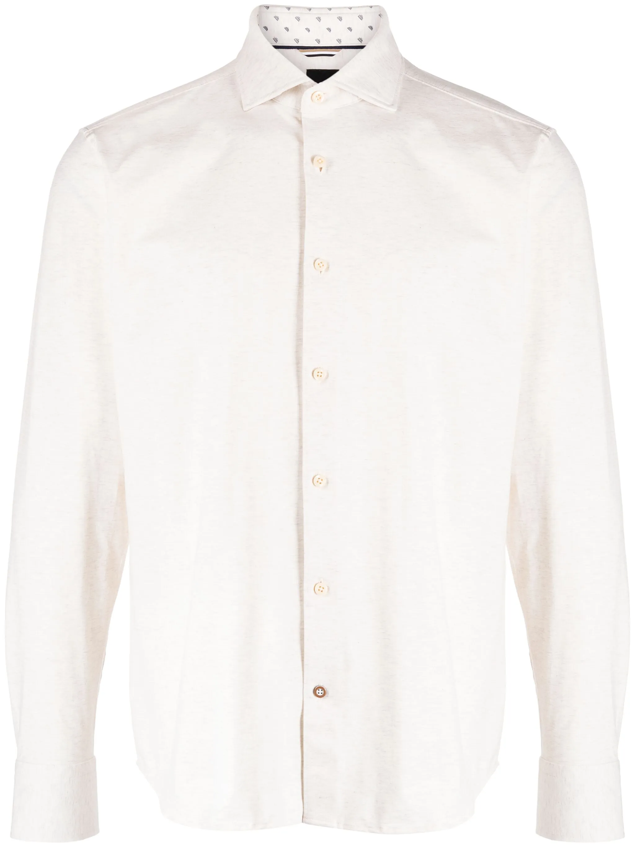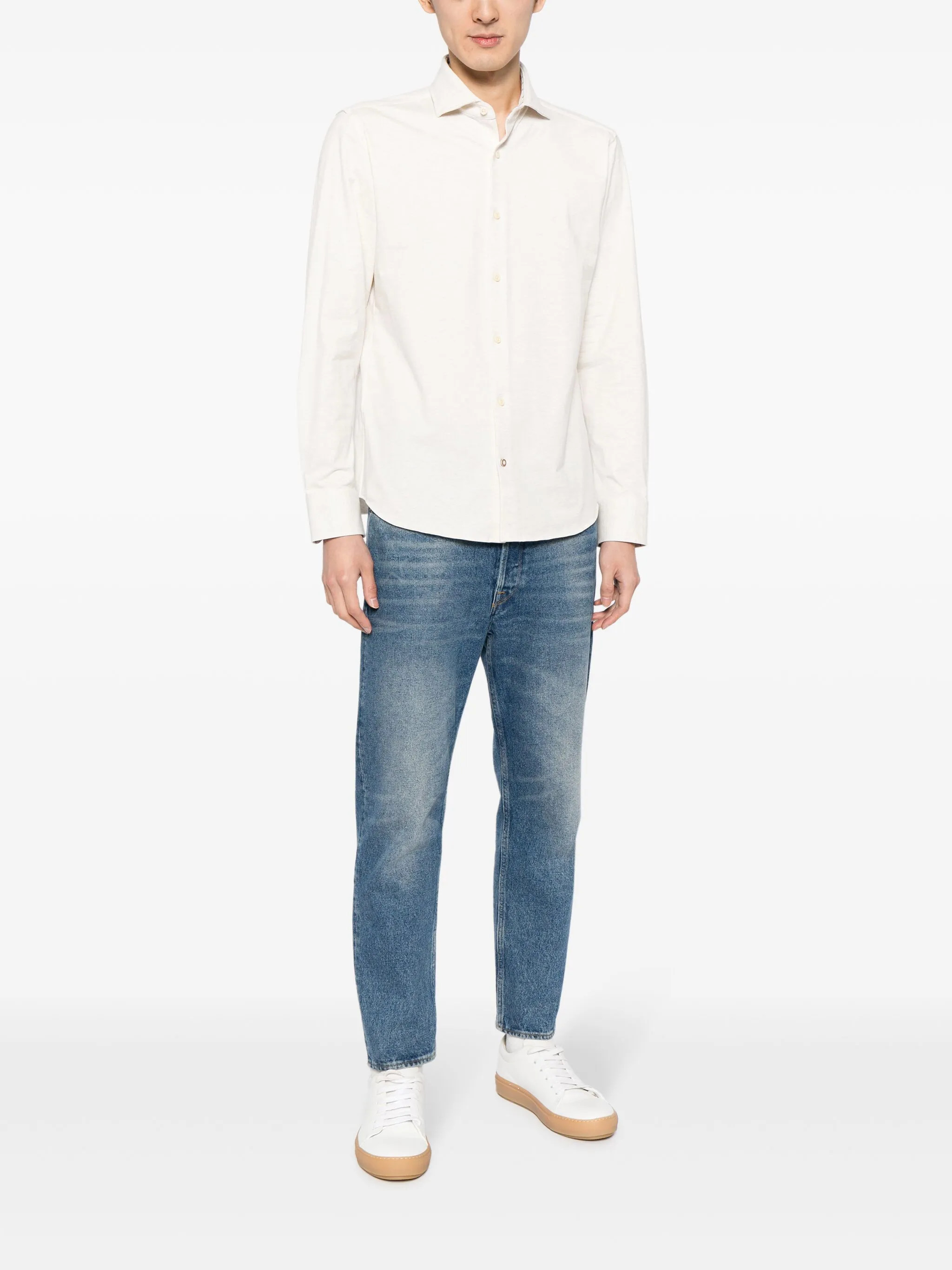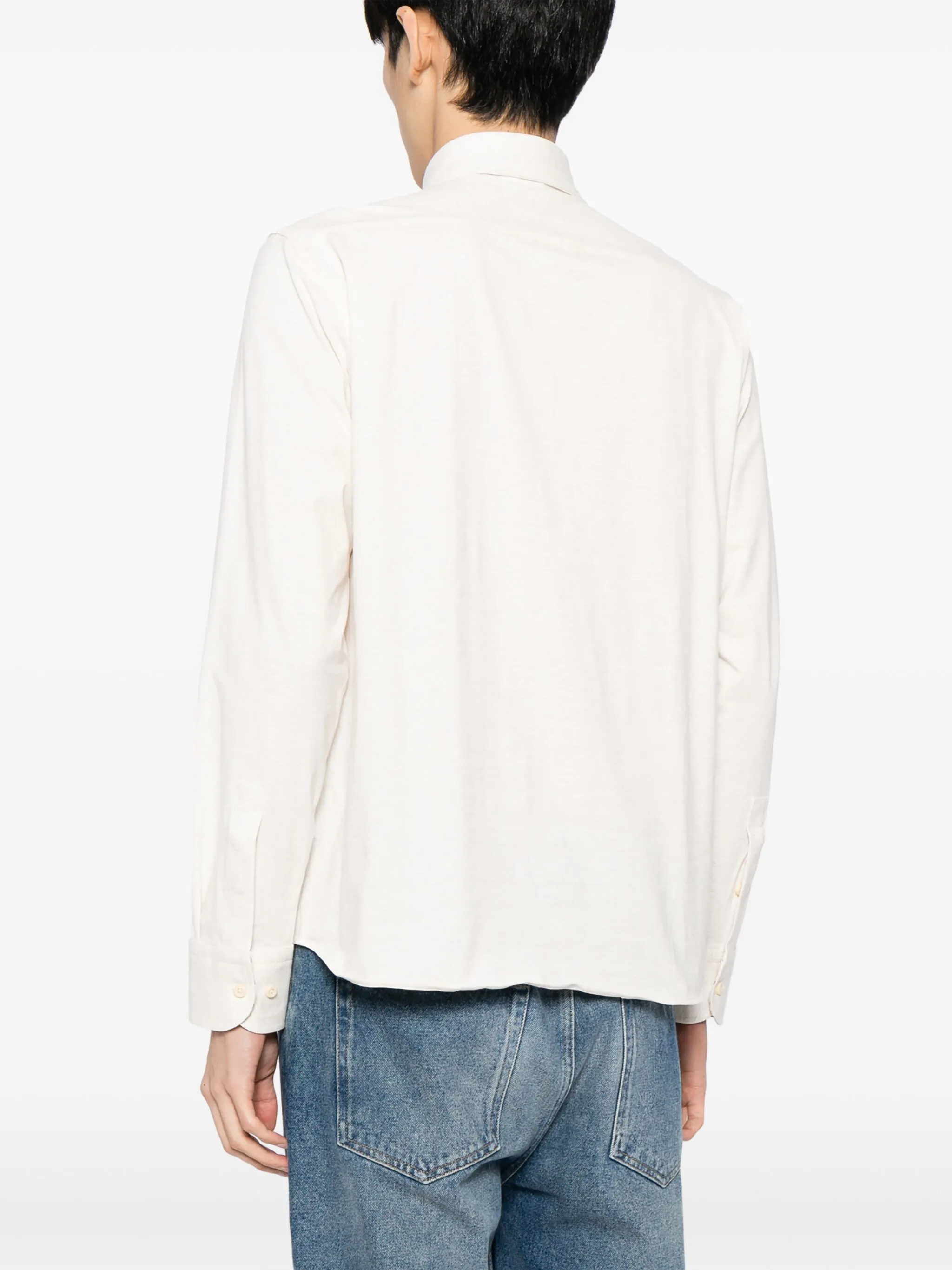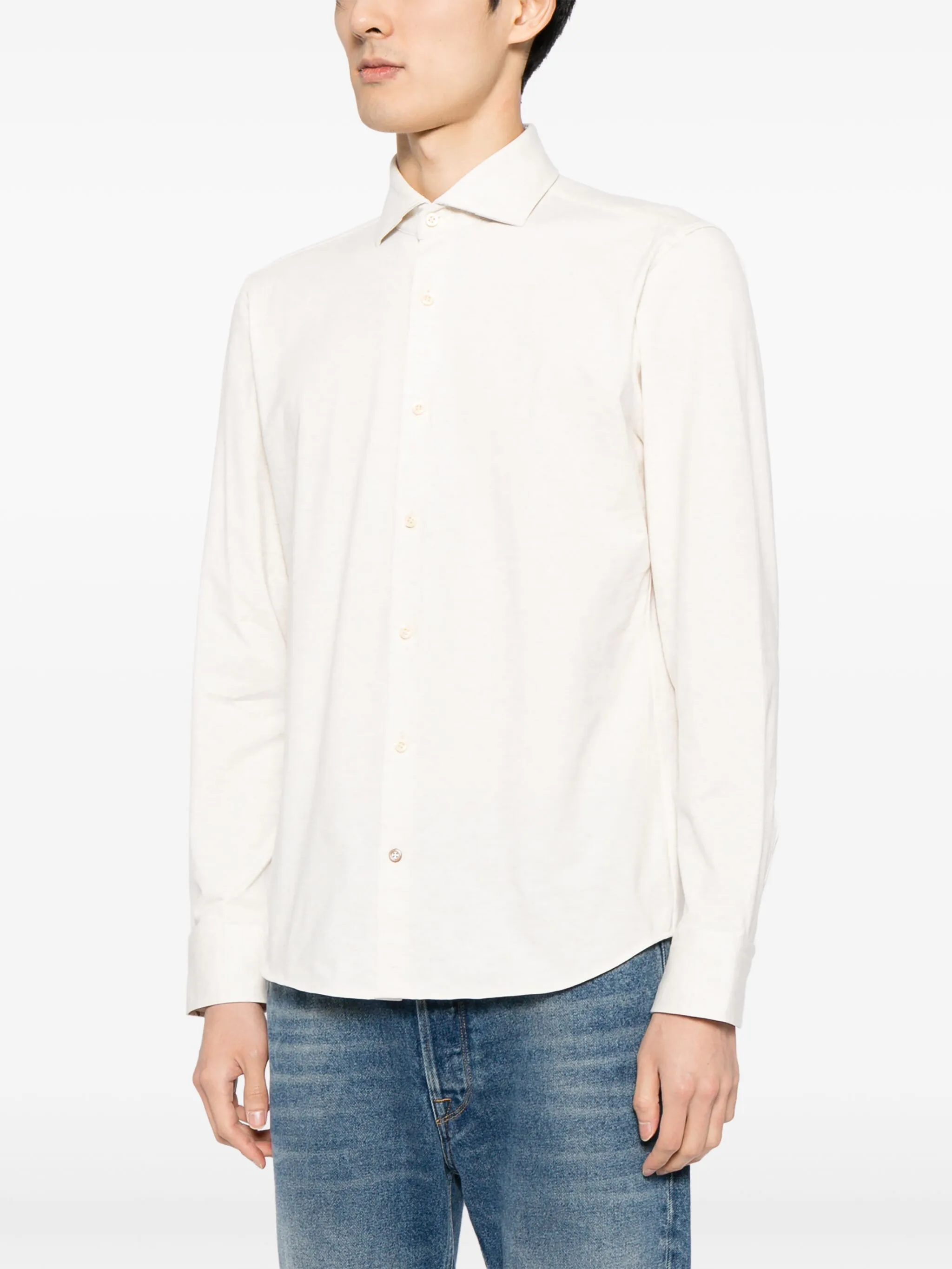 Кремово-белый, эластичный хлопок, ткань с твиловым переплетением, отложной воротник, застежка на пуговицах спереди, длинные рукава, манжеты на пуговицах и закругленный подол.