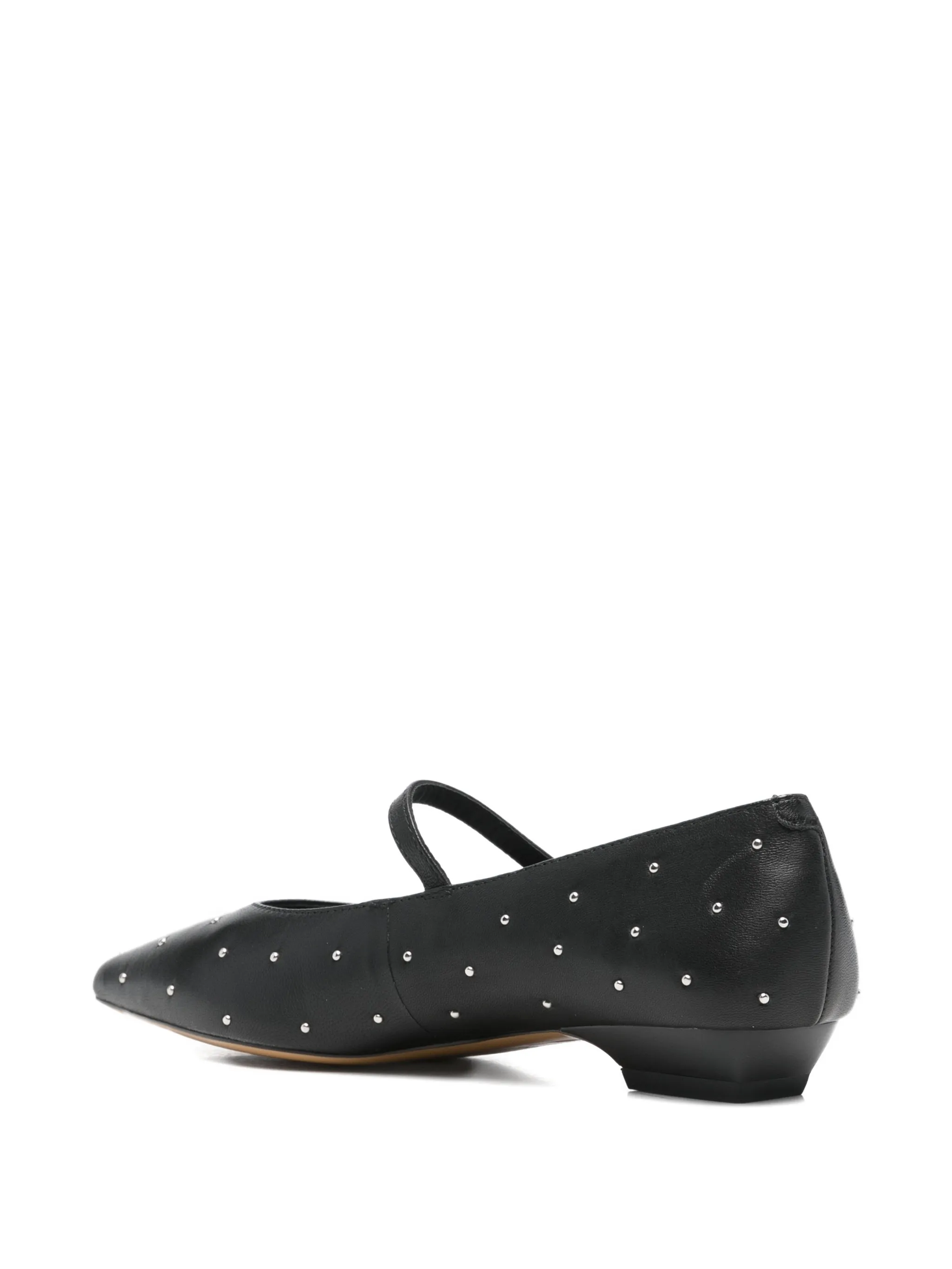 Черный ремешок с украшением-шпилькой, заостренный носок, блокирующая пятка с пряжкой.