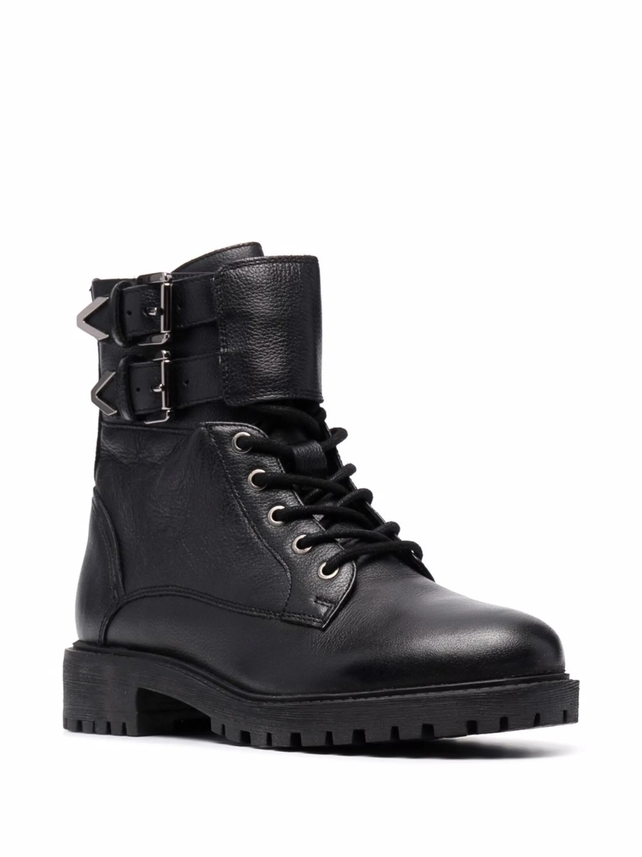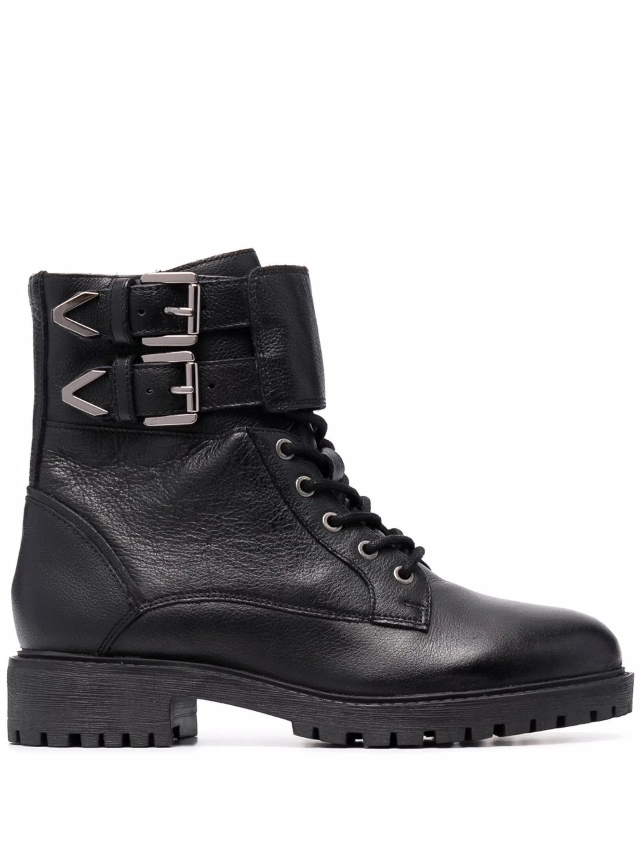 Массивная резиновая подошва, шнуровка спереди, закругленный носок, боковые застежки с пряжками и застежка на молнии сбоку. Цвет: черный.