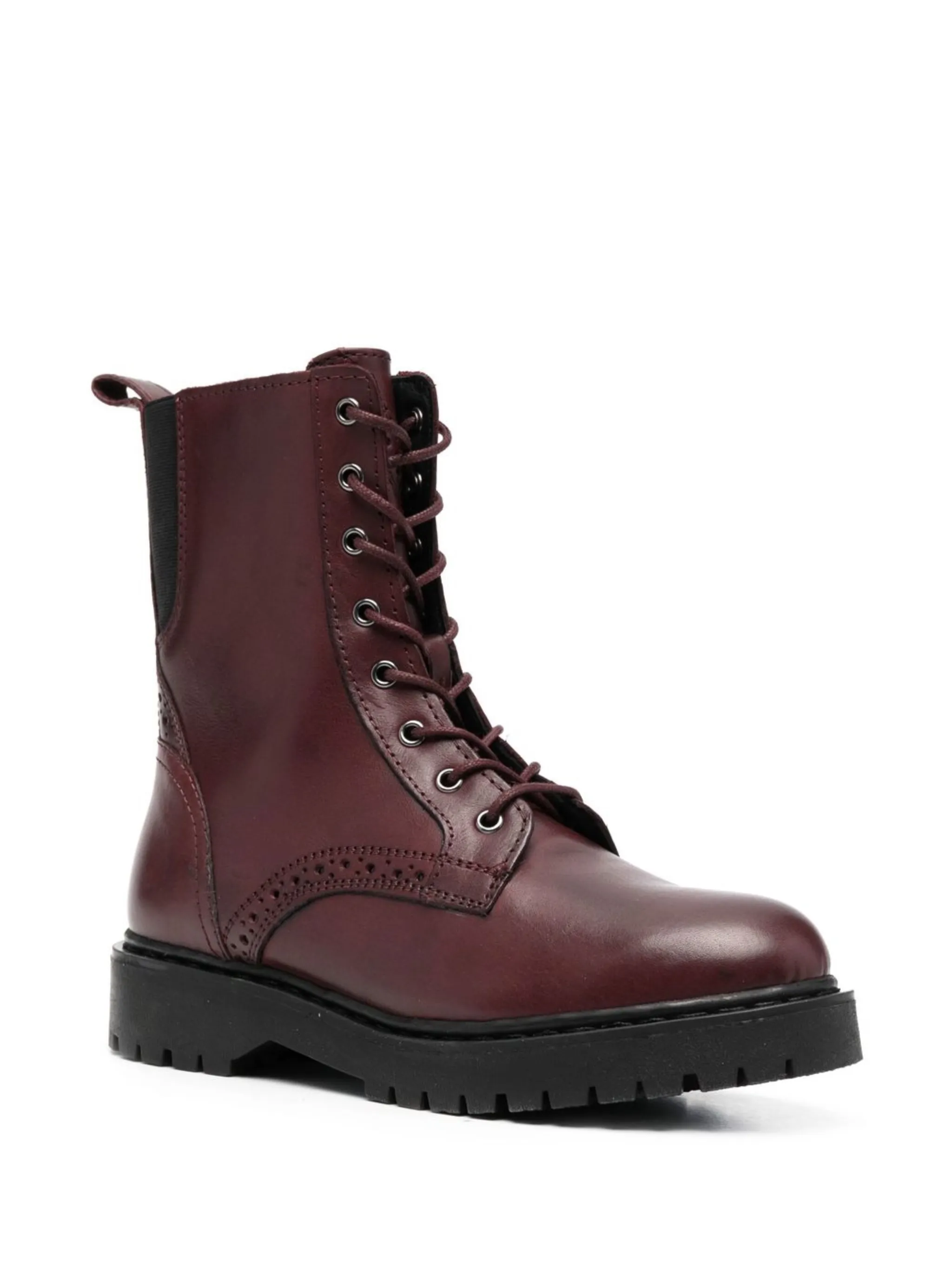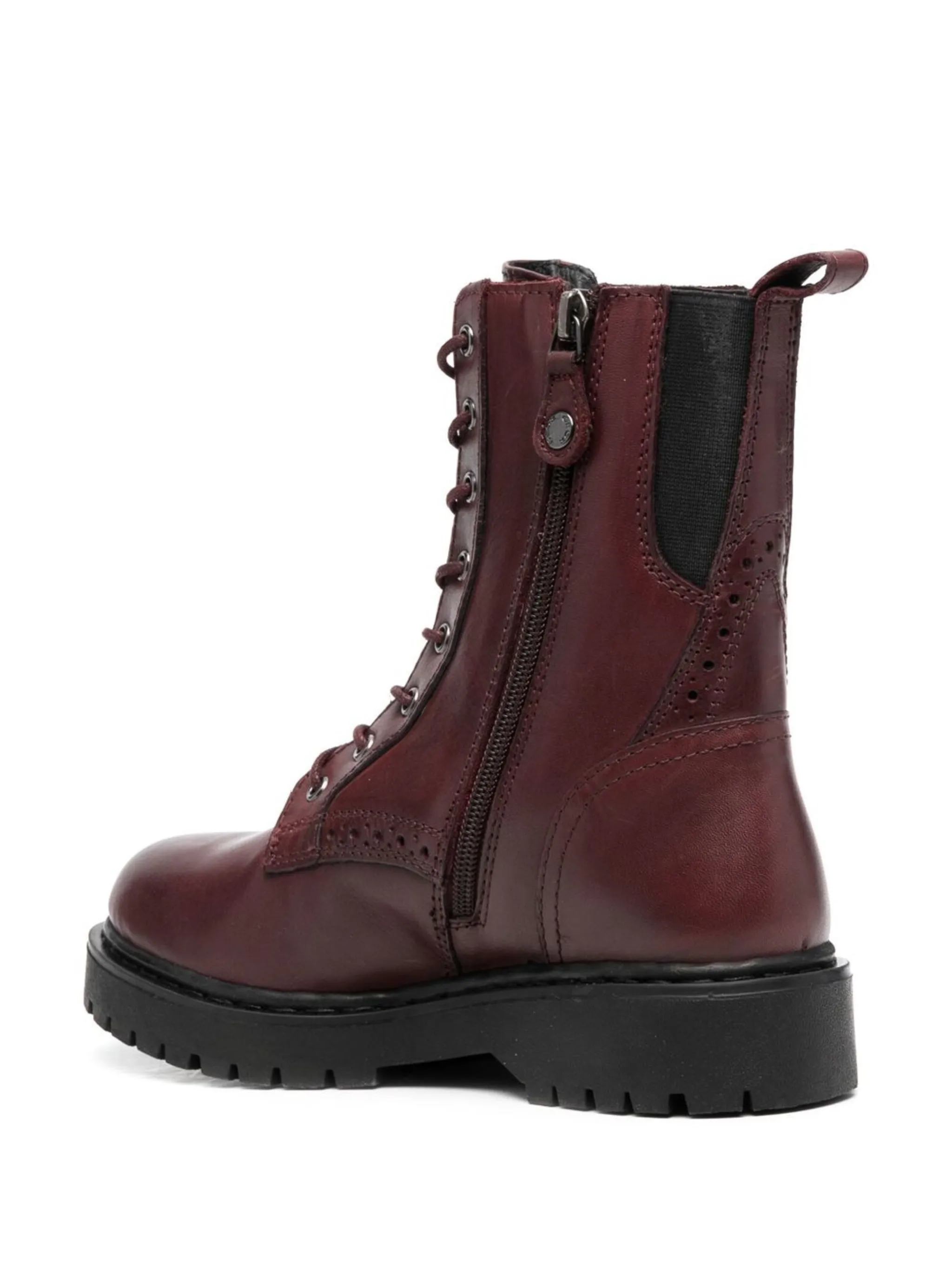 Бордовый, телячья кожа, глянцевая фактура, перфорация, эластичные боковые вставки, высота по щиколотку, застежка на молнии сбоку, шнуровка спереди, петля для подтягивания сзади, закругленный носок, рифленая резиновая подошва и низкий каблук.