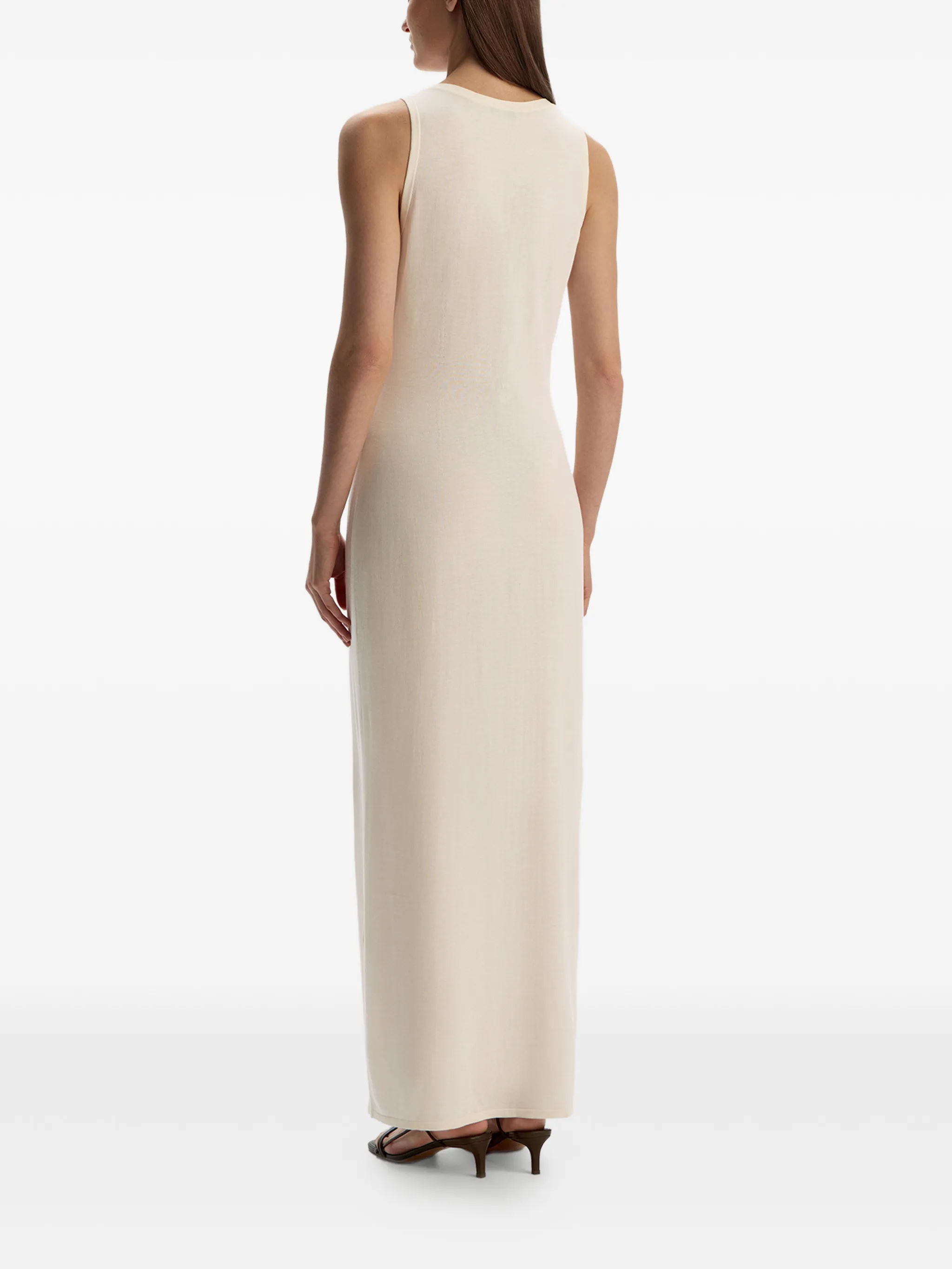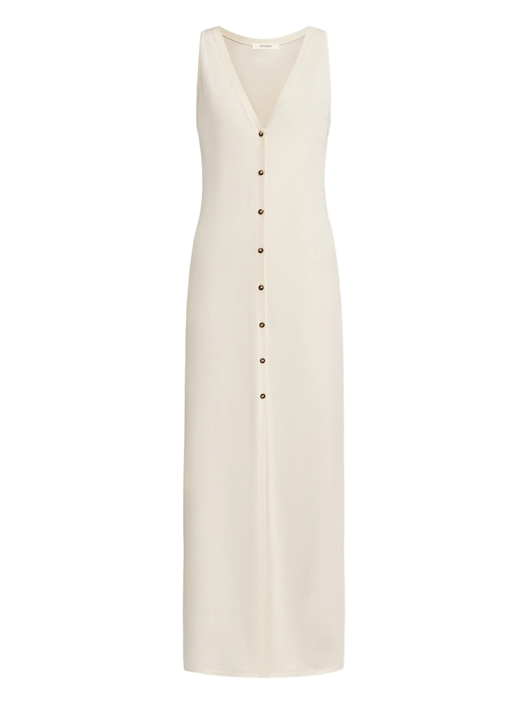 Светло-бежевый V-образным вырезом без рукавов на пуговицах с разрезом спереди, длина макси