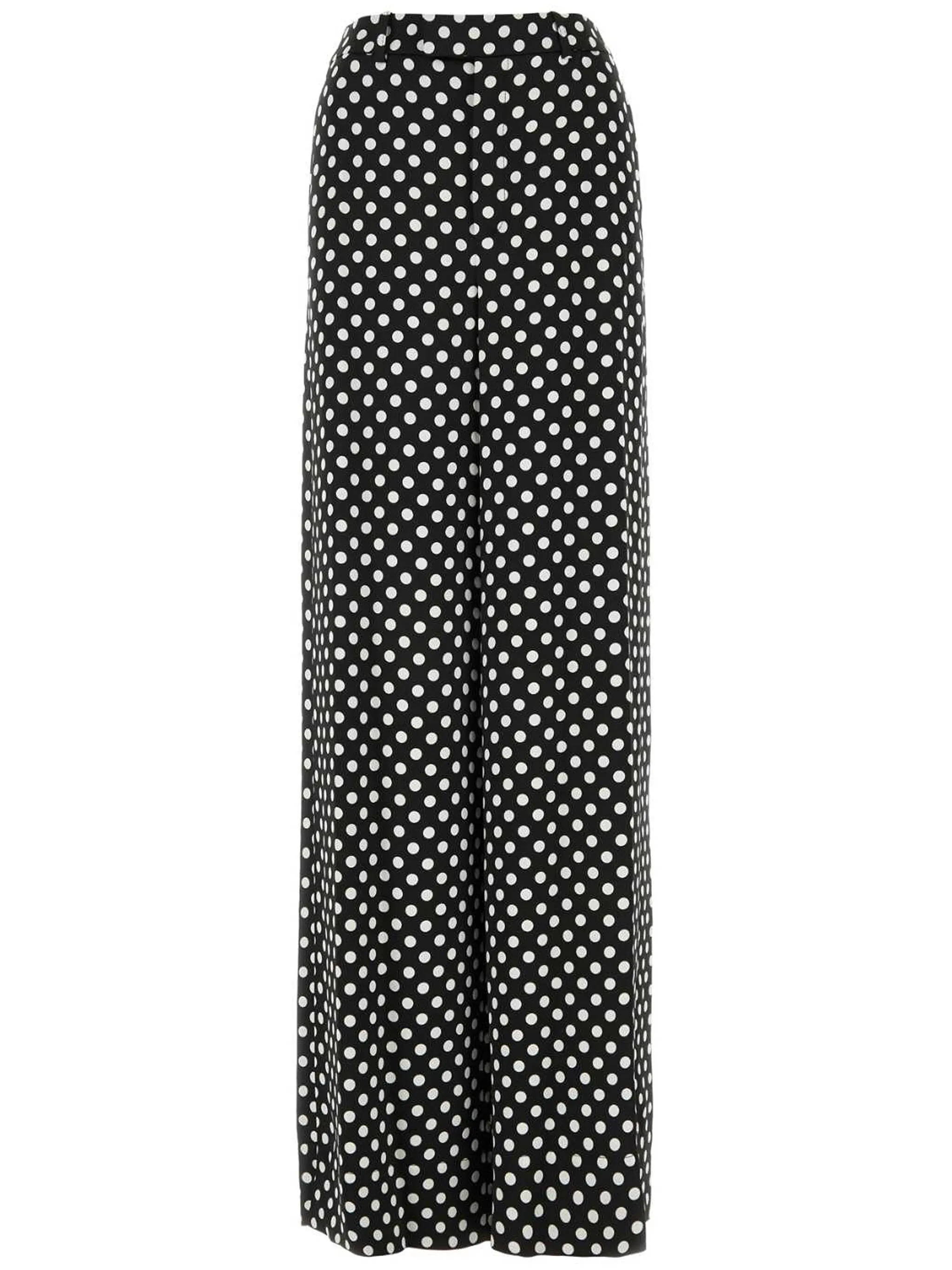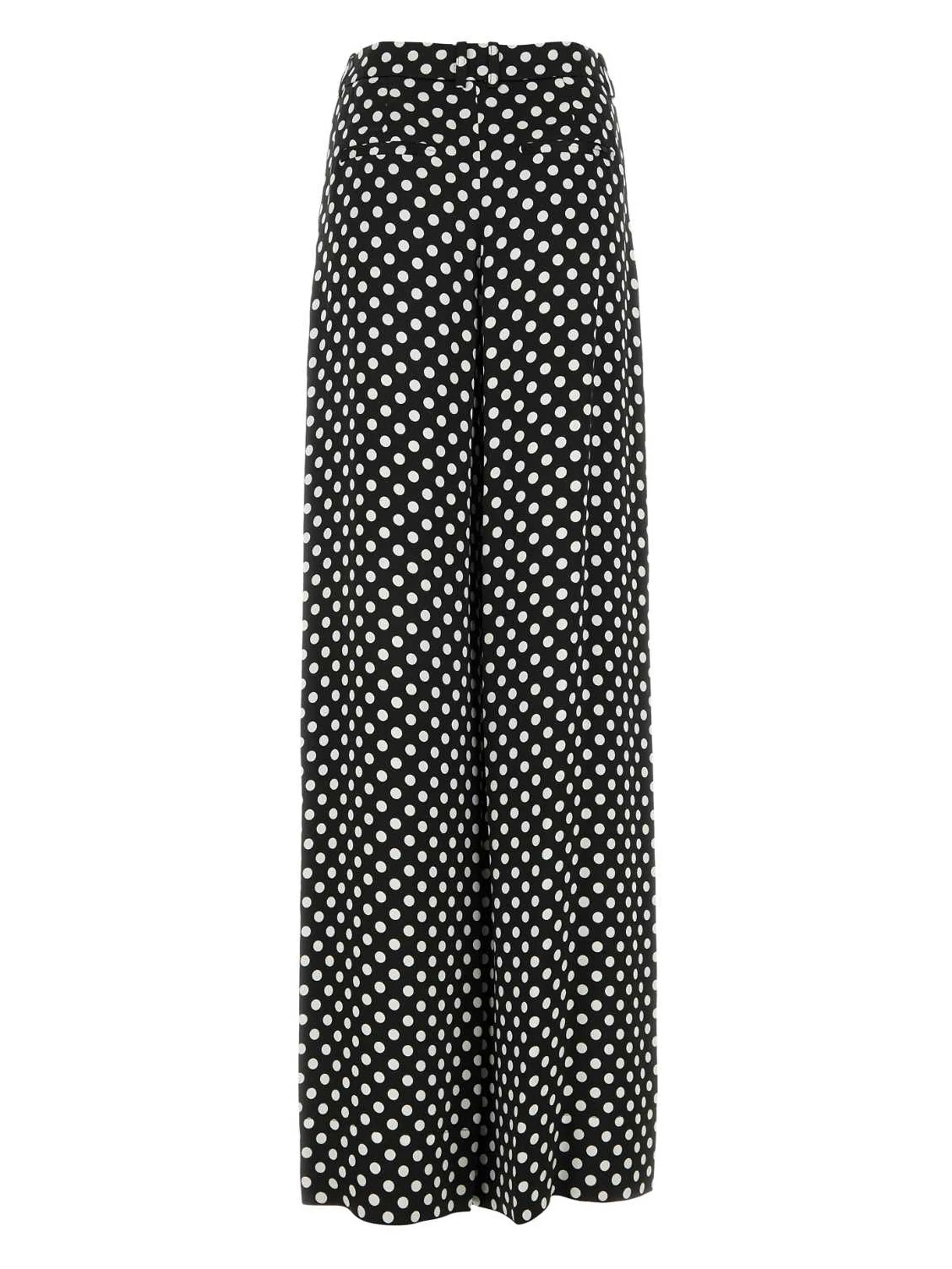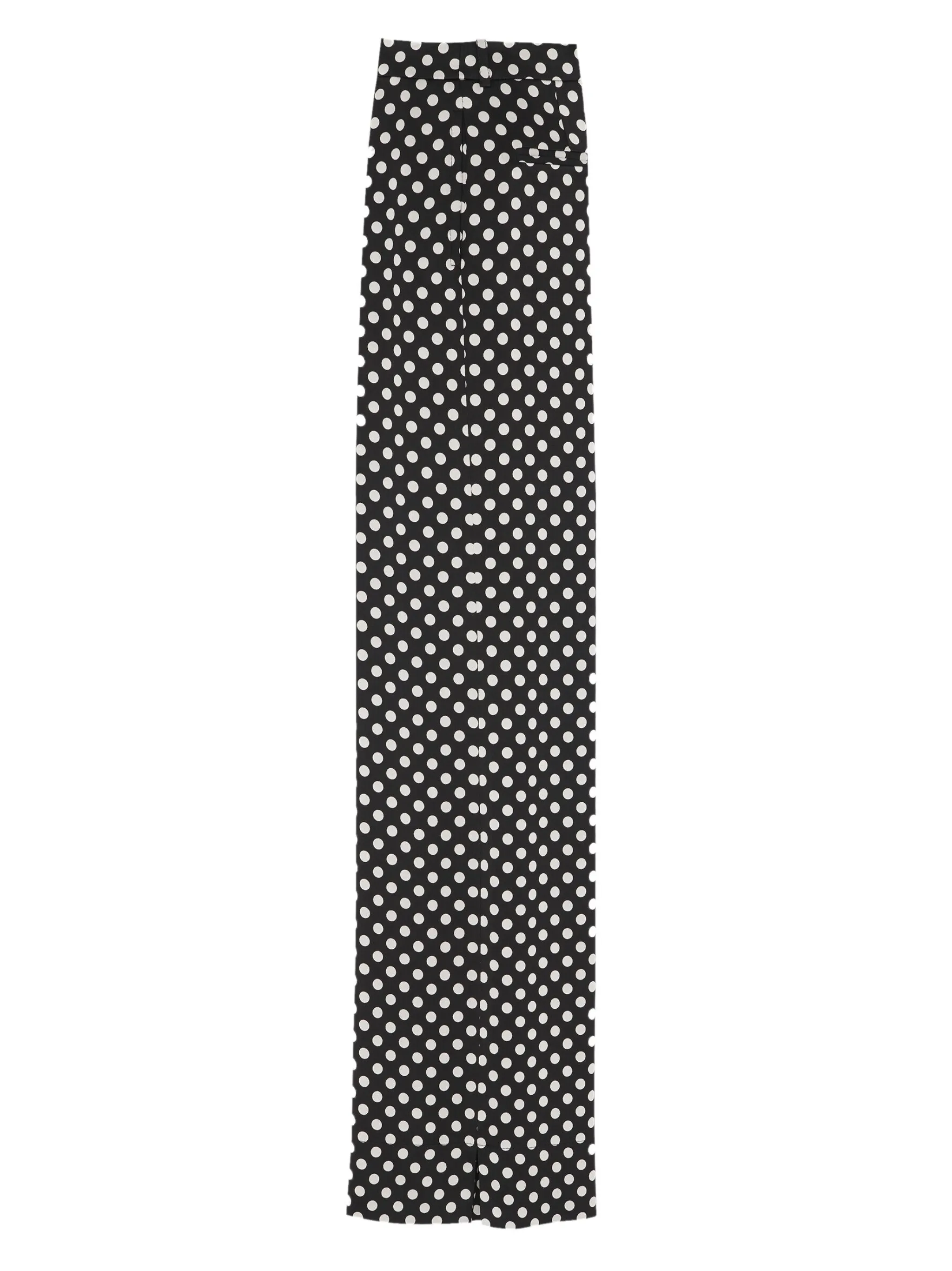 Черный/белый, шелк, принт в горох, прямой крой, потайная застежка спереди, петли для ремня, два вшитых кармана по бокам и петли для ремня.