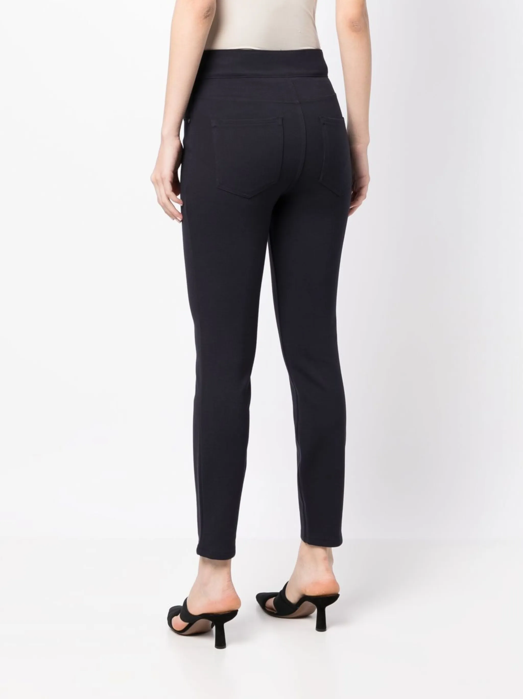 Темно-синий, эластичный пояс, укороченная длина и эластичный материал.