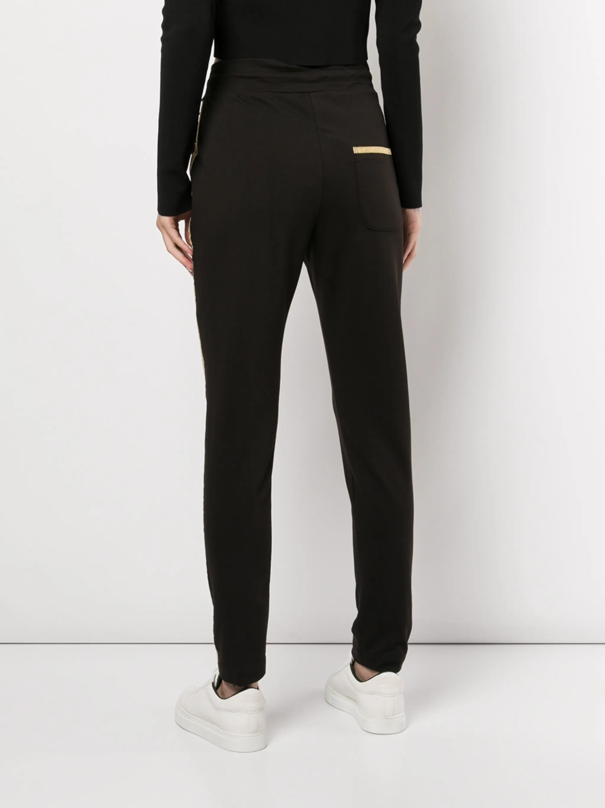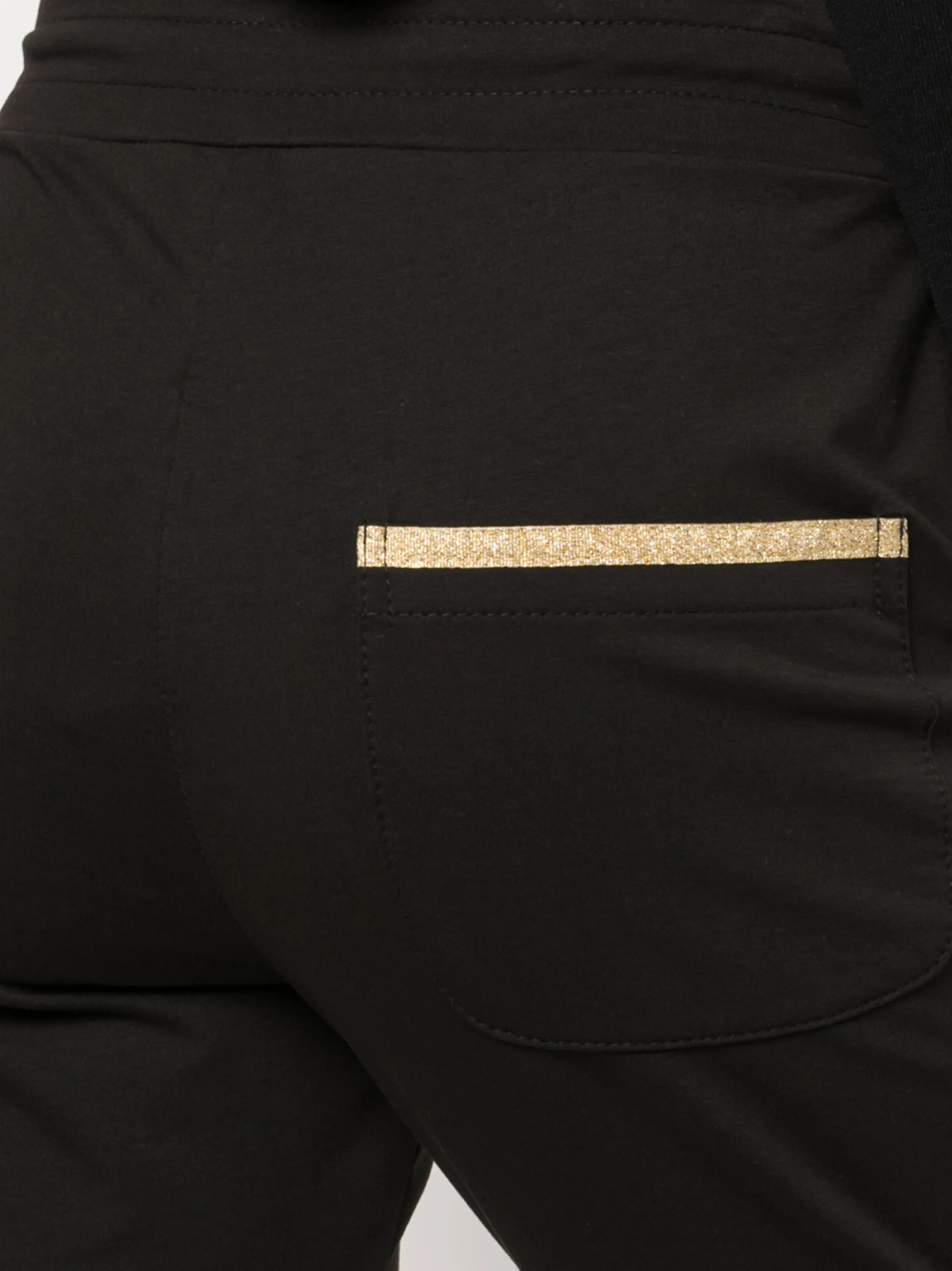 Полоска сбоку, кулиска на талии, накладной карман сзади и узкий крой. Цвет: черный.