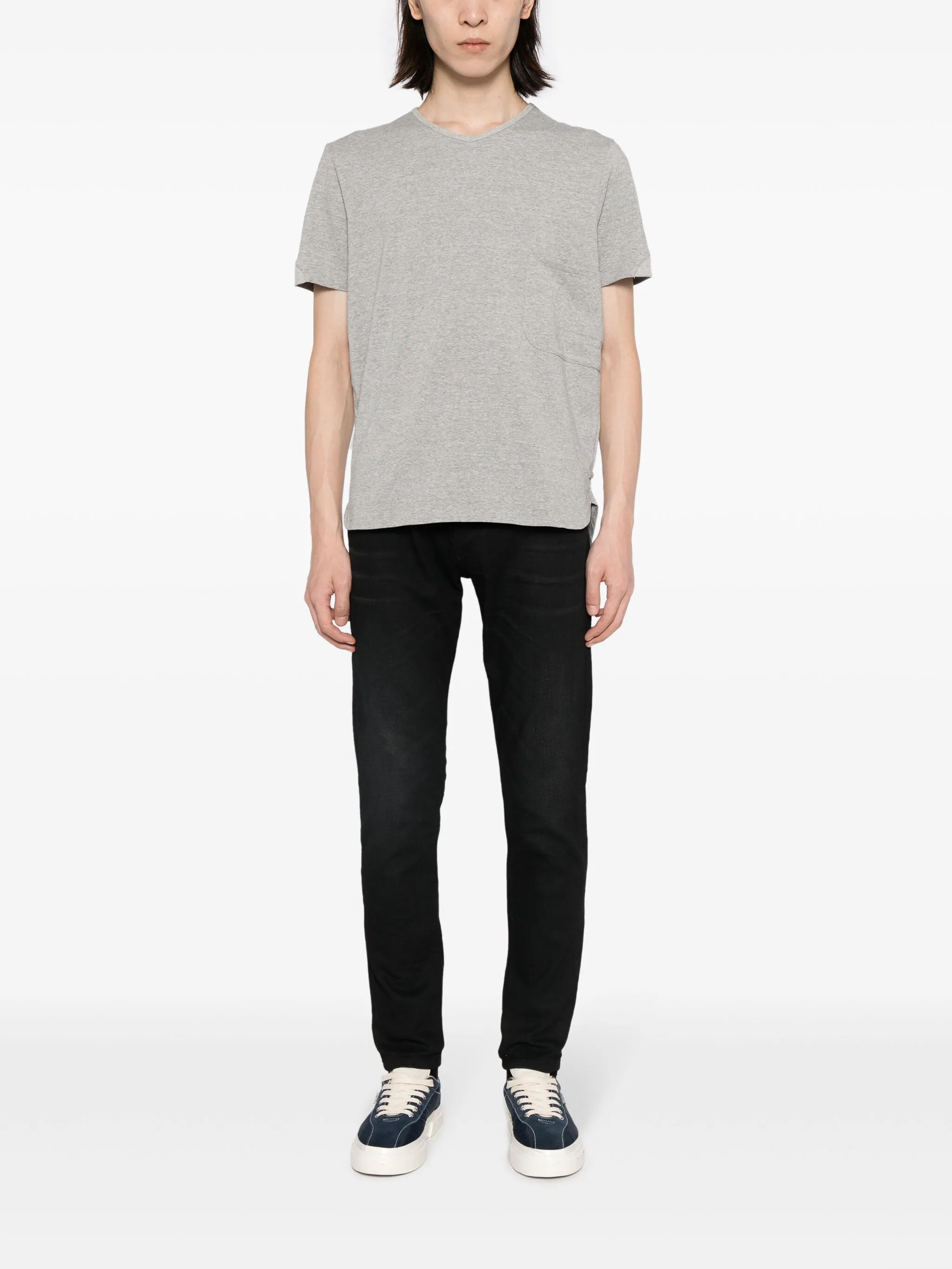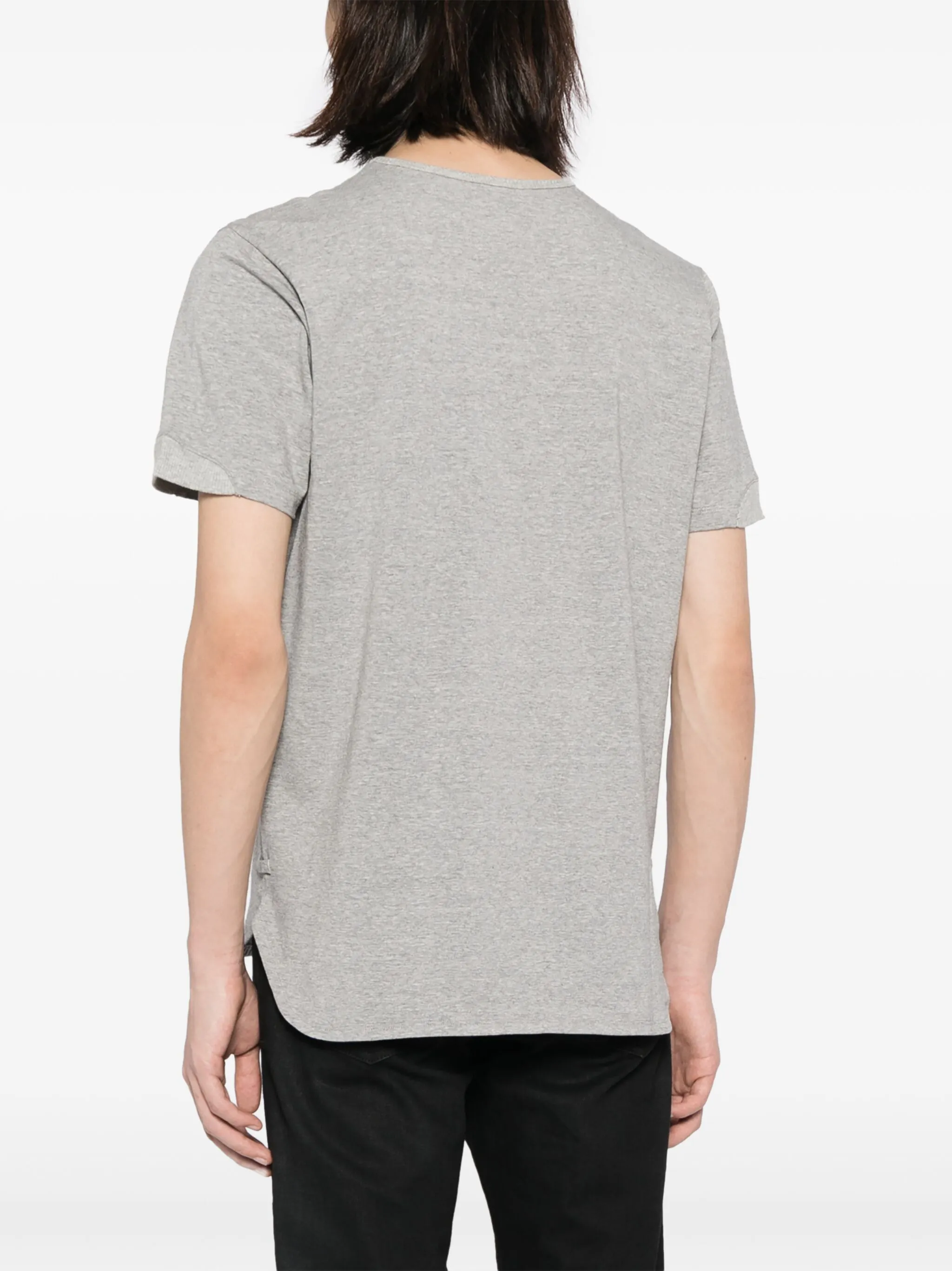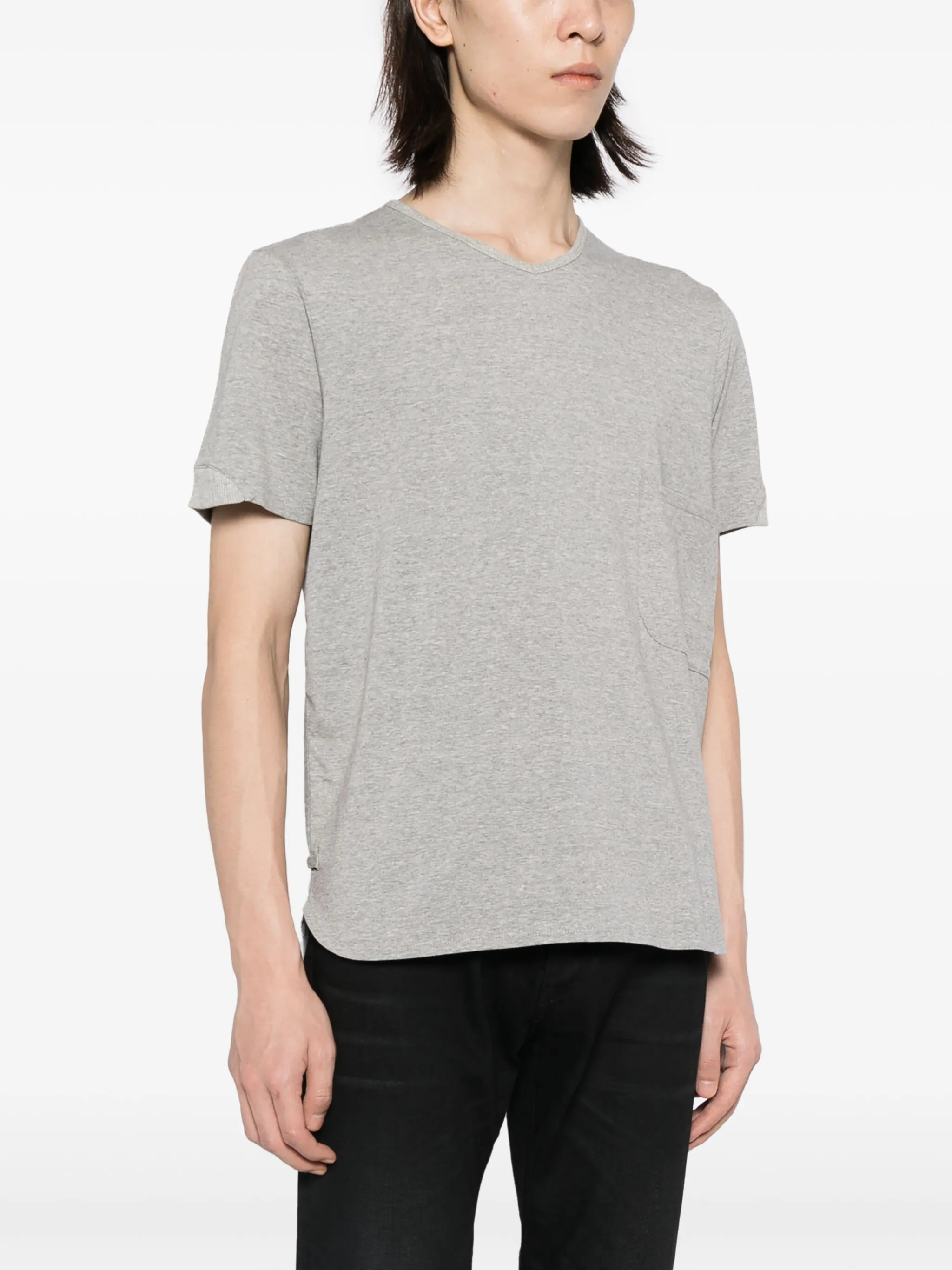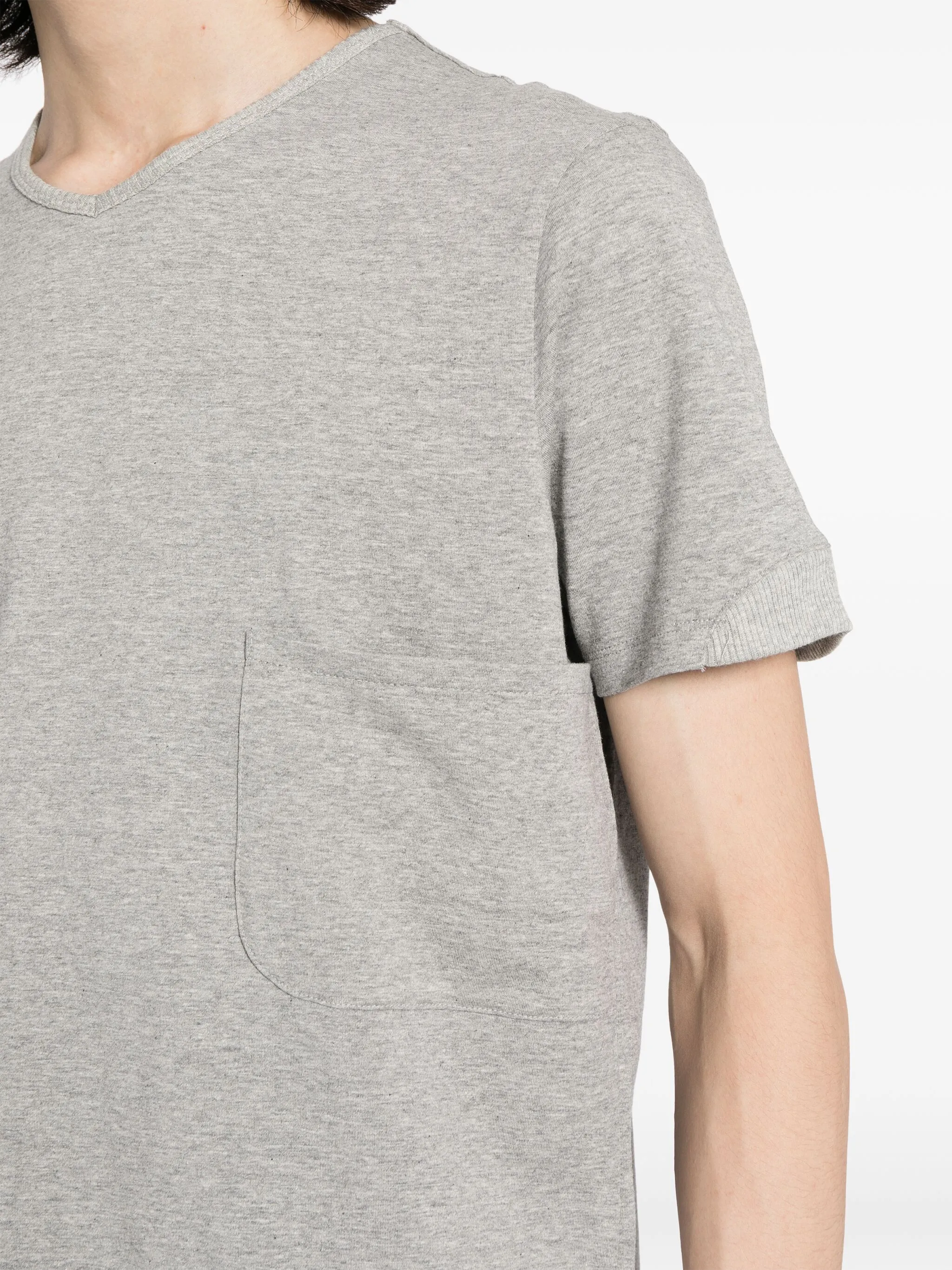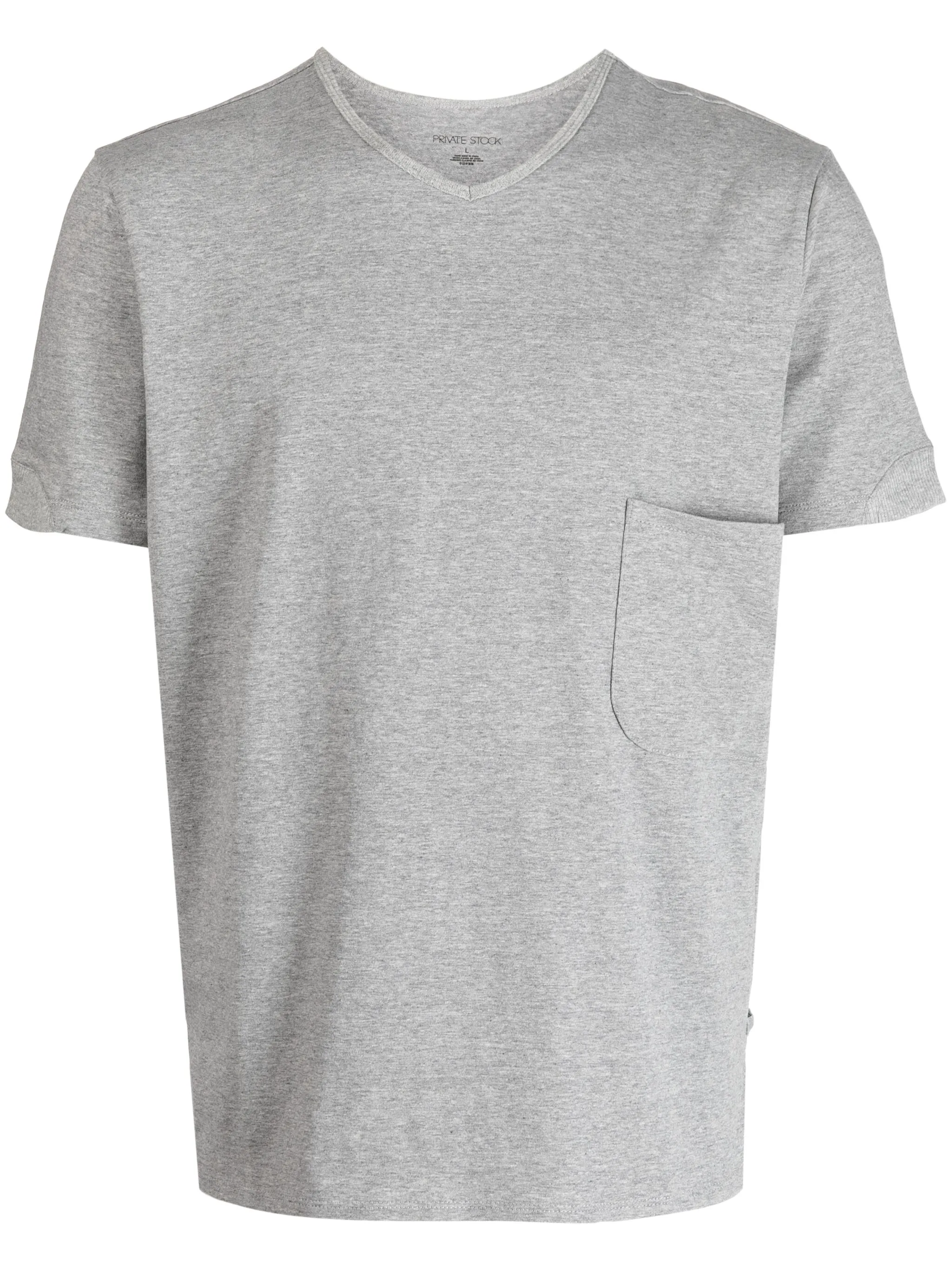 Серый, эластичный хлопок, ткань джерси, V-образный вырез, короткие рукава, нагрудный накладной карман и прямой подол.