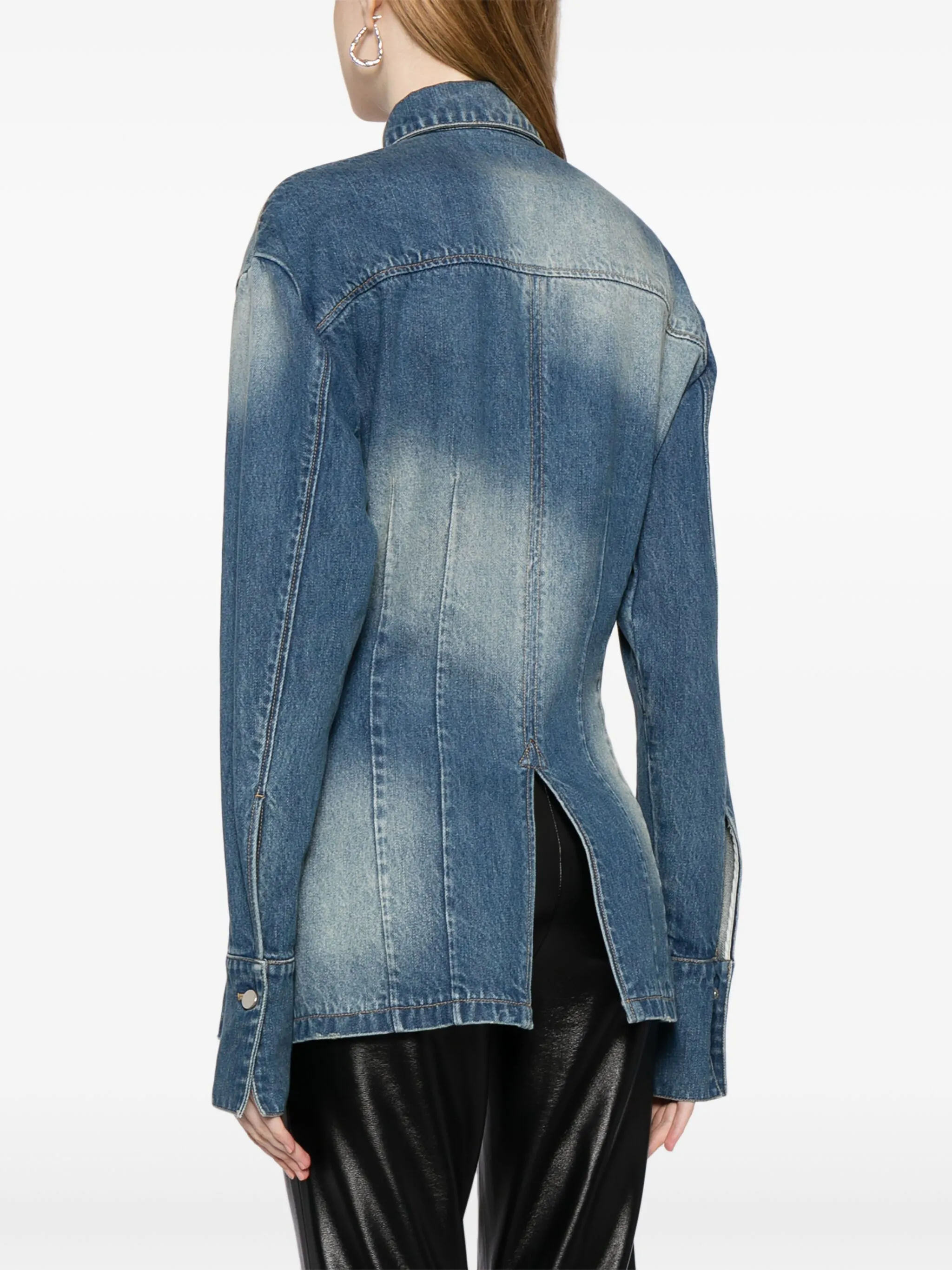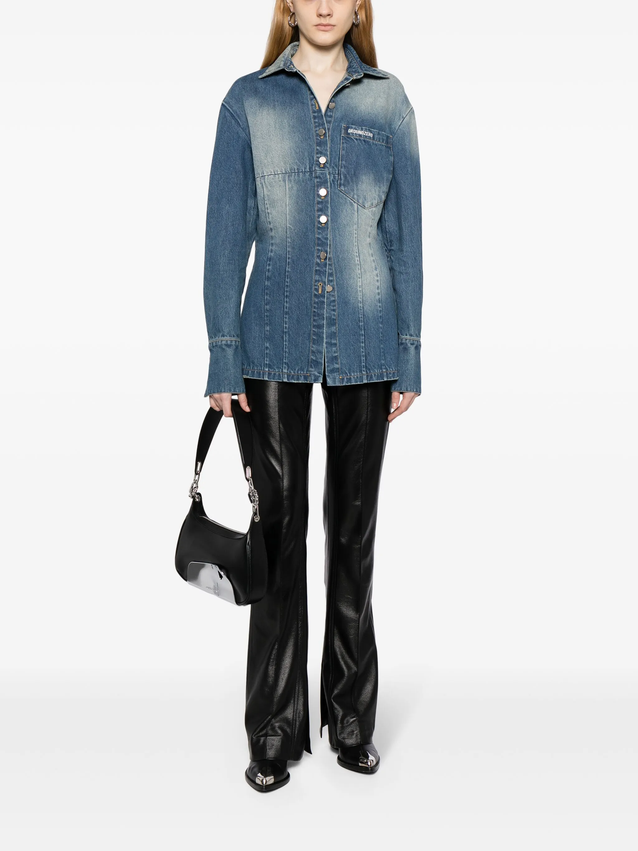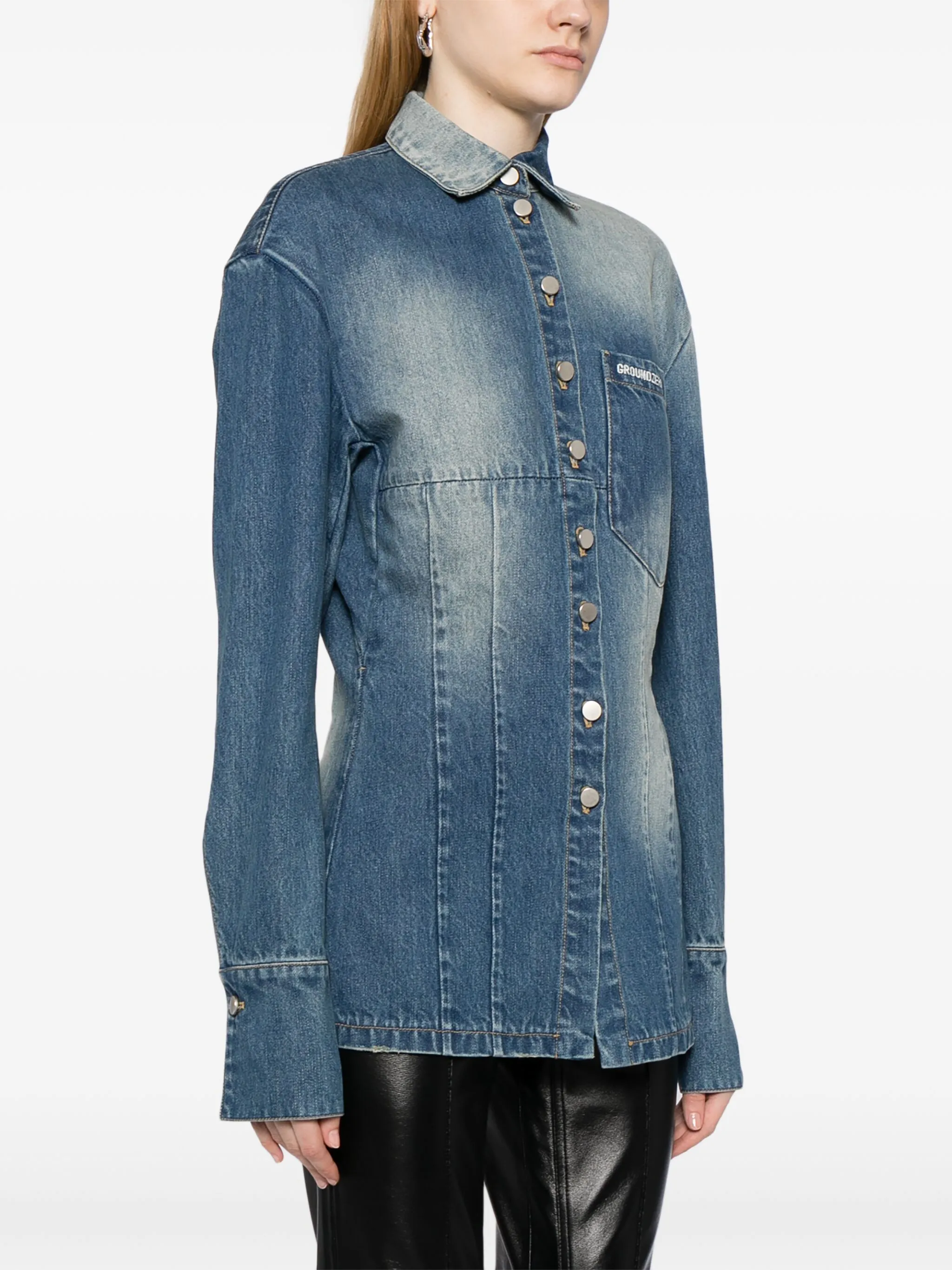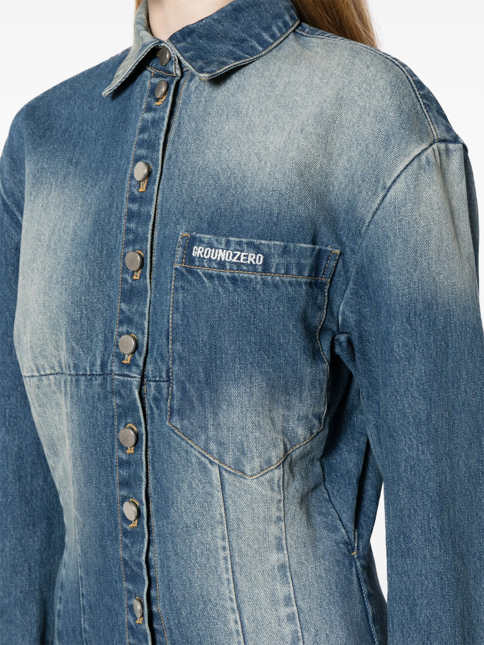 Индиго, хлопок, обработанный деним, вышитый логотип на груди, классический воротник, застежка на пуговицах спереди, нагрудный накладной карман, длинные рукава, манжеты на пуговицах и прямой подол.