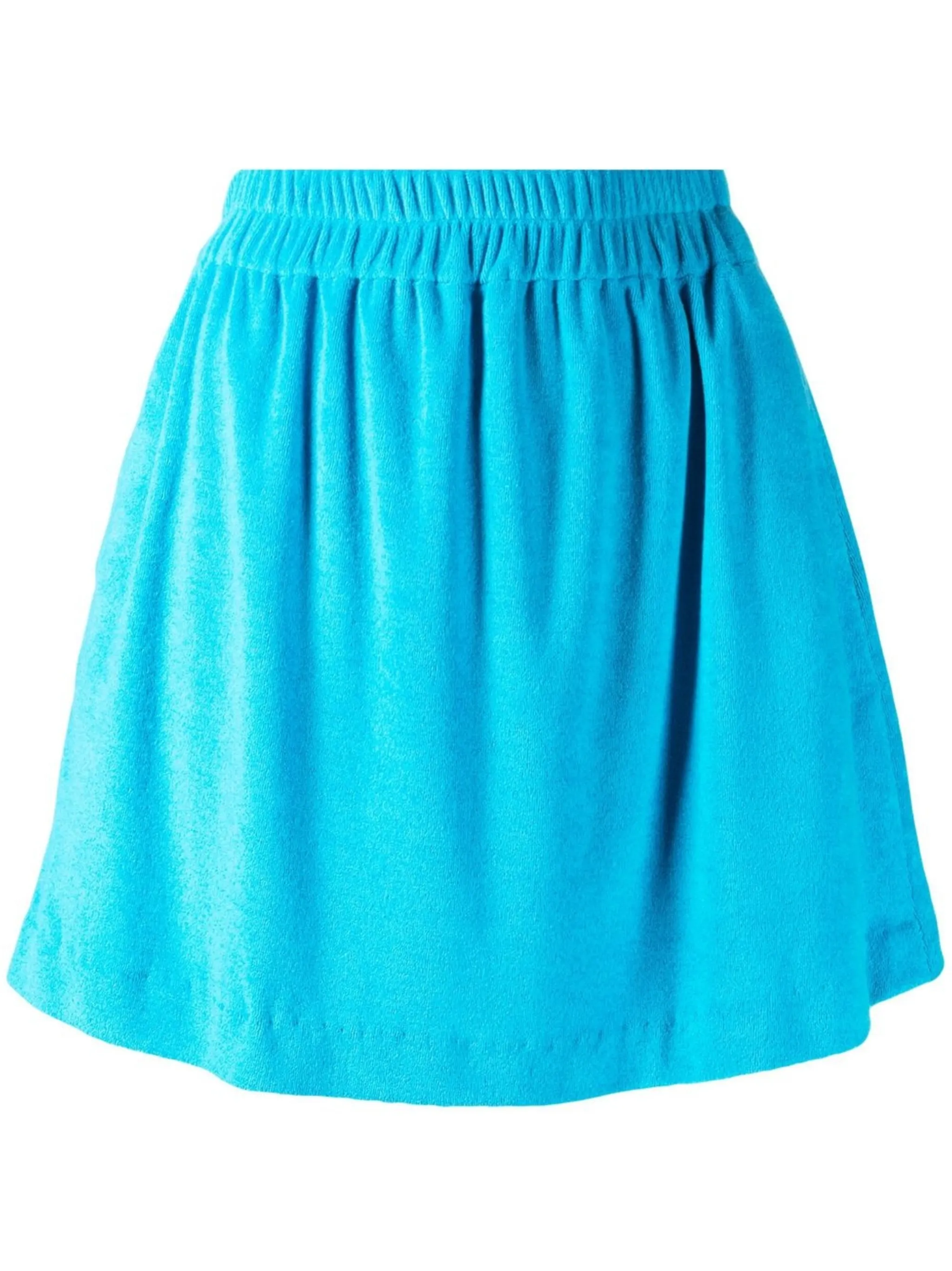 Синий, смесовый хлопок, махровый эффект, эластичный пояс, два прорезных кармана по бокам и прямой подол.