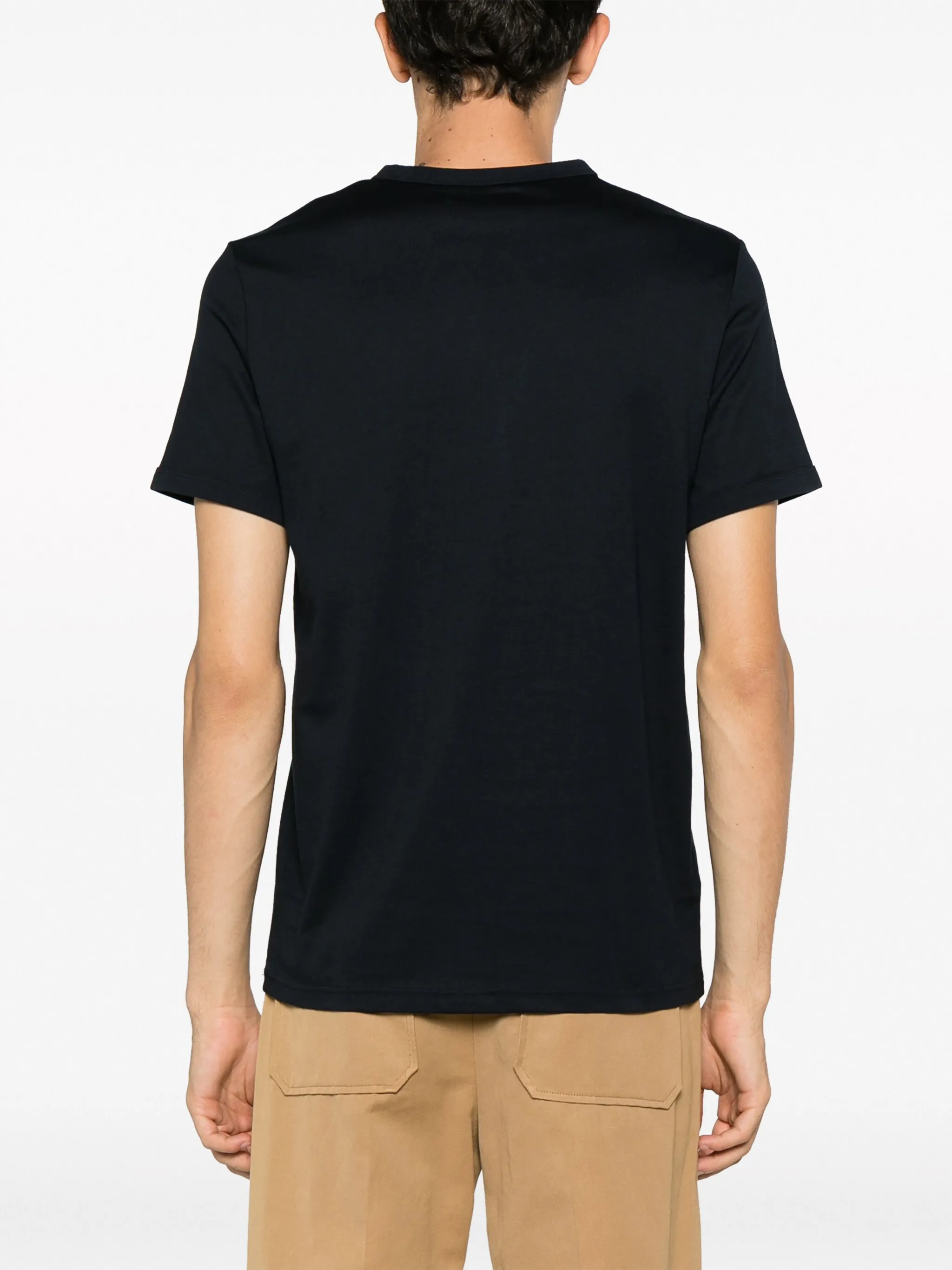 Темно-синий, белый, хлопок, ткань джерси, вышитый логотип на груди, круглый вырез, короткие рукава и прямой подол.
