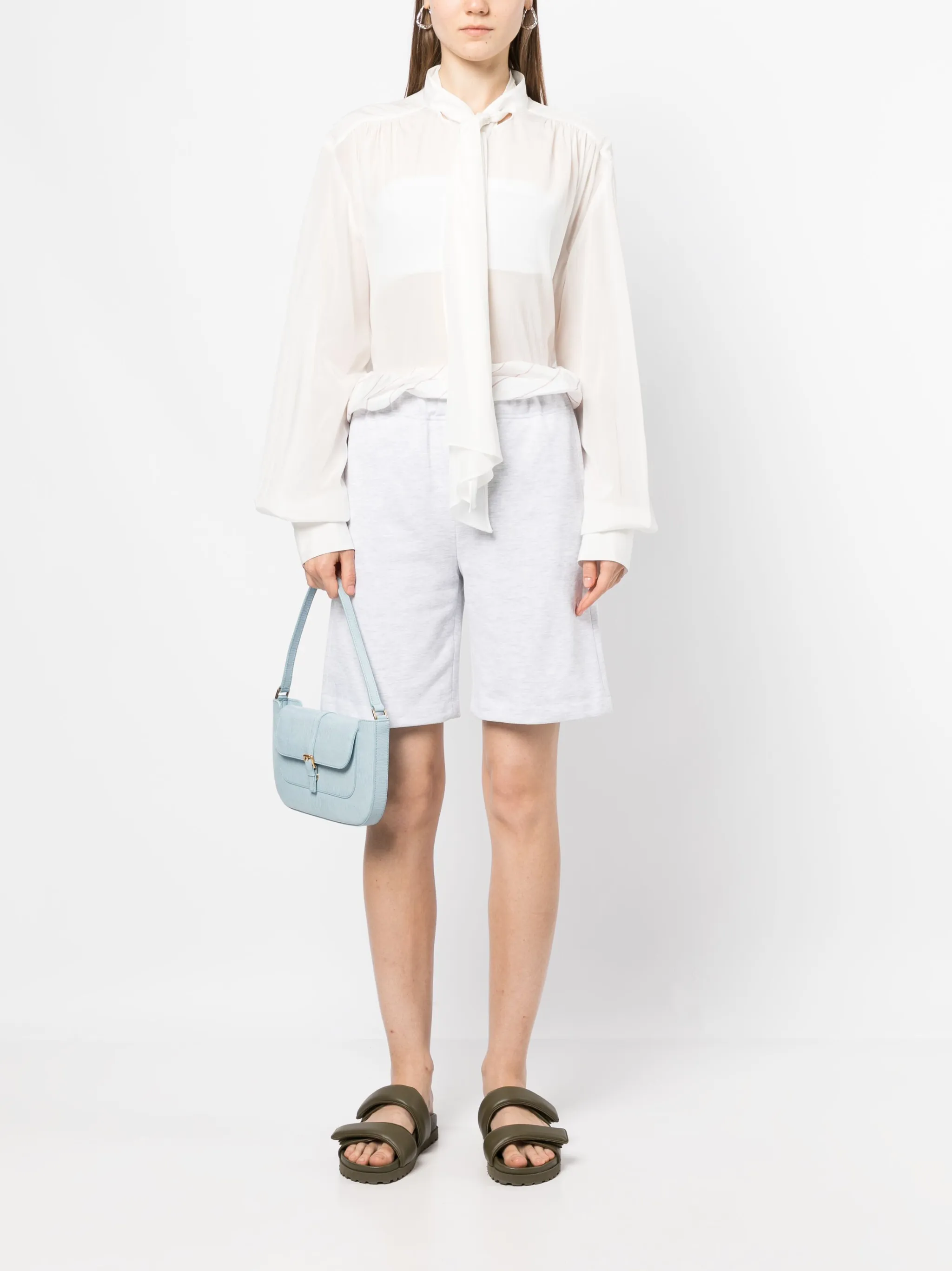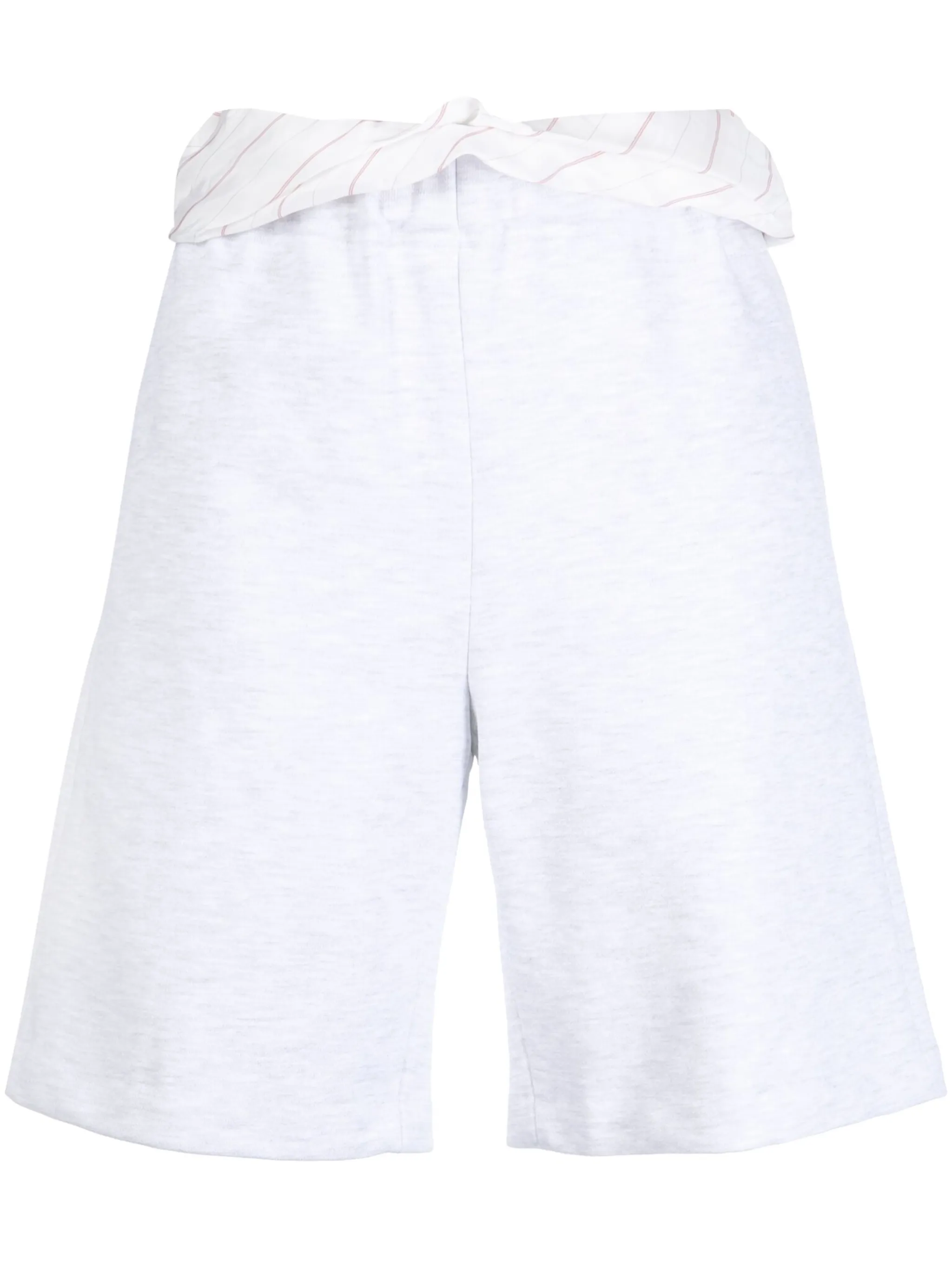 Светло-серый, хлопок, контрастный пояс, эластичный пояс, два прорезных кармана по бокам и длина выше колена.