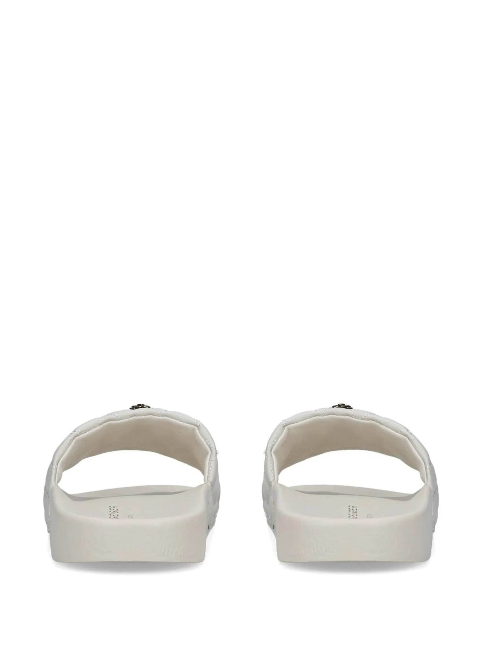 Белый, стеганая модель, аппликация, открытый носок, открытая спина, ремешок на палец, логотип на стельке, плоская резиновая подошва и модель без застежки.