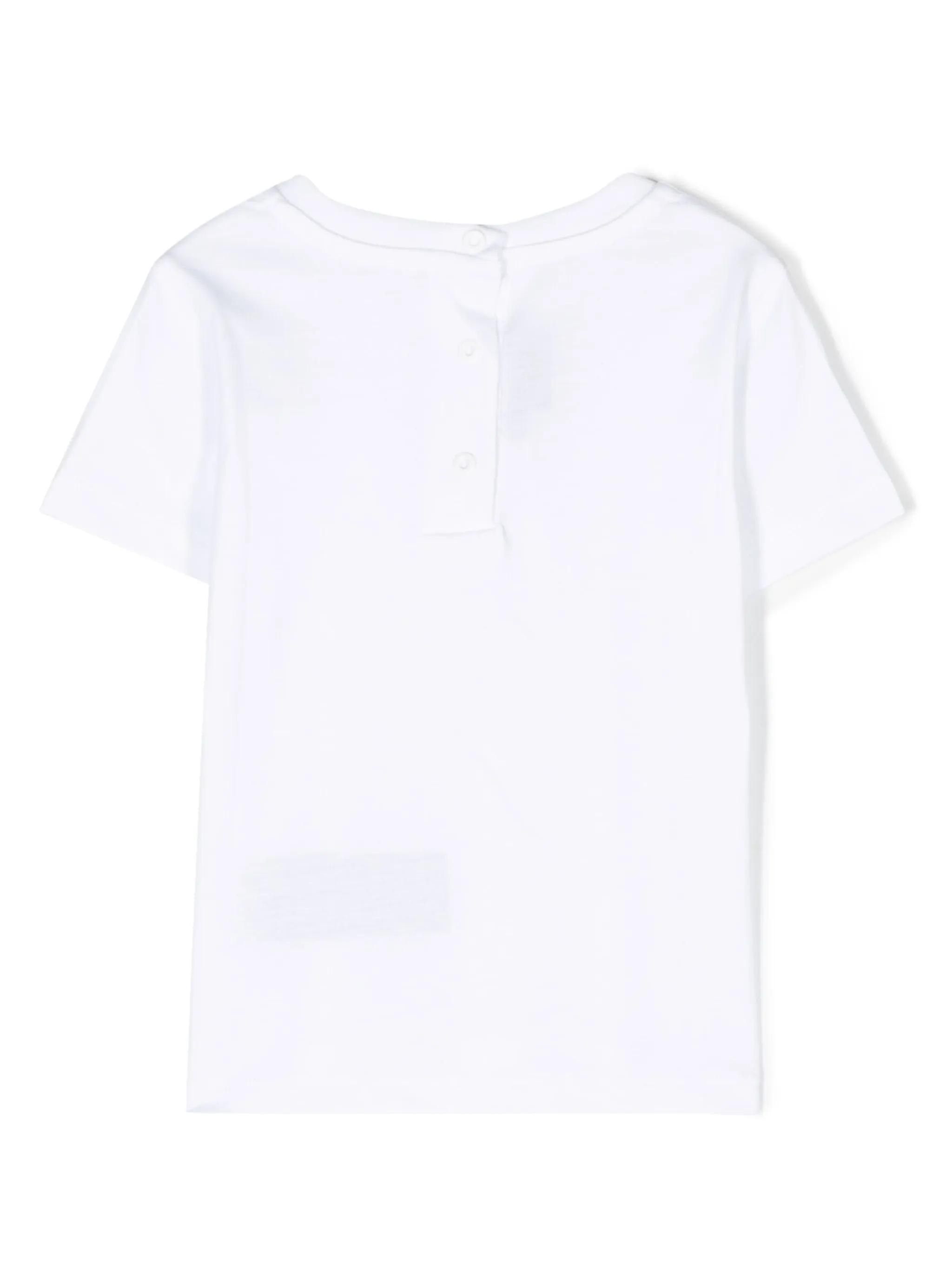 Белый, хлопок, объемный логотип, круглый вырез, застежка на кнопки сзади, короткие рукава и прямой подол.