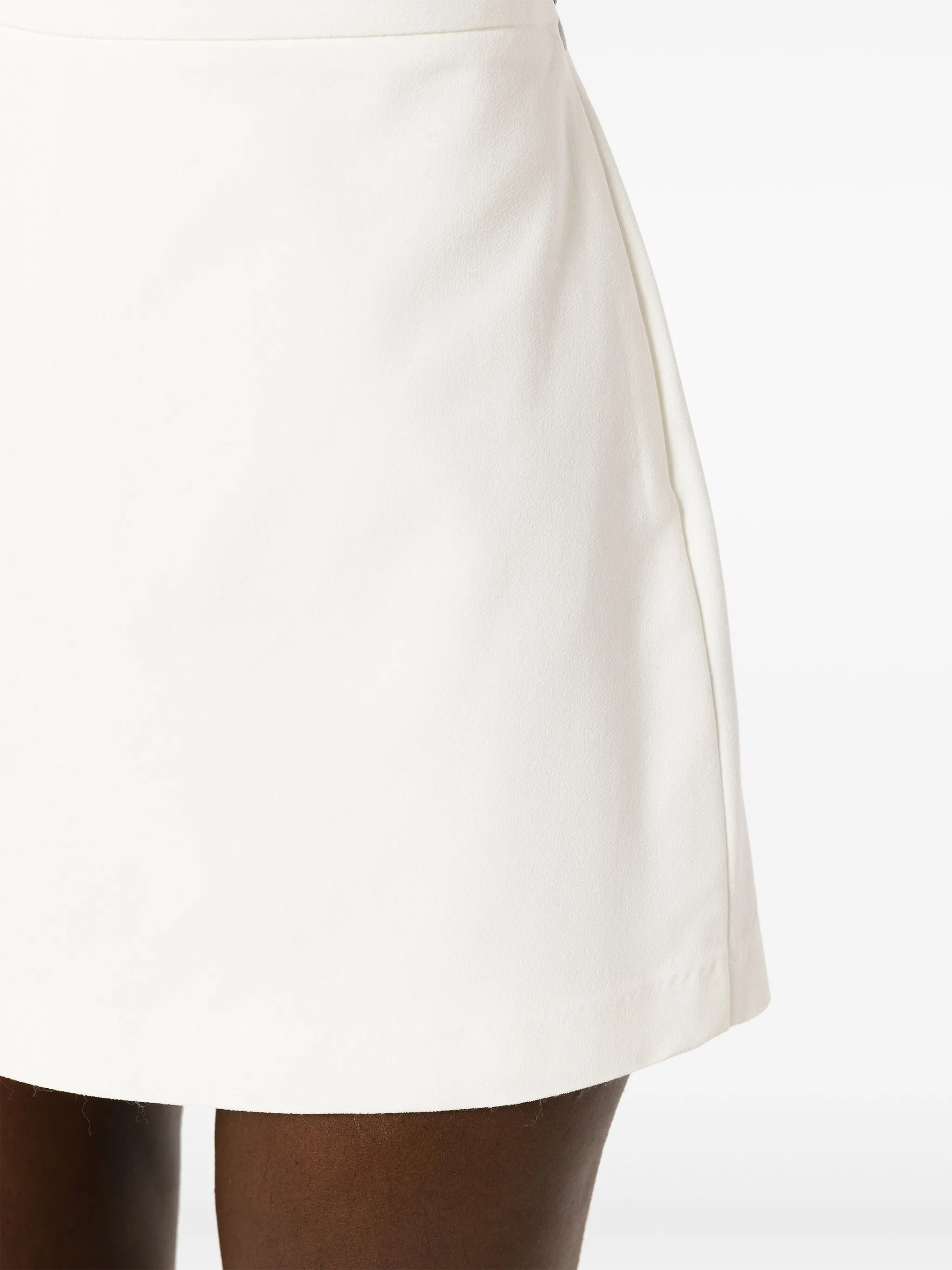 Кремовый, креповая текстура, завышенная талия, два кармана с листочкой сзади, потайная застежка на молнии сбоку и длина до бедер.