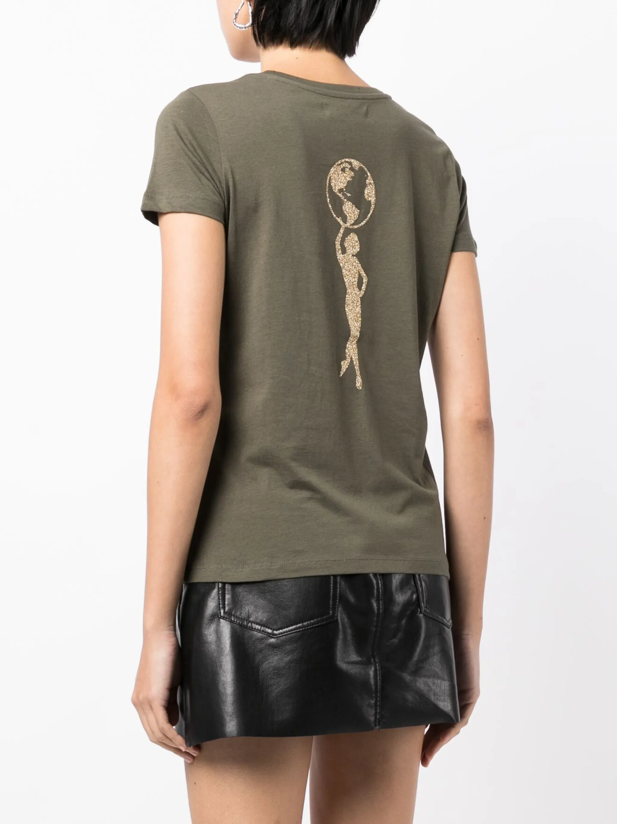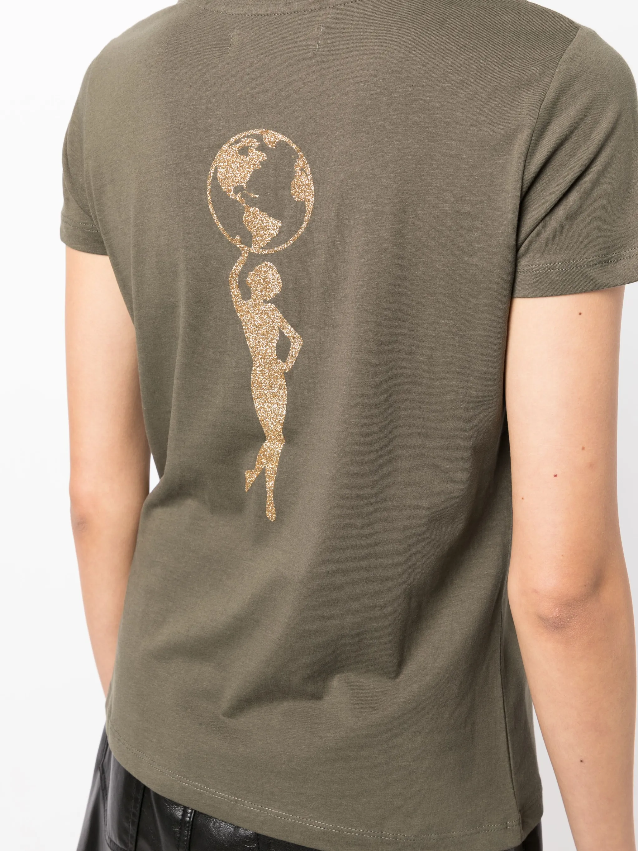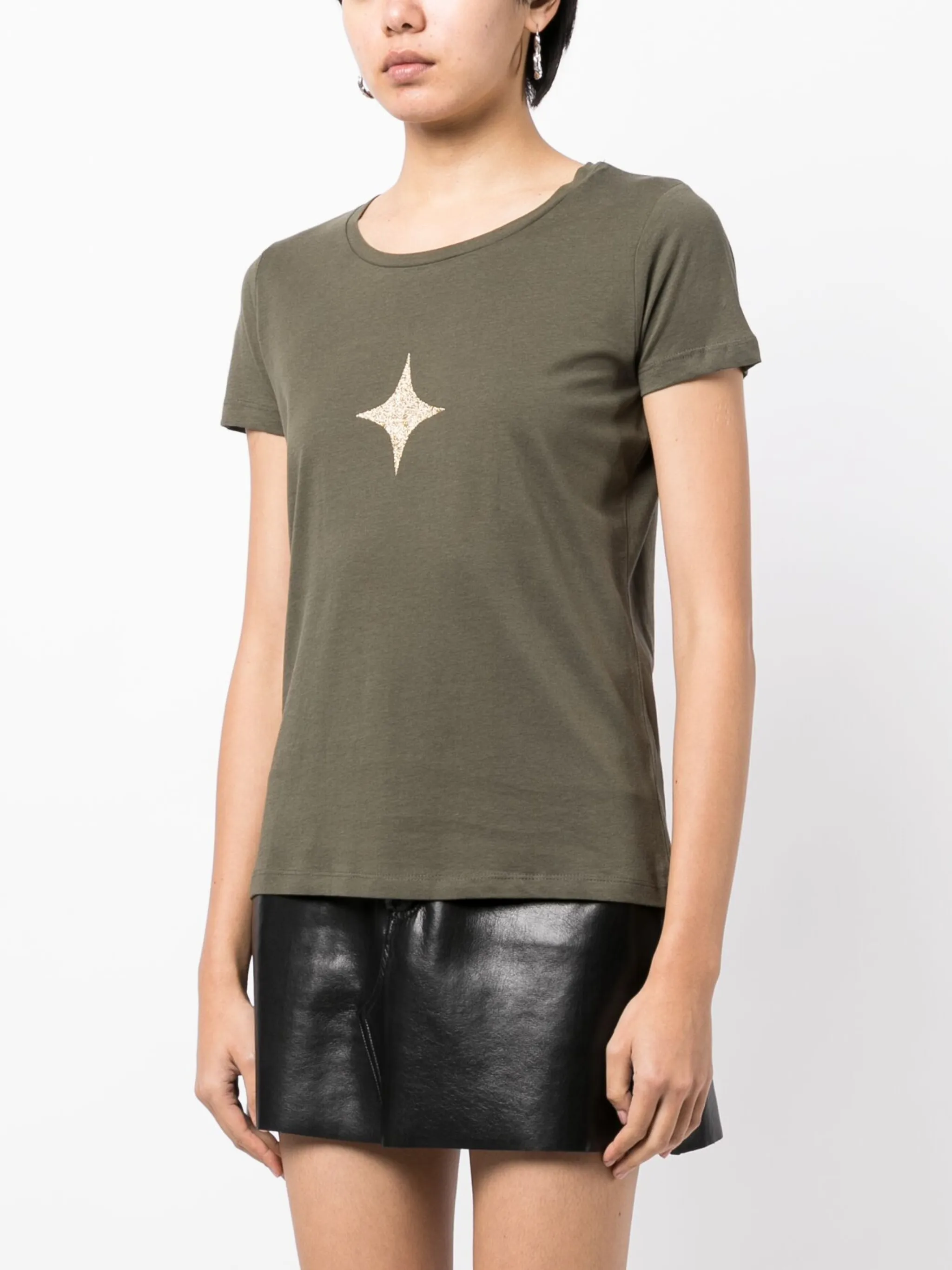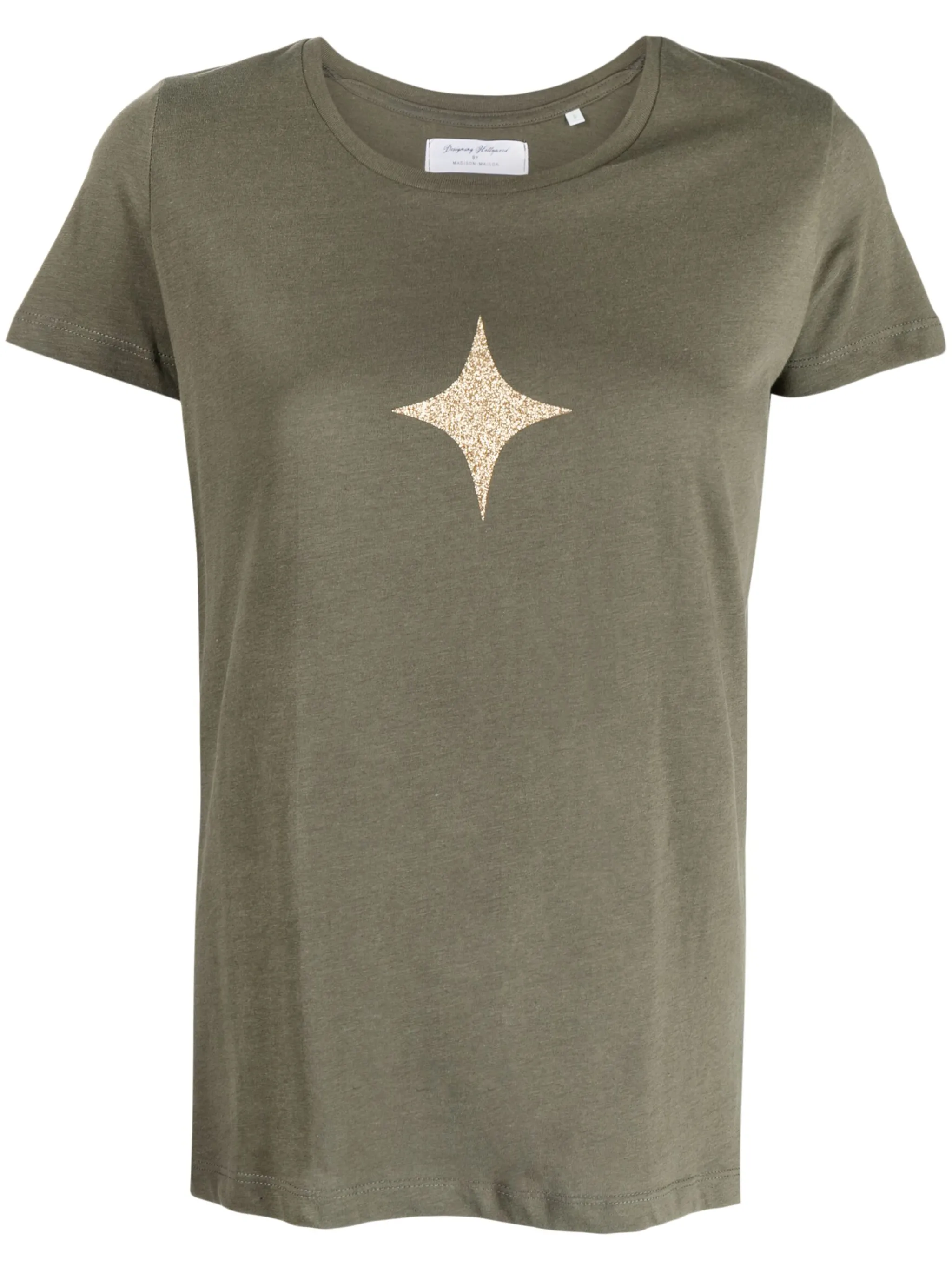 Хаки, хлопок, принт с изображением звезд, графичный принт на спине, блестящий материал, круглый вырез, короткие рукава и прямой подол.