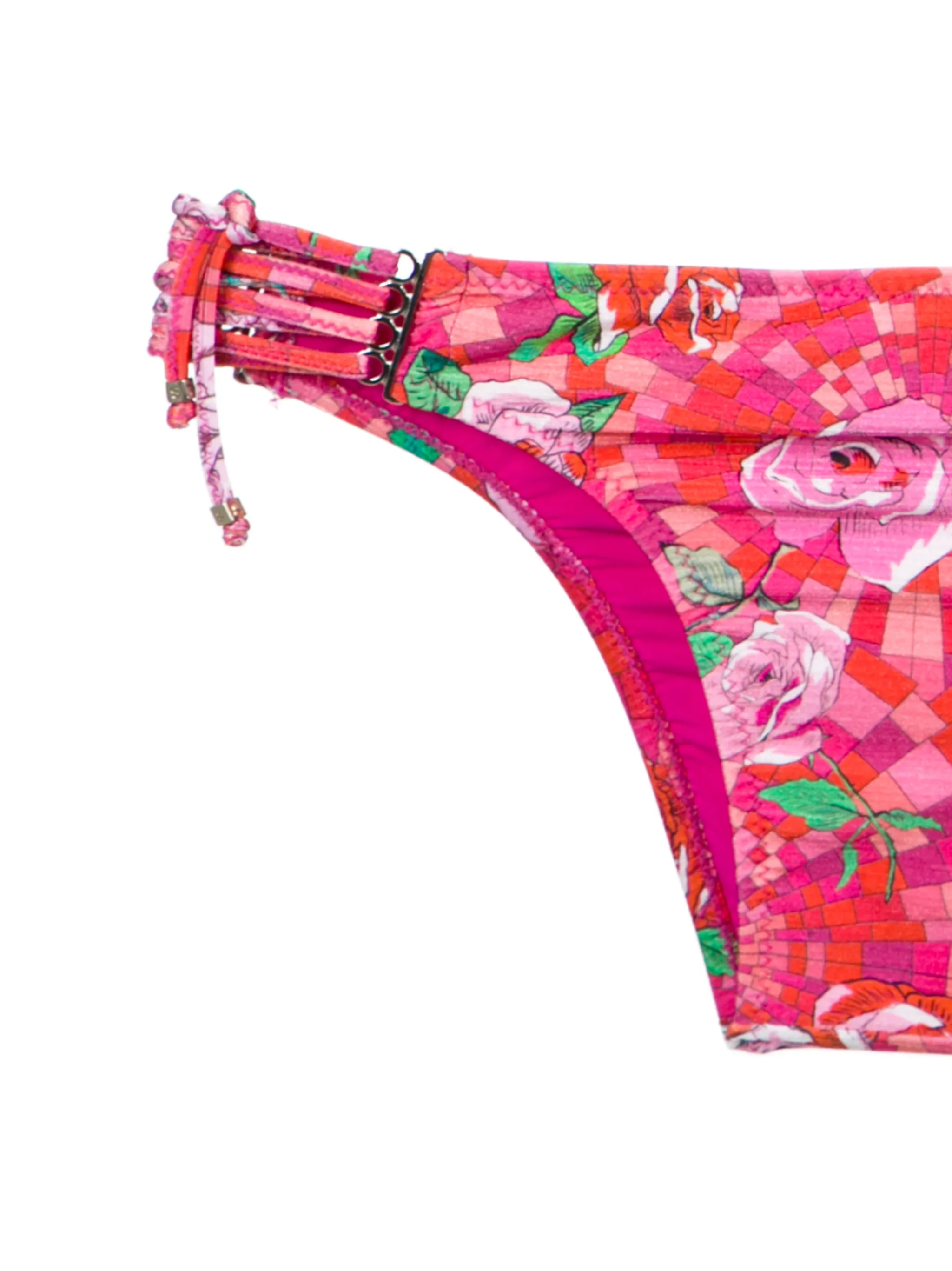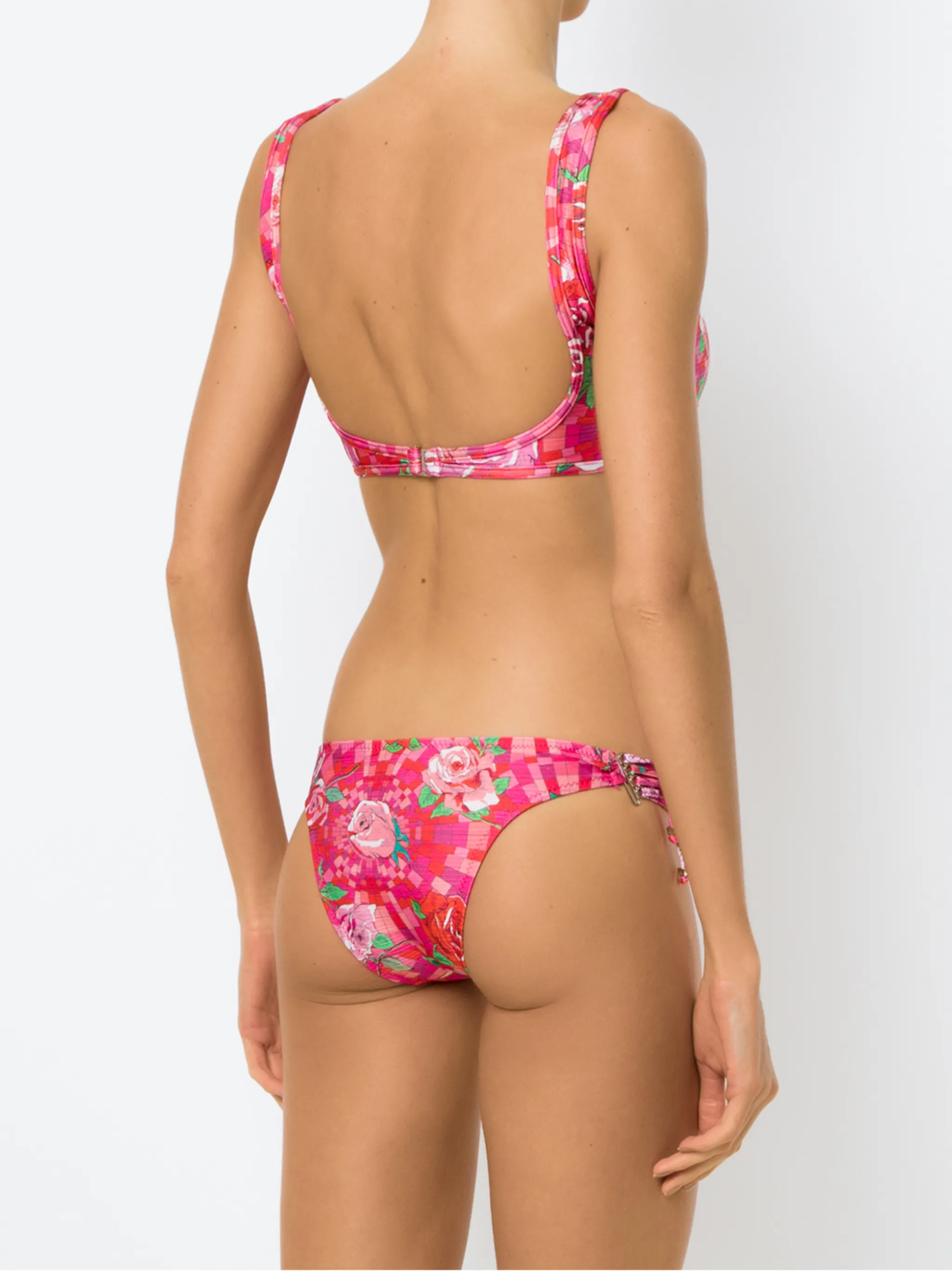 Розовое бикини с цветочным принтом от Amir Slama. Застежка на завязке сзади, сплошной узор, подкладка. Примерка купальников разрешена только поверх собственного нижнего белья.