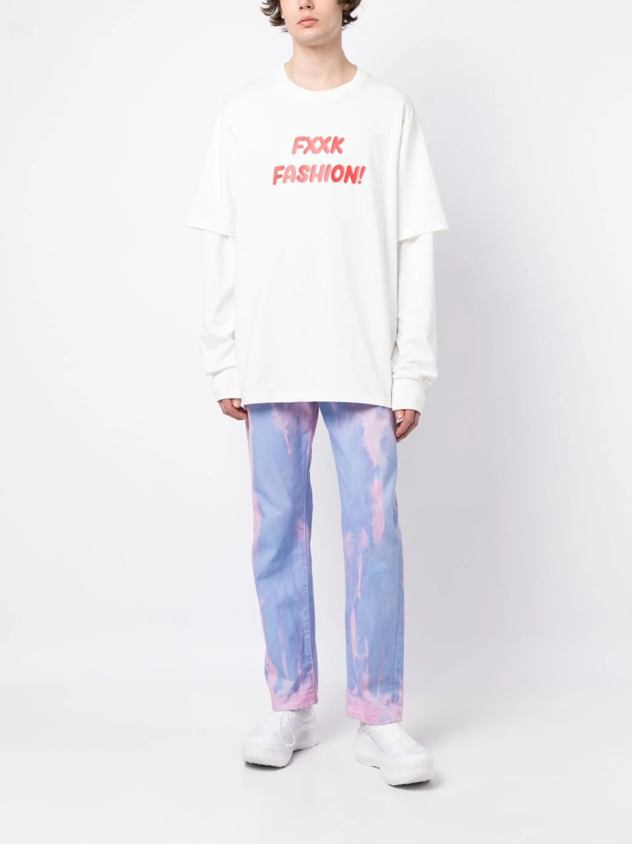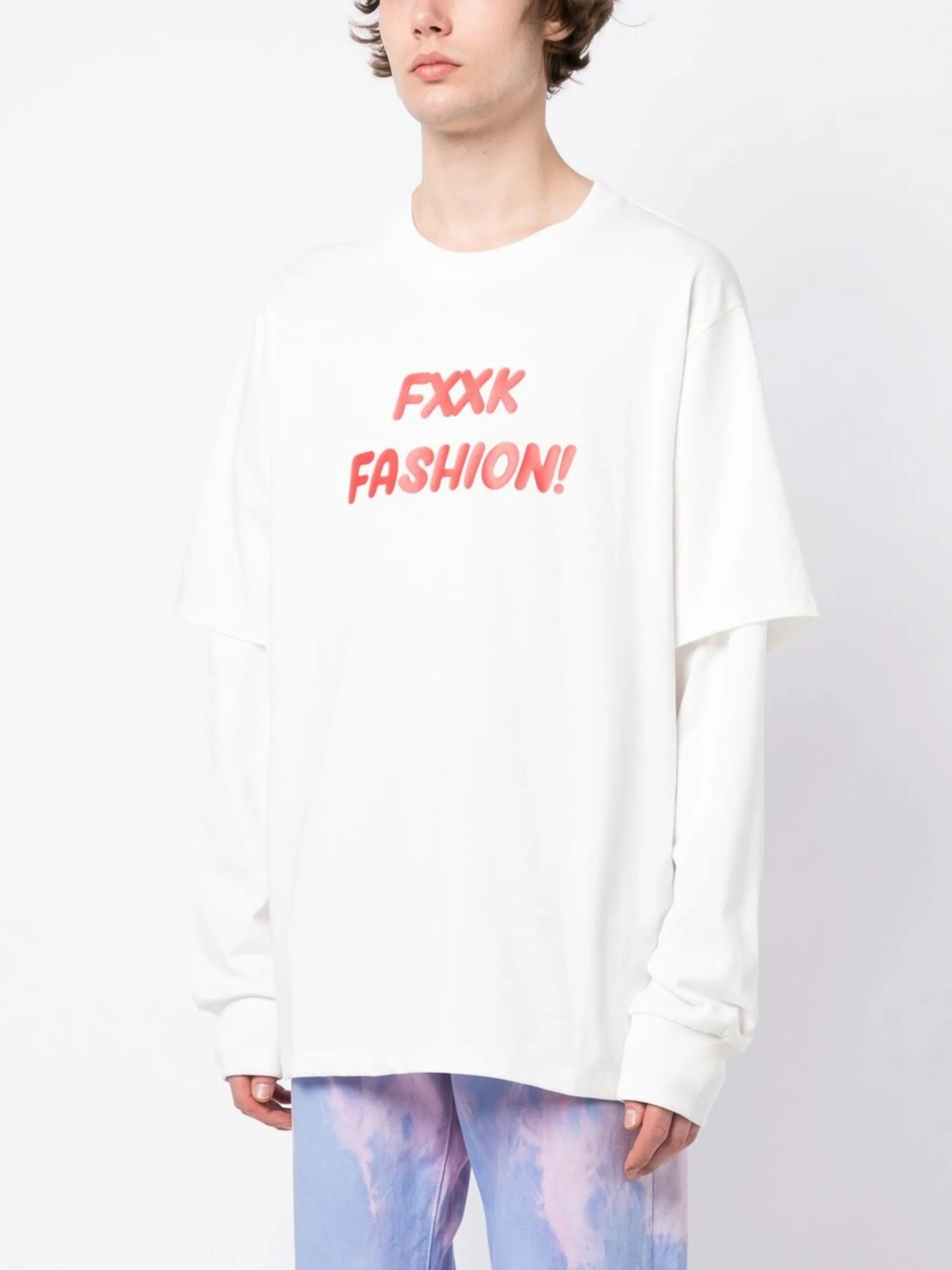 Кремовый, хлопок, ткань джерси, принт с надписью спереди, прямой подол, круглый вырез, двойные рукава и длинные рукава.