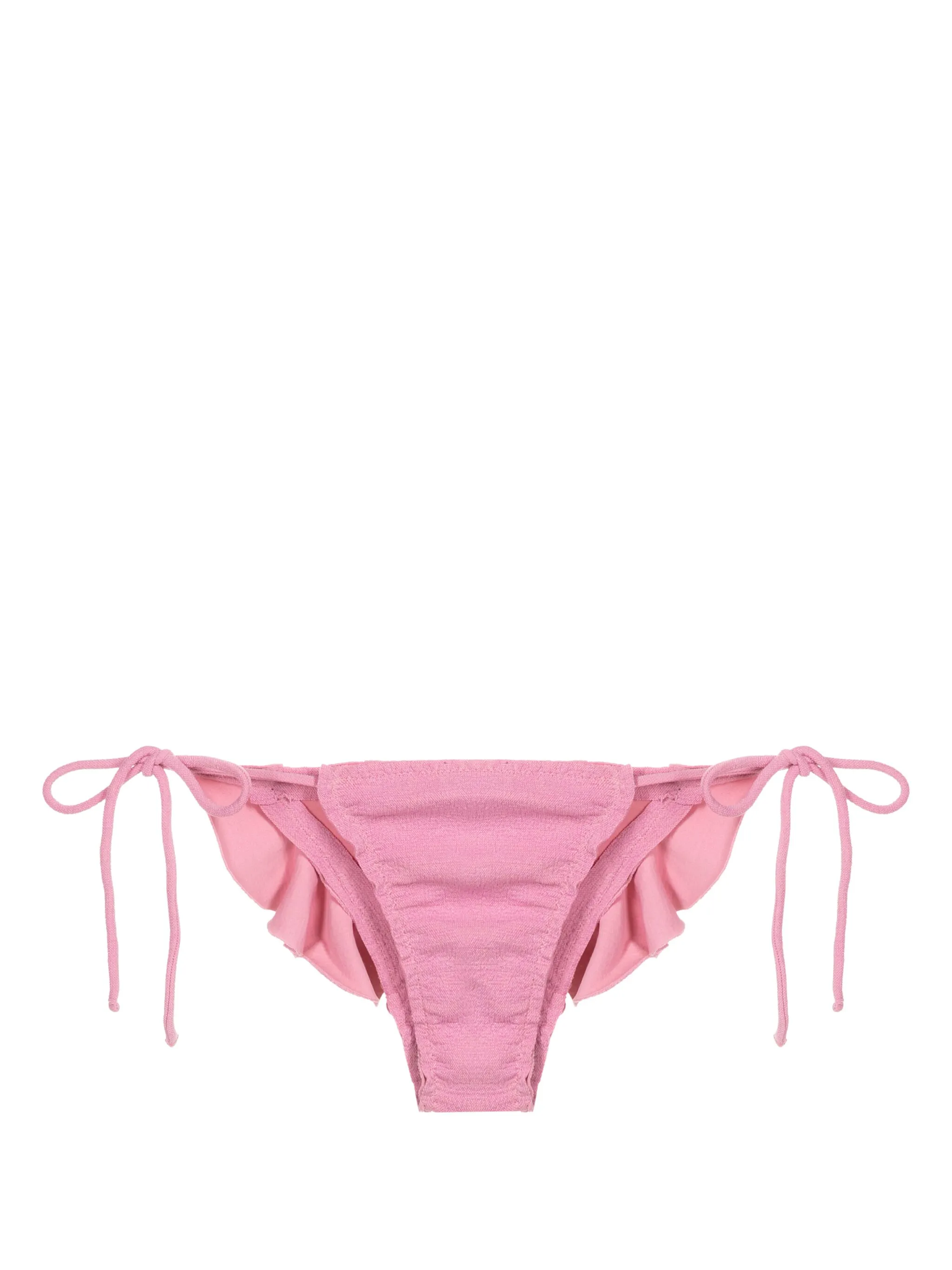 Розовый, эластичный материал, средняя посадка, плавки бикини с завязками по бокам, подол с оборками и регулируемый дизайн.